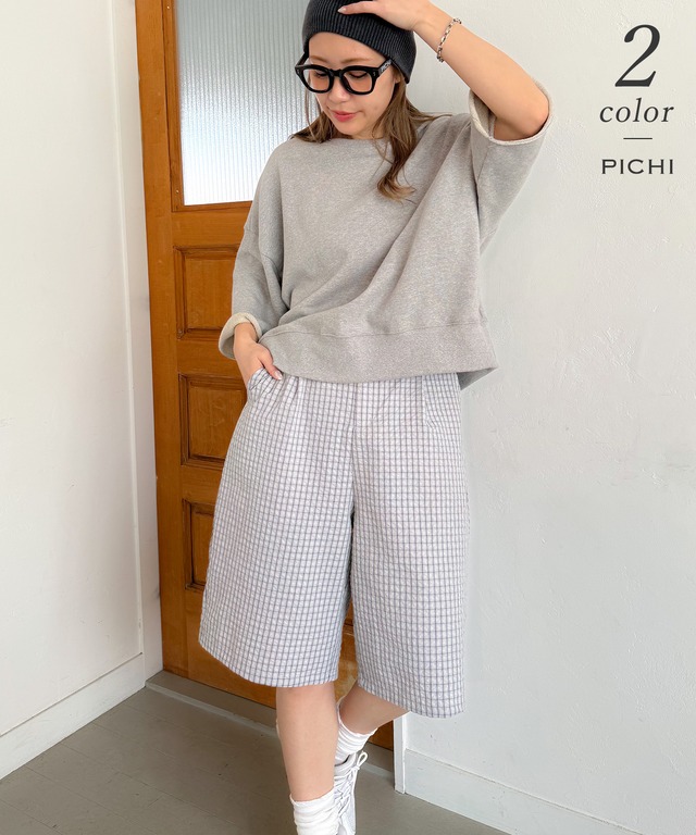 凹凸感のあるサッカー生地で仕立てた、軽やかなチェック柄ハーフパンツ。 さらっとした肌離れの良い素材感で、暑い季節も快適に着用いただけます。程よくゆとりのあるシルエットと膝丈バランスが、ラフになりすぎず大人っぽい印象に。細かなチェック柄がコーデにさりげないアクセントをプラスしてくれます。 フロントにはタック入りで、腰まわりに程よいゆとりをプラス。広がりすぎない絶妙なシルエットで、大人カジュアルに取り入れやすい一本です。 ーstyleー ロゴTやシンプルなロンTをさらっと合わせるだけで、抜け感のある大人カジュアルコーデに。 スウェットやオーバートップスと合わせてラフにまとめるのもおすすめです。 タンクトップ合わせでヘルシーに着こなすのも可愛く、夏らしい軽やかなスタイリングが完成します。 ■サイズ展開:FREE <平置き実寸(cm)>着丈64 ウエスト33 伸ばして40 ヒップ54 もも幅35 股下29 ※物により多少の誤差がある場合もございます事をご了承の上、ご購入をお願い致します。 ■伸縮性:なし ■透け感:ほぼなし ■裏地:アイボリーのみあり ■素材:ポリエステル65% 綿35% ■生産国:中国 ■お手入れ方法:手洗い可。洗濯表示タグをご確認ください。 ■ご確認ください■ 配送番号をご希望の場合は、備考欄に「配送番号希望」とご記載くださいませ。 (dp3964)