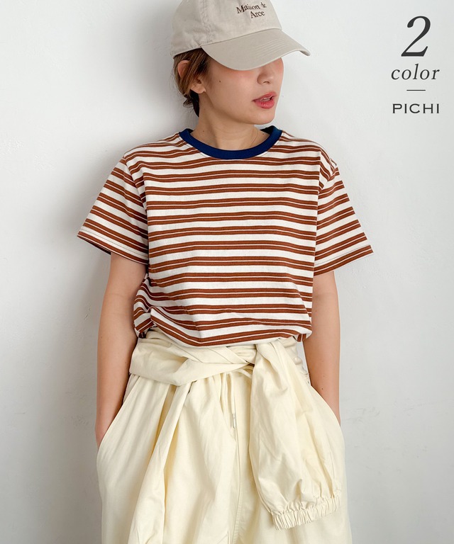 ネック部分の配色パイピングがポイントのボーダーTシャツ。 シンプルな中にさりげない可愛さがあり、程よいピッチのボーダー柄が、カジュアルすぎず大人っぽい印象に仕上げてくれます。コンパクトなサイズ感でボトムを選ばず合わせやすく、インでもアウトでもバランスよく着用可能。伸縮性のある柔らかな生地感で、フィットしすぎず着心地も◎デイリー使いしやすく、つい手に取りたくなる一枚です。 ーstyleー ワイドパンツやデニムパンツ合わせでカジュアルにまとめたり、キャップやビーニーをプラスしてラフなスタイリングもおすすめ。 コンパクトなシルエットなので、ボリュームのあるボトムとも相性がよく、シンプルなコーデでもこなれた印象に仕上がります。 一枚ではもちろん、シャツやジャケット、サロペットのインナーとしても使いやすく、春~秋と長く楽しめるアイテムです。 ■サイズ(平置き実寸cm)着丈52 身幅48 肩幅42 袖丈18 ※物により多少の誤差がある場合もございます事をご了承の上、ご購入をお願い致します。 ■伸縮性:あり ■透け感:なし ■裏地:なし ■素材:綿100% ■生産国:韓国 ■お手入れ方法:手洗い可 ■ご確認ください■ 配送番号をご希望の場合は、備考欄に「配送番号希望」とご記載くださいませ。