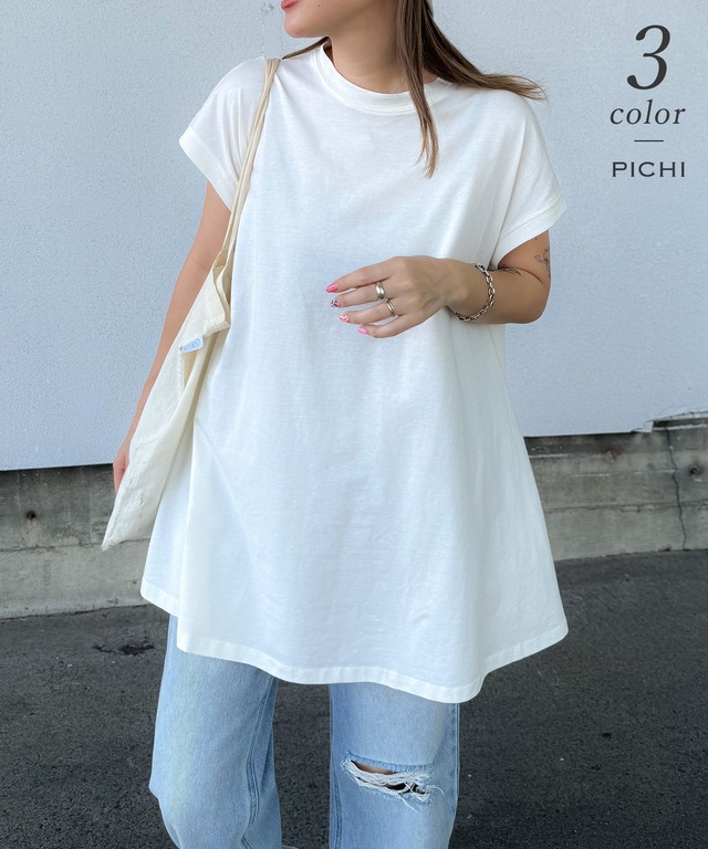 背中のPICHIタグがさりげなく映えるロングTシャツ。 裾に向かって広がるAラインシルエットで、体型カバーも叶えつつ女性らしい印象に。ヒップまでしっかり隠れる長めの丈は、レギンスやスキニー合わせにも◎首元はつまり気味のクルーネックで、大人っぽく上品に着こなせます。カラーはベーシックに使えるホワイト、チャコール、ブラックの3色展開です。 ーstyleー 細身のパンツと合わせてメリハリある大人カジュアルに。 タイトなロングスカートでゆるっとまとめればリラクシーな雰囲気に。 ショートボトムと合わせて、Aラインのシルエットを引き立てた夏コーデも◎ ■素材:綿100% ■サイズ:FREE <平置き実寸(cm)>着丈76 身幅(脇下)56 裄丈31 袖口幅20 ※物により多少の誤差がある場合もございます事をご了承の上、ご購入をお 願い致します。 ■伸縮性:あり ■透け感:あり ■裏地:なし ■お手入れ:手洗い可 ■ご確認ください■ 配送番号をご希望の場合は、備考欄に「配送番号希望」とご記載くださいませ。