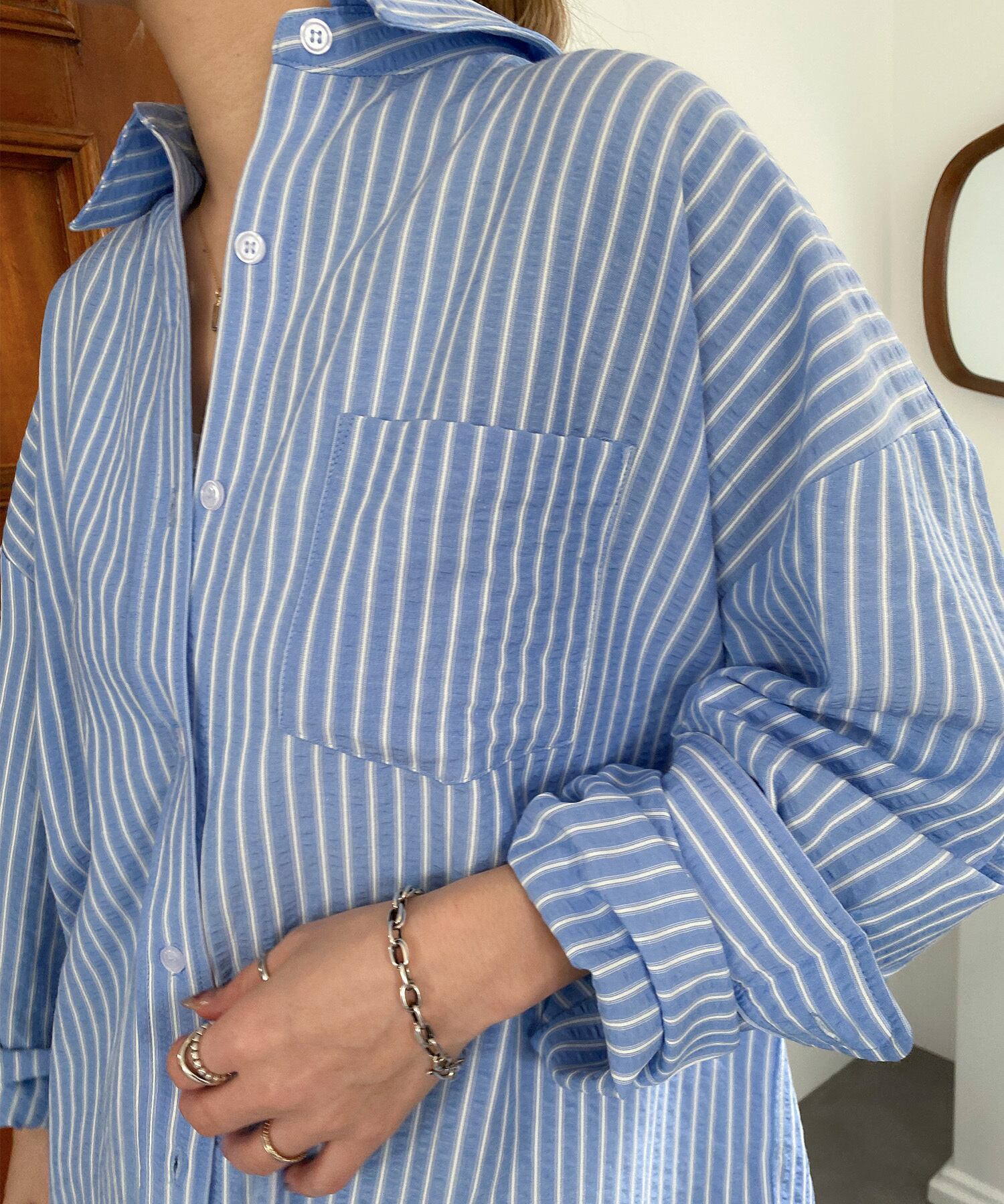 表情豊かなシボ感のあるサッカー生地で、とても柔らかく軽い着心地。シワが気にならず、ノンアイロンで着用いただけます。前後差のある丈でヒップまですっぽりと覆うゆったりサイズが体型カバーに。ネック部分はあえてタグを見せることで、他と差がつくデザインに仕上がりました。夏の日除け対策としてもおすすめです。