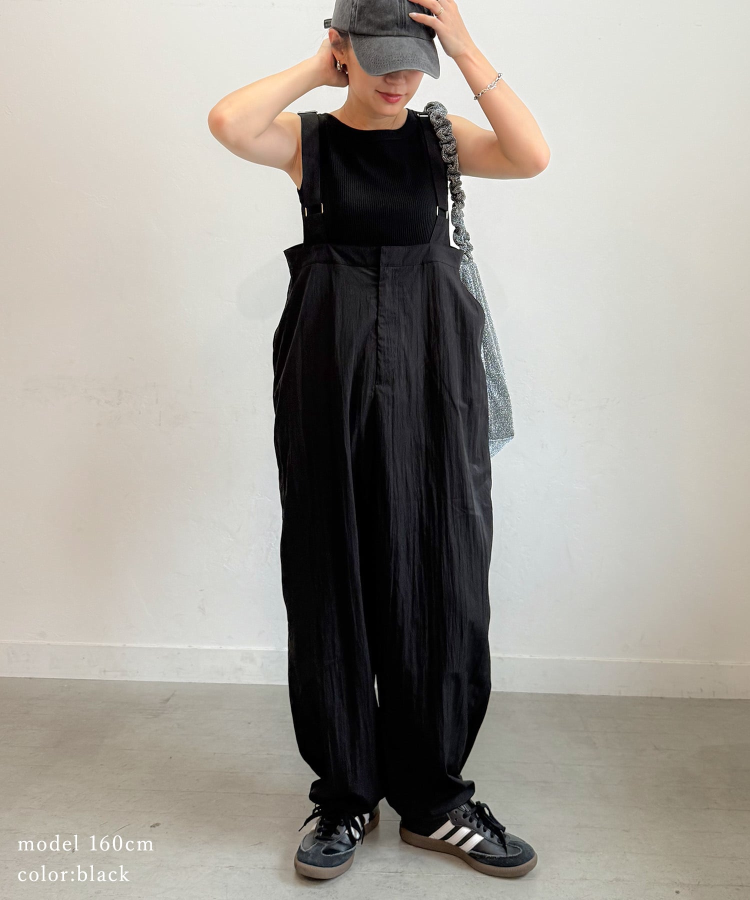 ワッシャー加工を施し、程よいハリとシワのある軽やかな質感です。シャカシャカとした風合いが夏でも涼しげに着用でき、秋口からはハイネックやニットなど、素材のコントラストをつけたコーディネートもおすすめ。レイヤード次第でさまざまなコーディネートを楽しめます。肩紐にアジャスターが付いているので、丈を調節できるのも嬉しいポイント。裾はドロスト仕様で好みに合わせて絞ることができます。