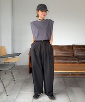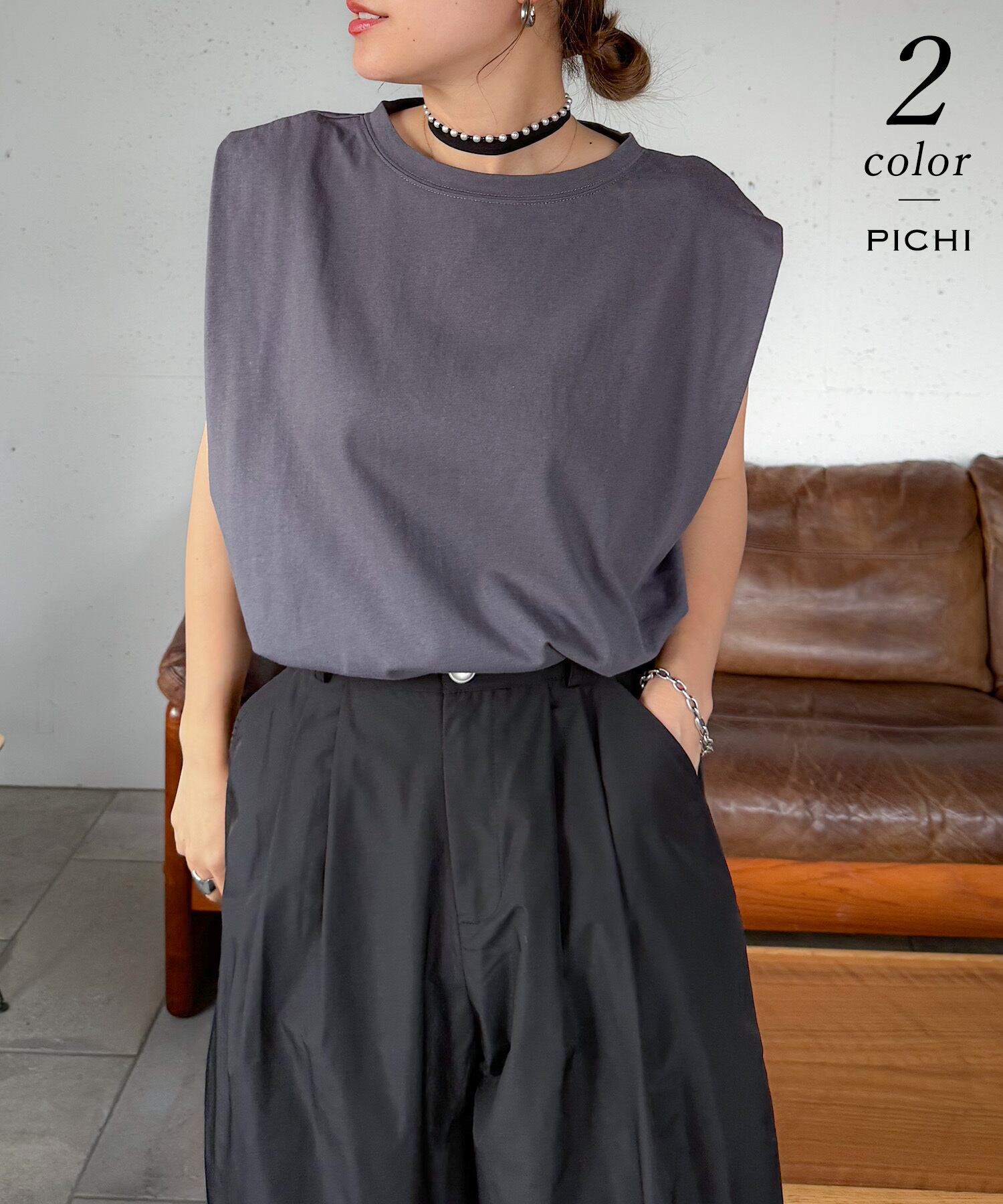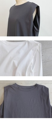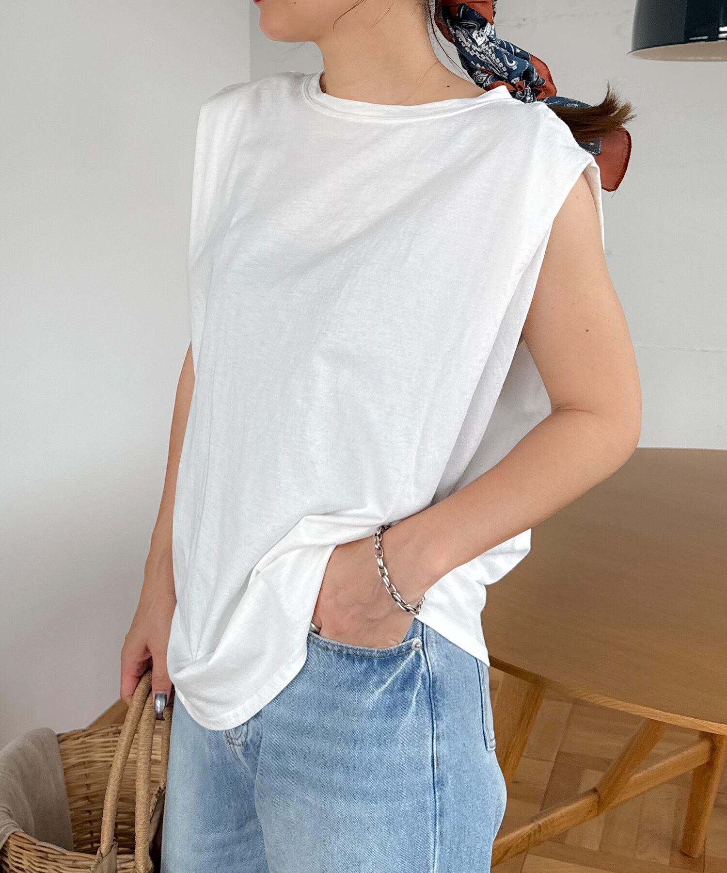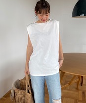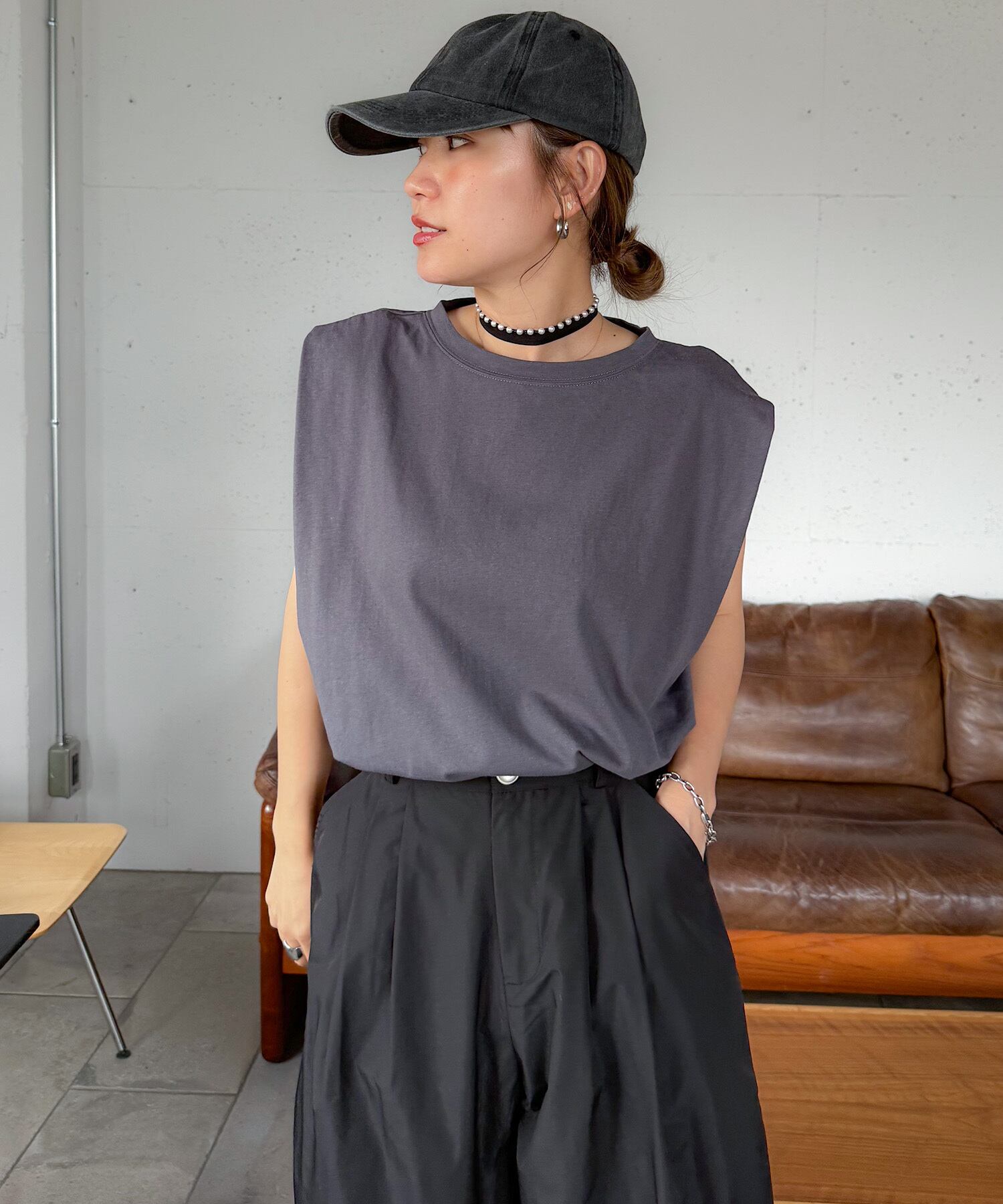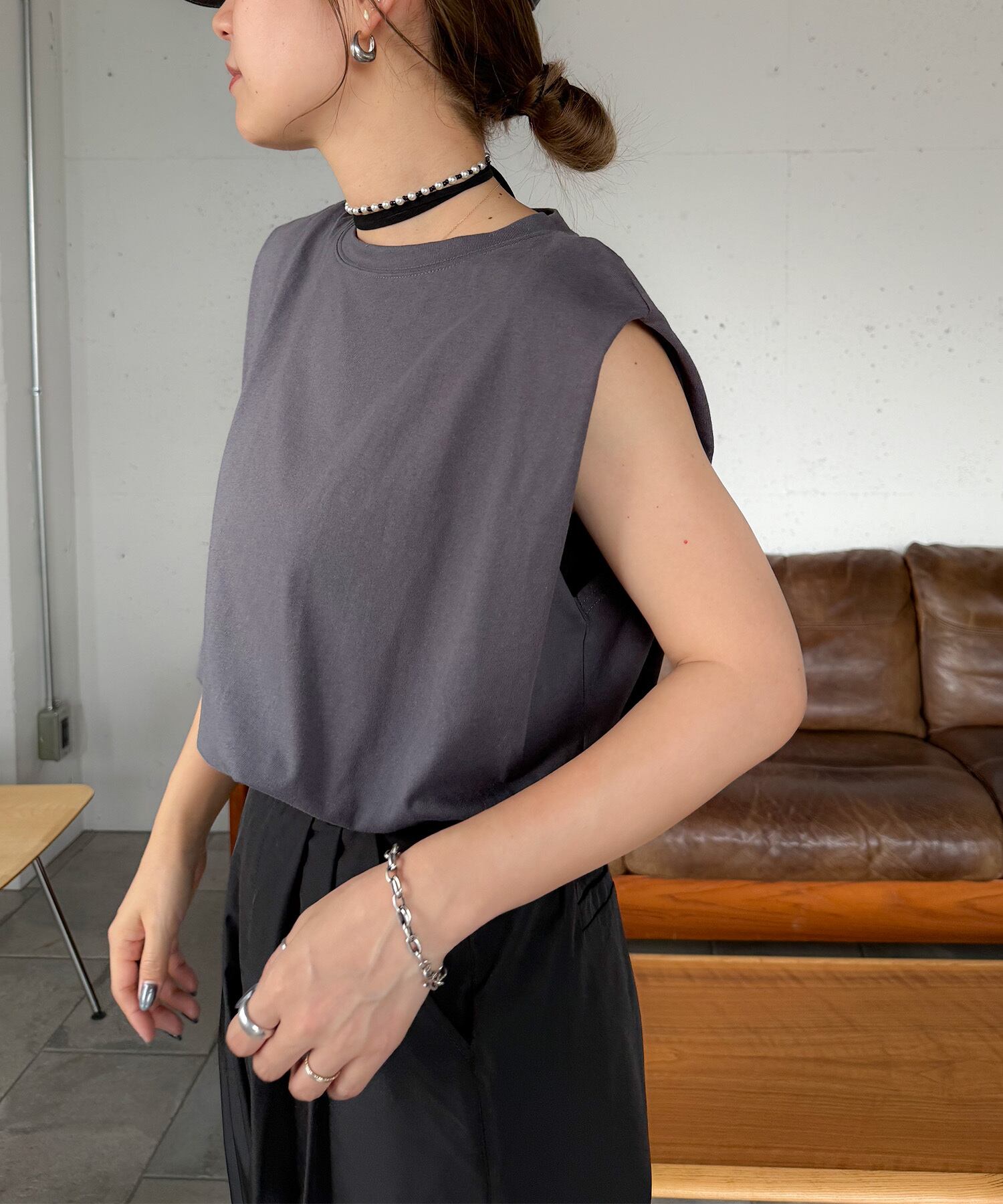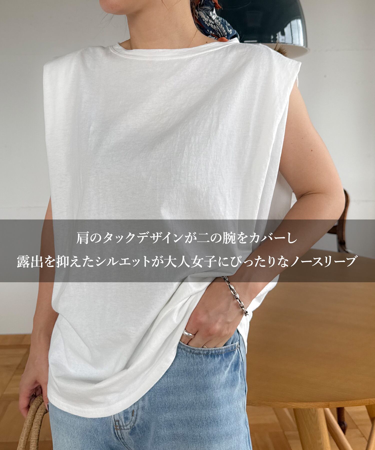 肩に入った立体的なタックが、シンプルながらも印象的なシルエットを演出。二の腕をカバーしつつ、露出を抑えすっきりと着こなせる大人女子におすすめのノースリーブです。丈がやや長めで、お尻が隠れるのも嬉しいポイント。着回し力は抜群で、毎日手に取りたくなる1枚です。