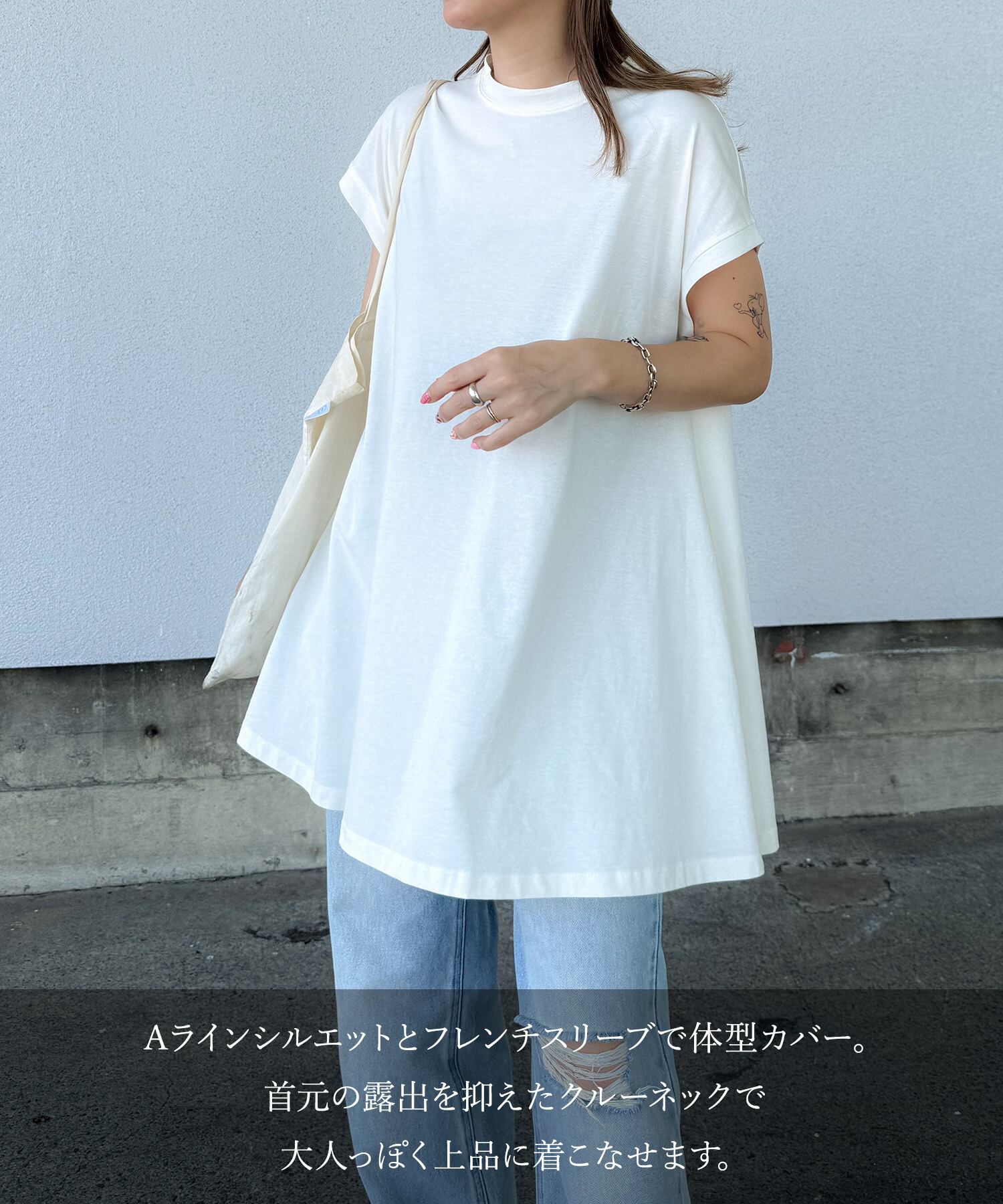 裾に向かって広がるAラインシルエットで、体型カバーも叶えつつ女性らしい印象に。ヒップまでしっかり隠れる長めの丈は、レギンスやスキニー合わせにも◎首元はつまり気味のクルーネックで、大人っぽく上品に着こなせます。カラーはベーシックに使えるホワイト、チャコール、ブラックの3色展開です。