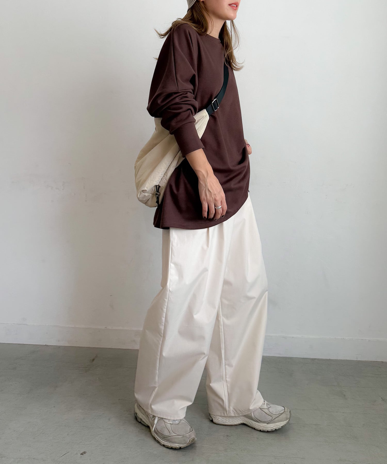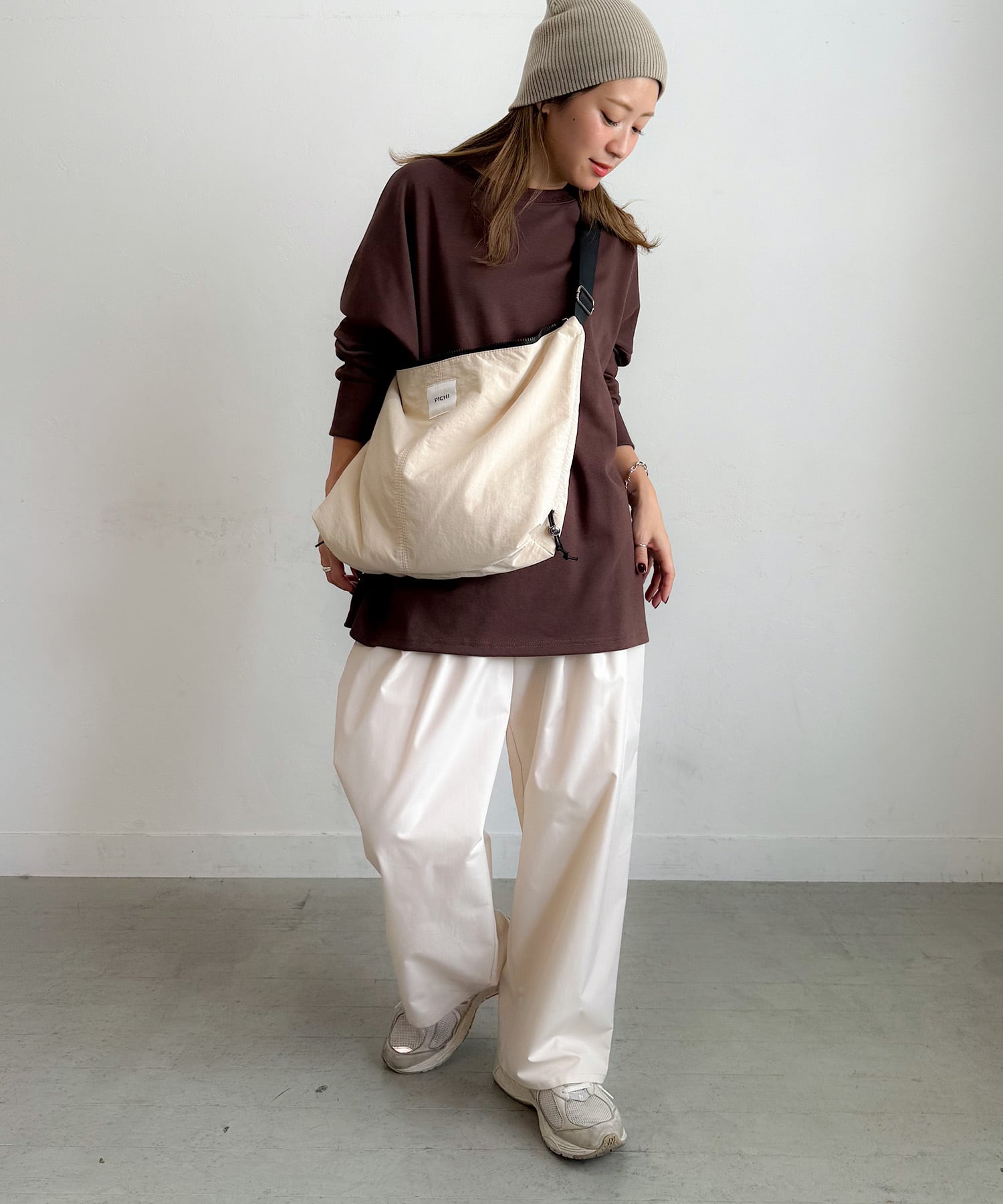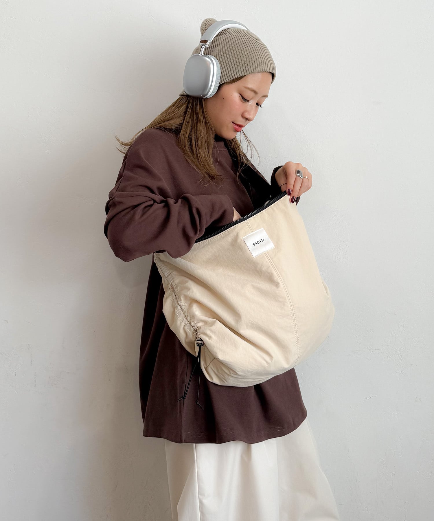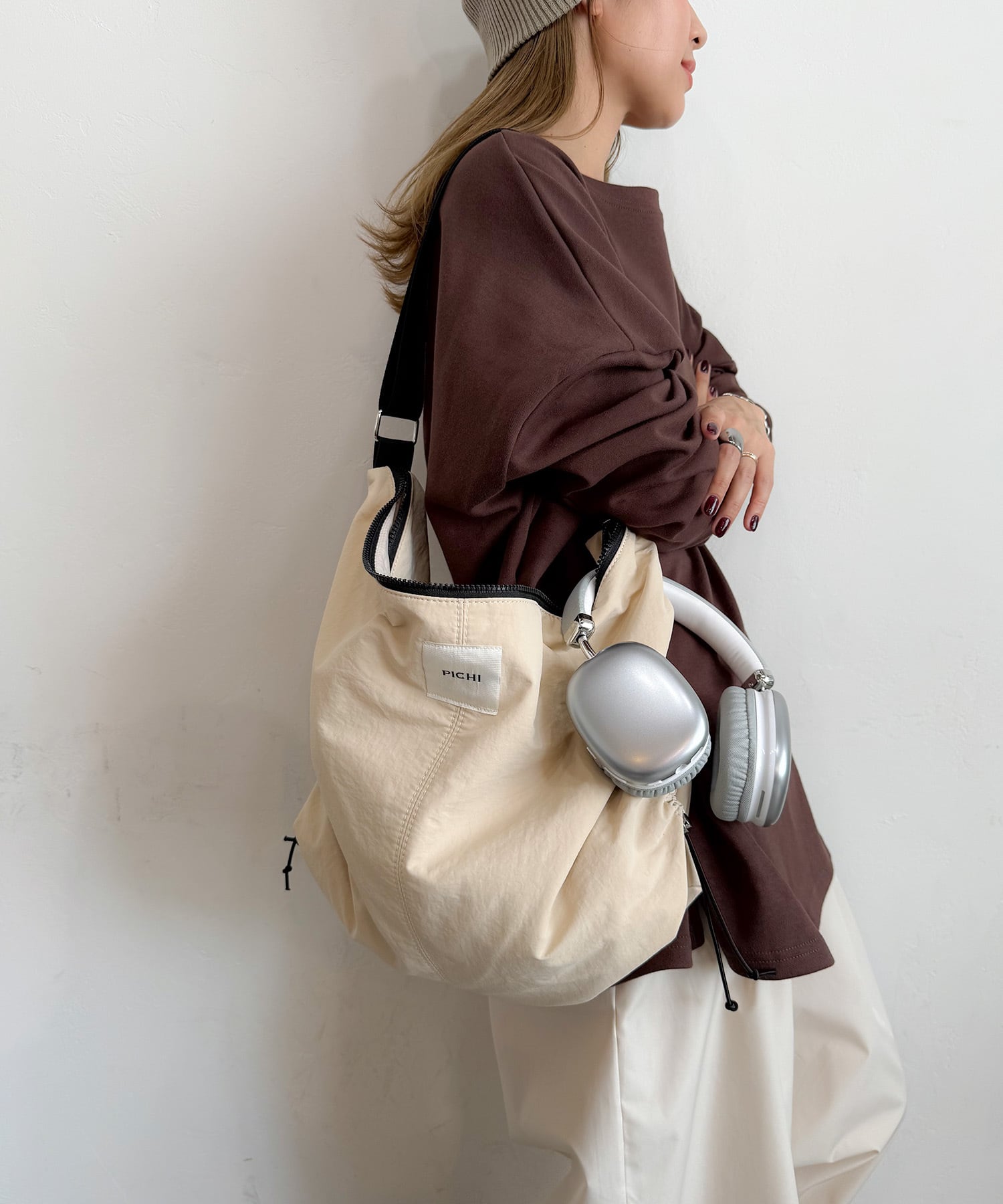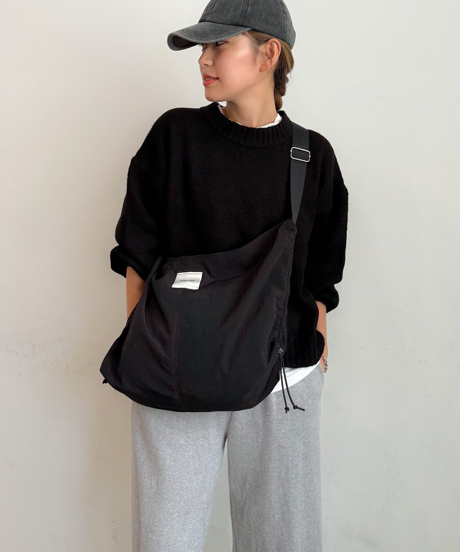 サイドにあしらったドローストリングでシルエットを自在にアレンジできるショルダーバッグ。