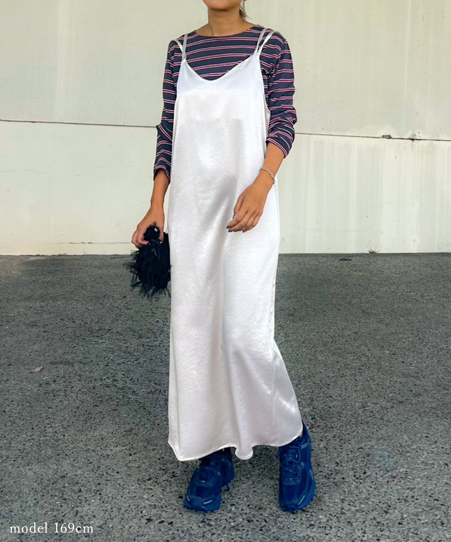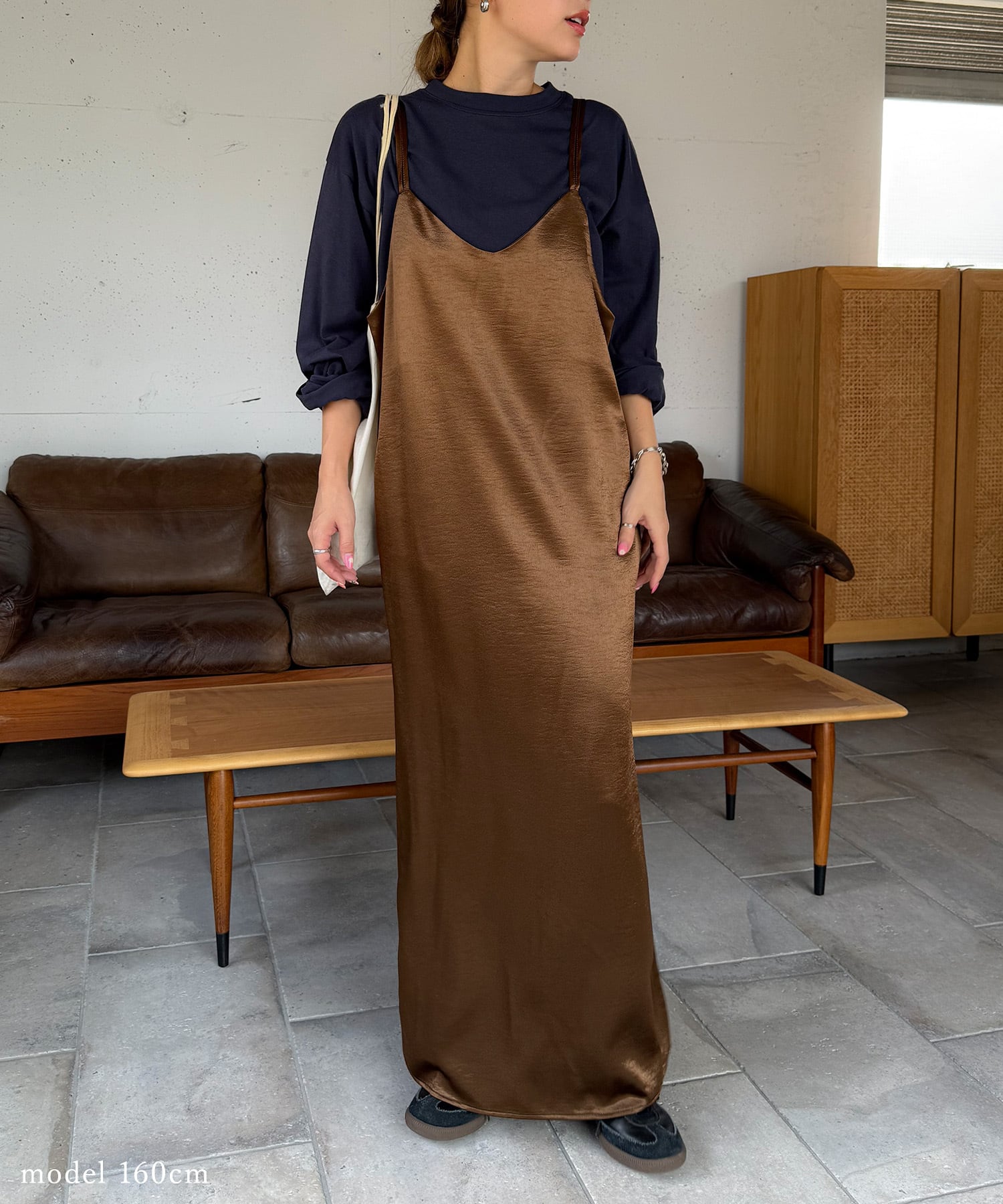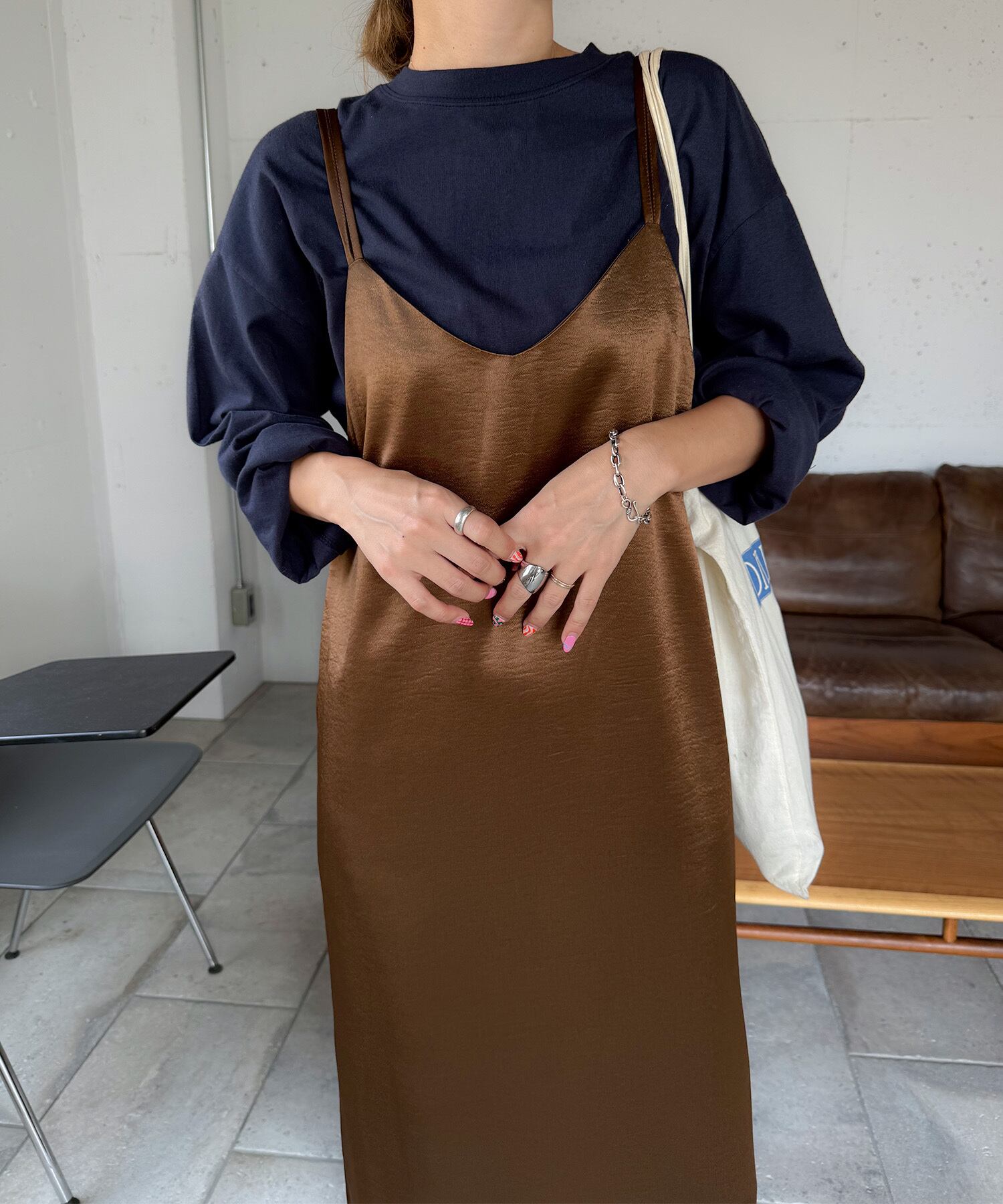 上品な光沢感が女性らしさを引き立てながらも、ゆるっとシルエットで体型を拾わずストレスフリーな着心地。肩紐は自分で結んで長さを調整できるデザインで、身長やスタイリングに合わせてアレンジが可能です。さらに後ろに深めのスリットが入っているので足さばきも軽やか◎ Tシャツやスニーカーと合わせてカジュアルダウンするのもおすすめ。シーンに合わせて着こなしを楽しめる一枚です。