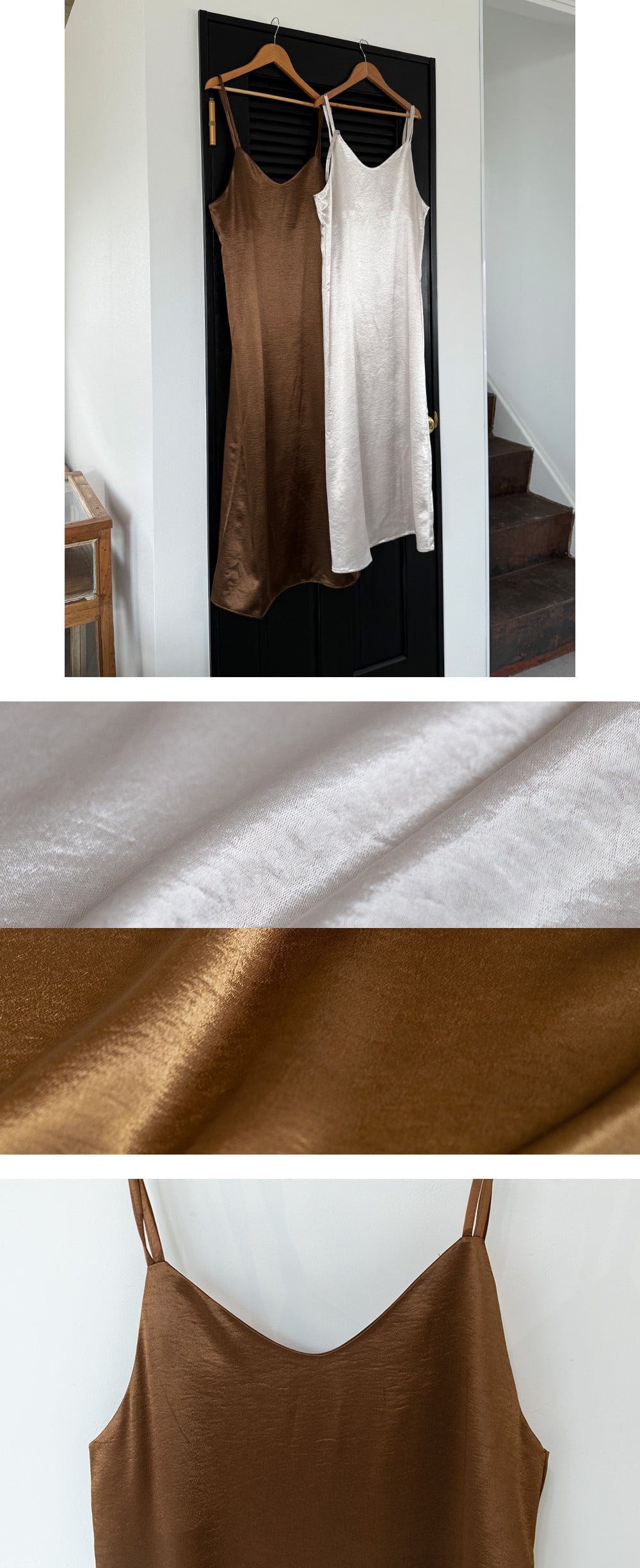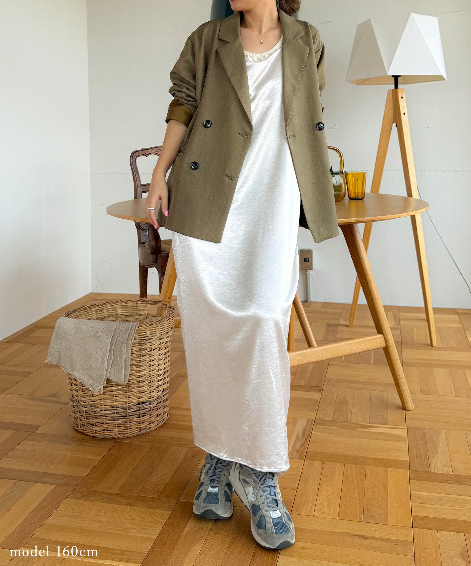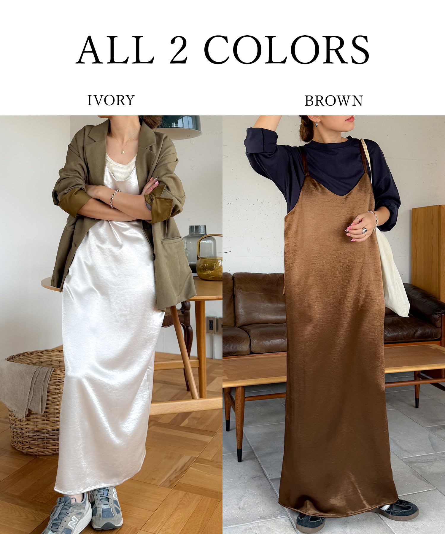 上品な光沢感が女性らしさを引き立てながらも、ゆるっとシルエットで体型を拾わずストレスフリーな着心地。肩紐は自分で結んで長さを調整できるデザインで、身長やスタイリングに合わせてアレンジが可能です。さらに後ろに深めのスリットが入っているので足さばきも軽やか◎ Tシャツやスニーカーと合わせてカジュアルダウンするのもおすすめ。シーンに合わせて着こなしを楽しめる一枚です。