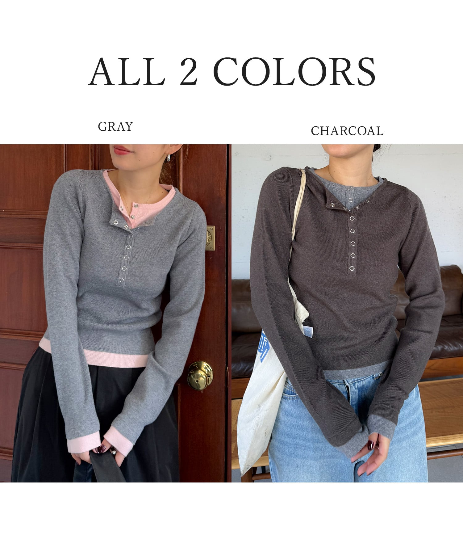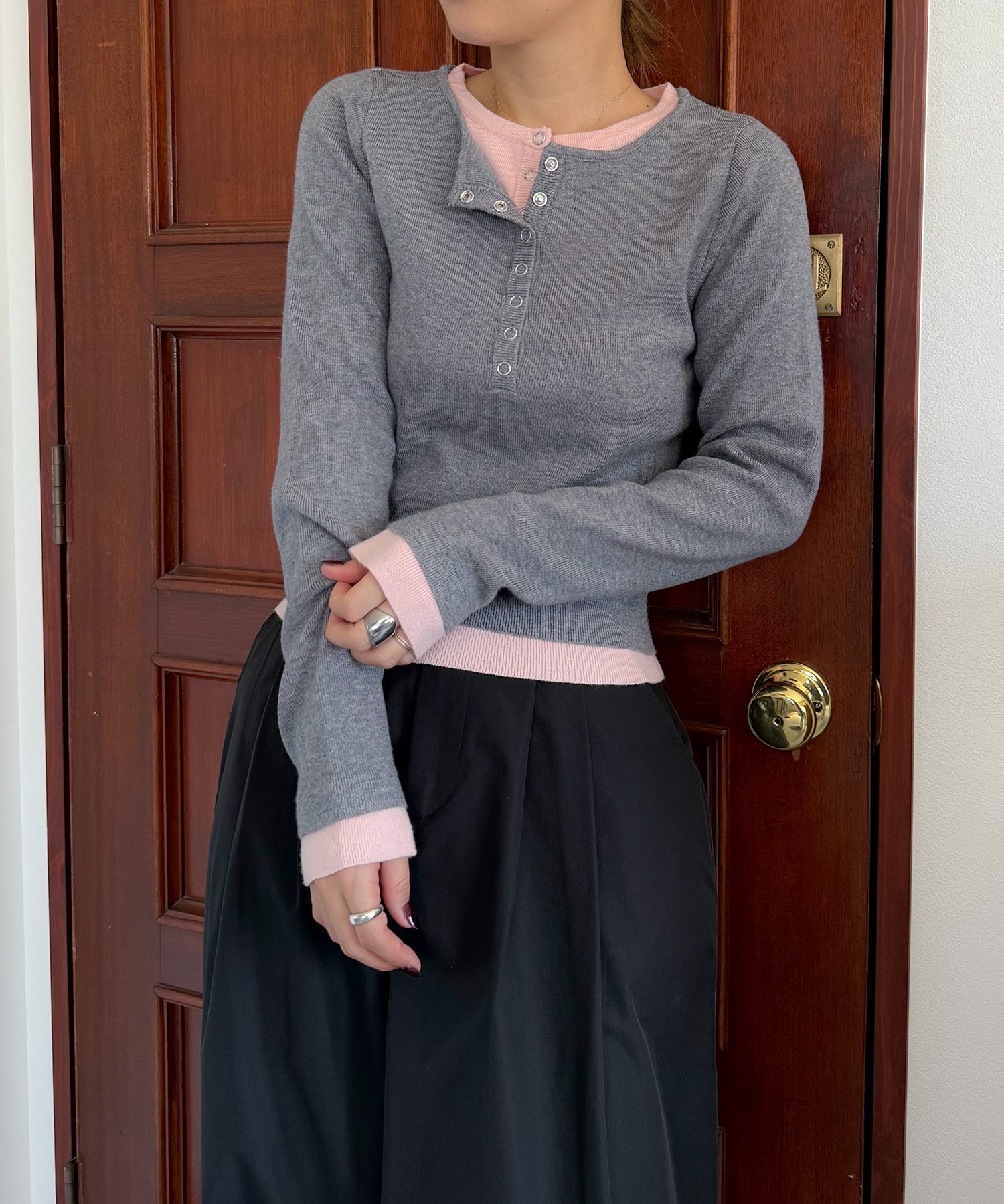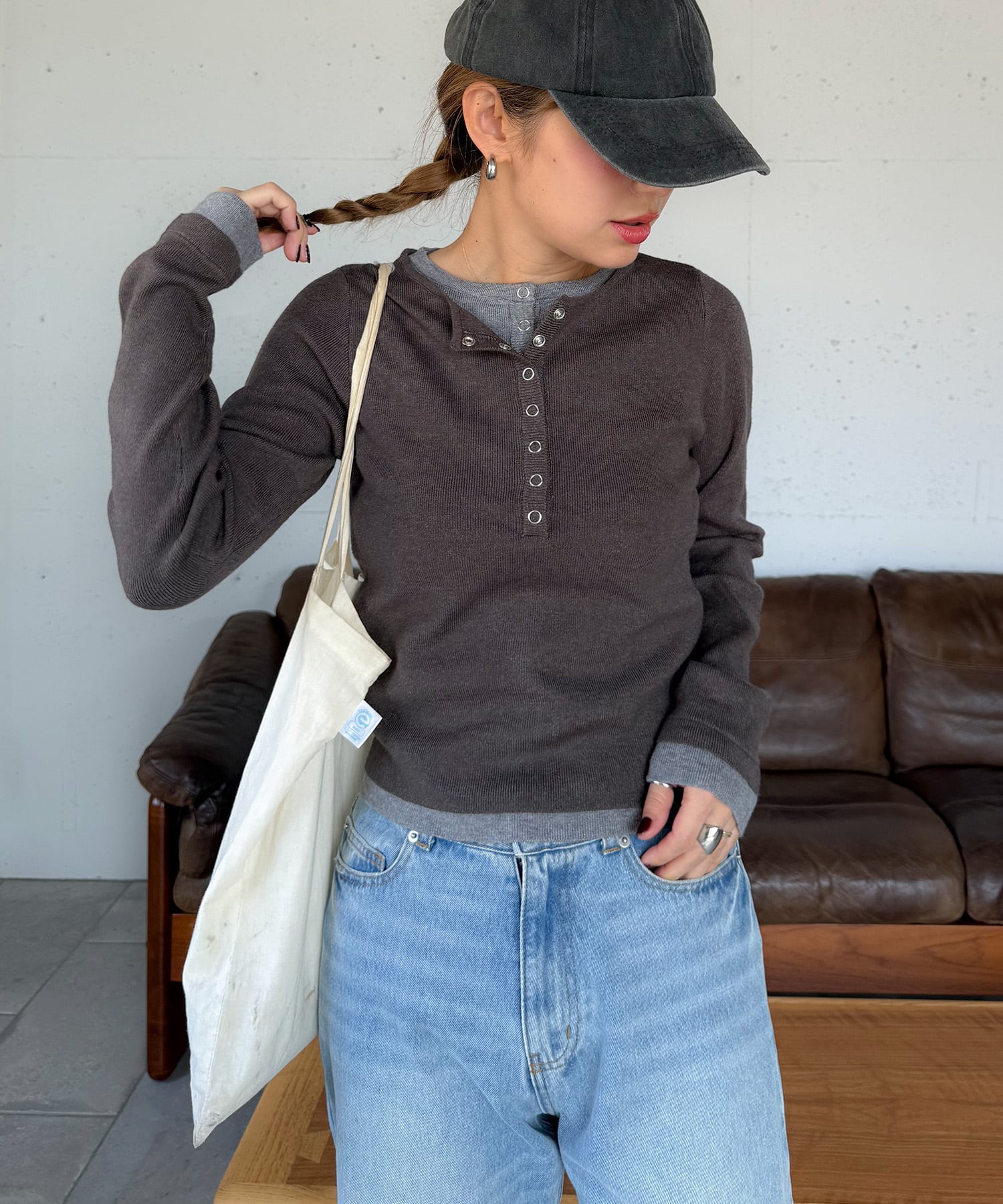 襟元と袖口、裾からのぞく配色デザインが、1枚でコーデが完成するおしゃれなレイヤードスタイルを演出します。ヘンリーネックのボタンは開け閉めができるので、レイヤードの見せ方を好みに合わせて調整可能。吸い付くような優しい肌触りのニット素材で、デイリーに着たくなる1着です。