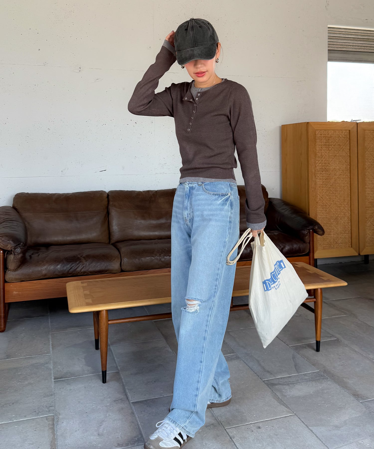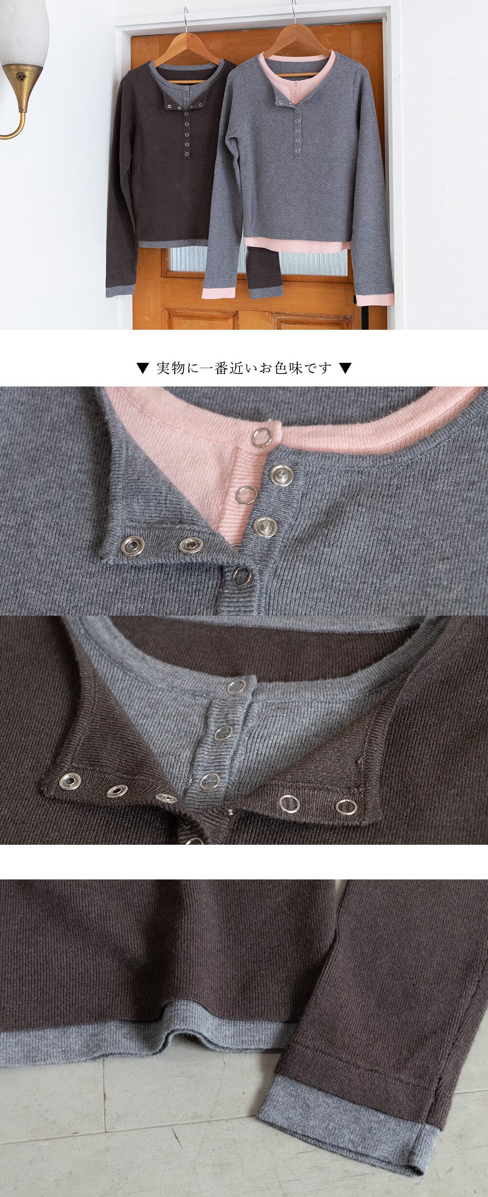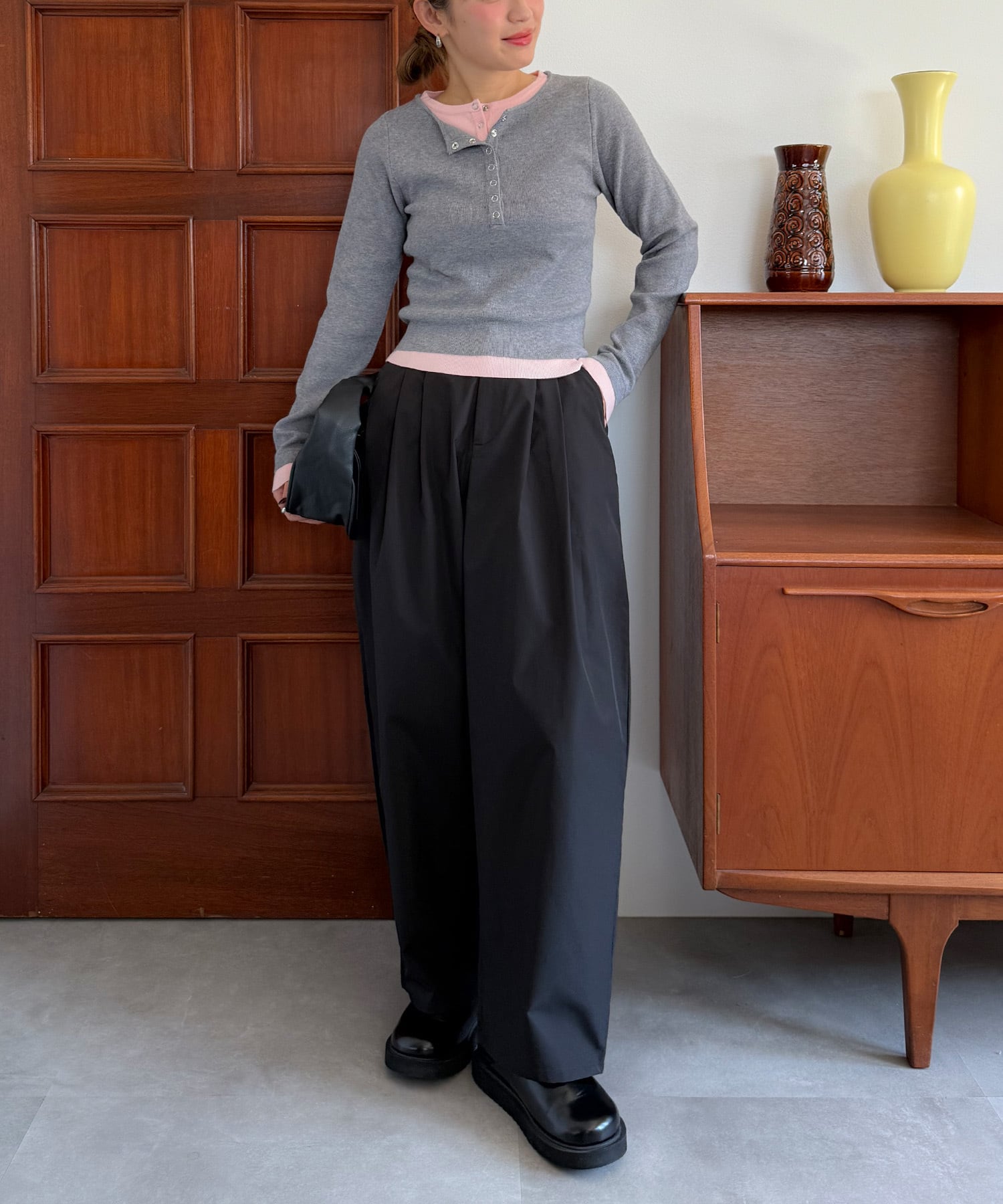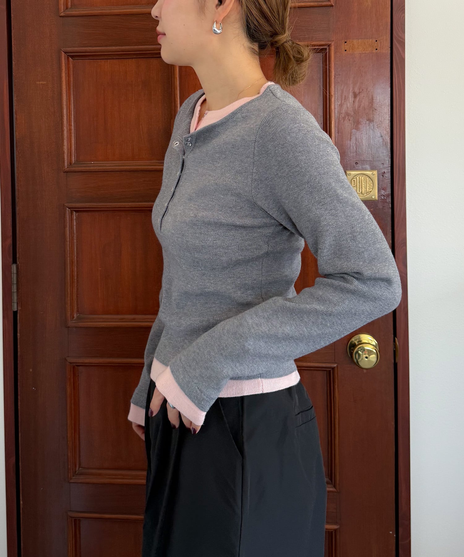 襟元と袖口、裾からのぞく配色デザインが、1枚でコーデが完成するおしゃれなレイヤードスタイルを演出します。ヘンリーネックのボタンは開け閉めができるので、レイヤードの見せ方を好みに合わせて調整可能。吸い付くような優しい肌触りのニット素材で、デイリーに着たくなる1着です。