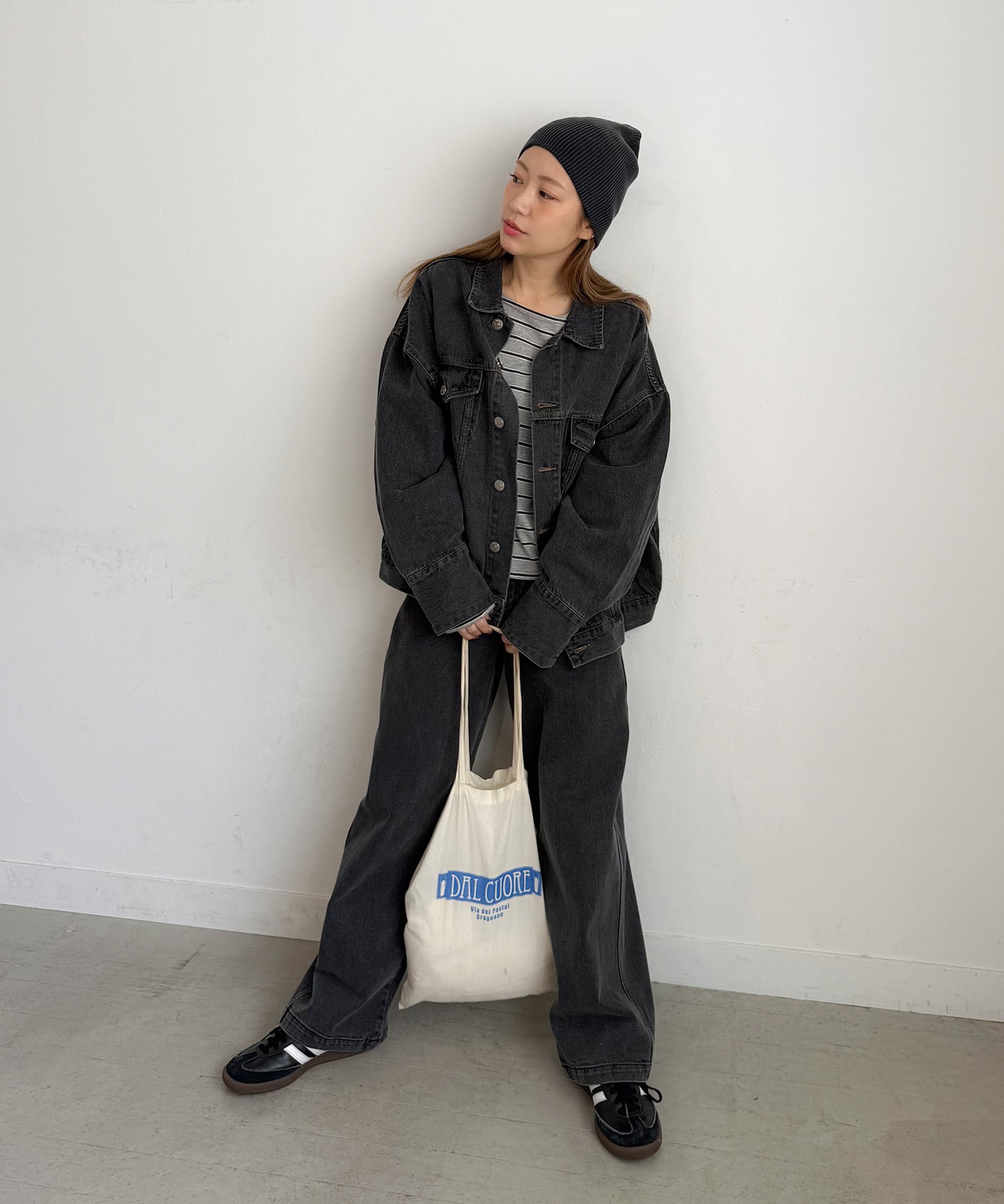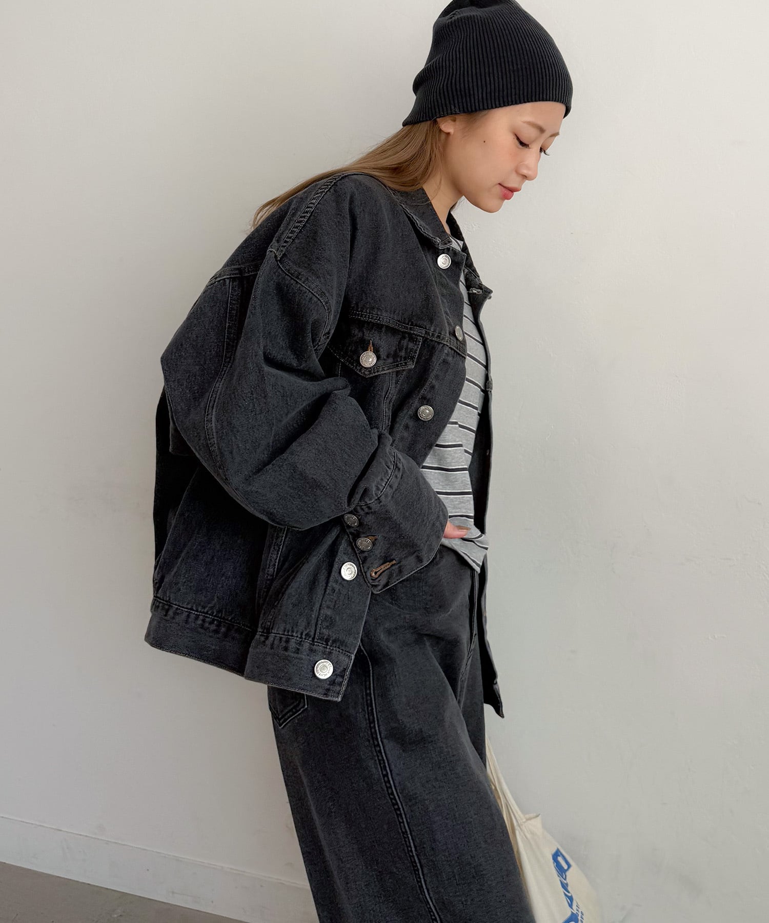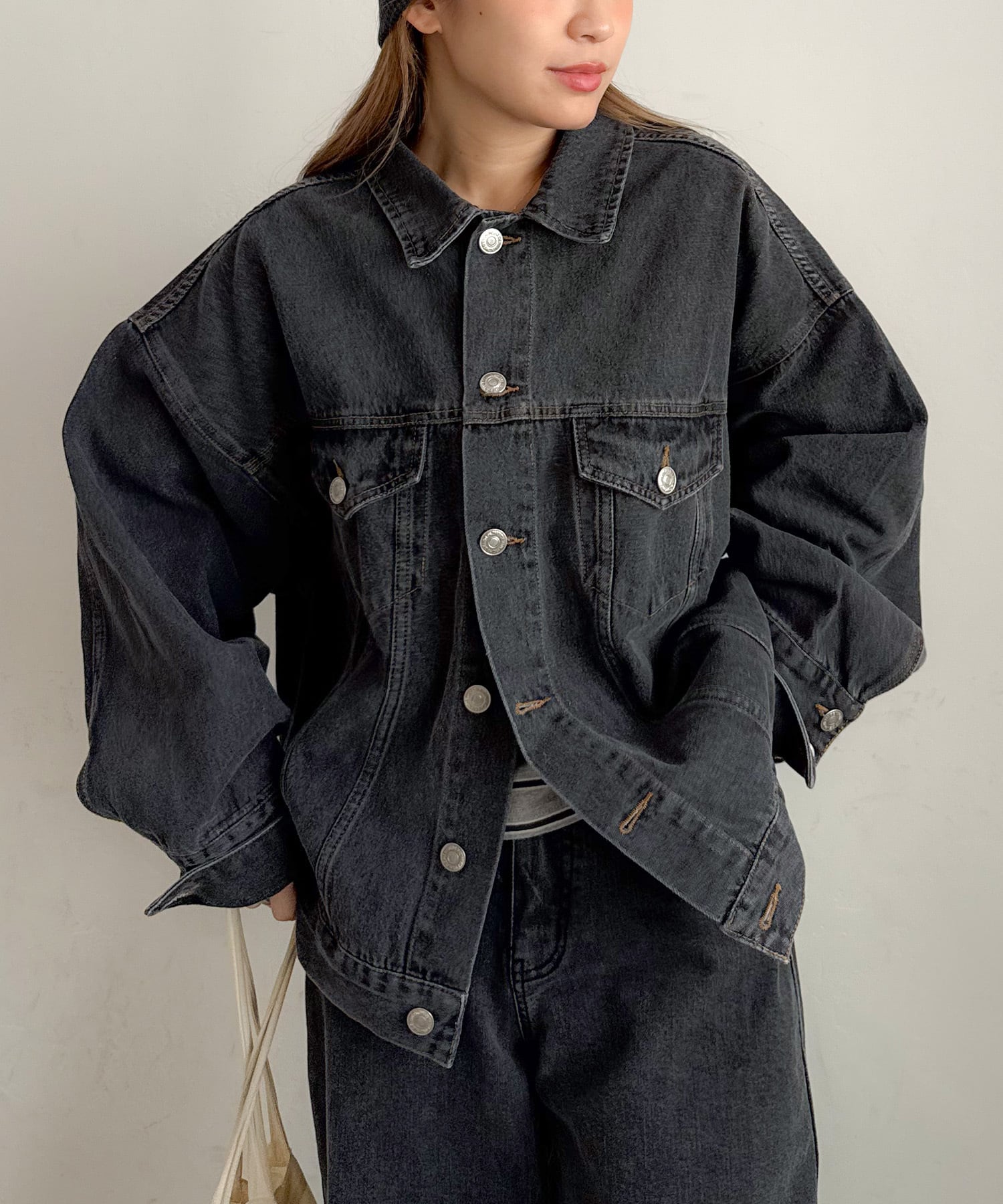 ブラックは、PICHIで展開しているカーブデニムとセットアップで着用できます。