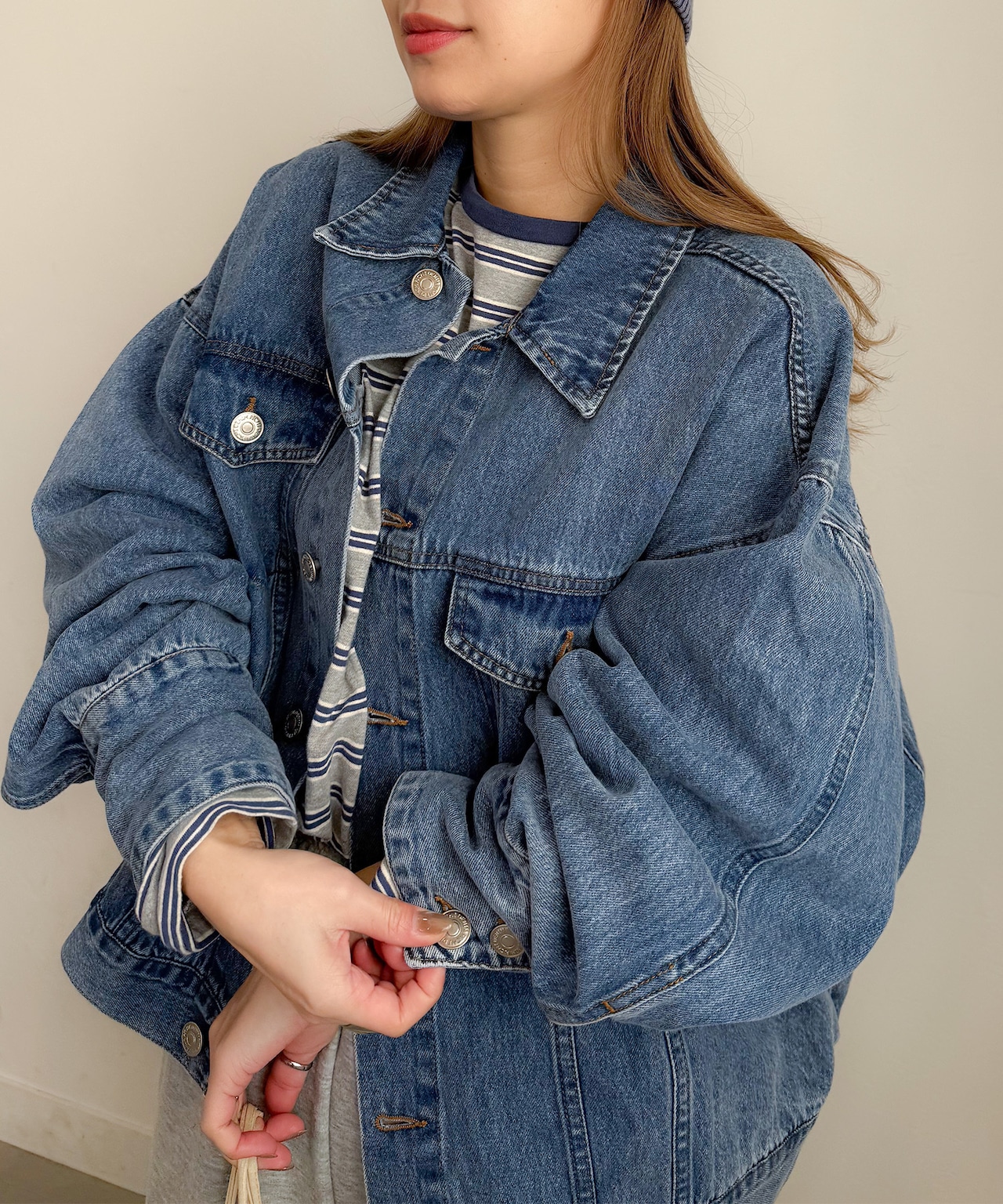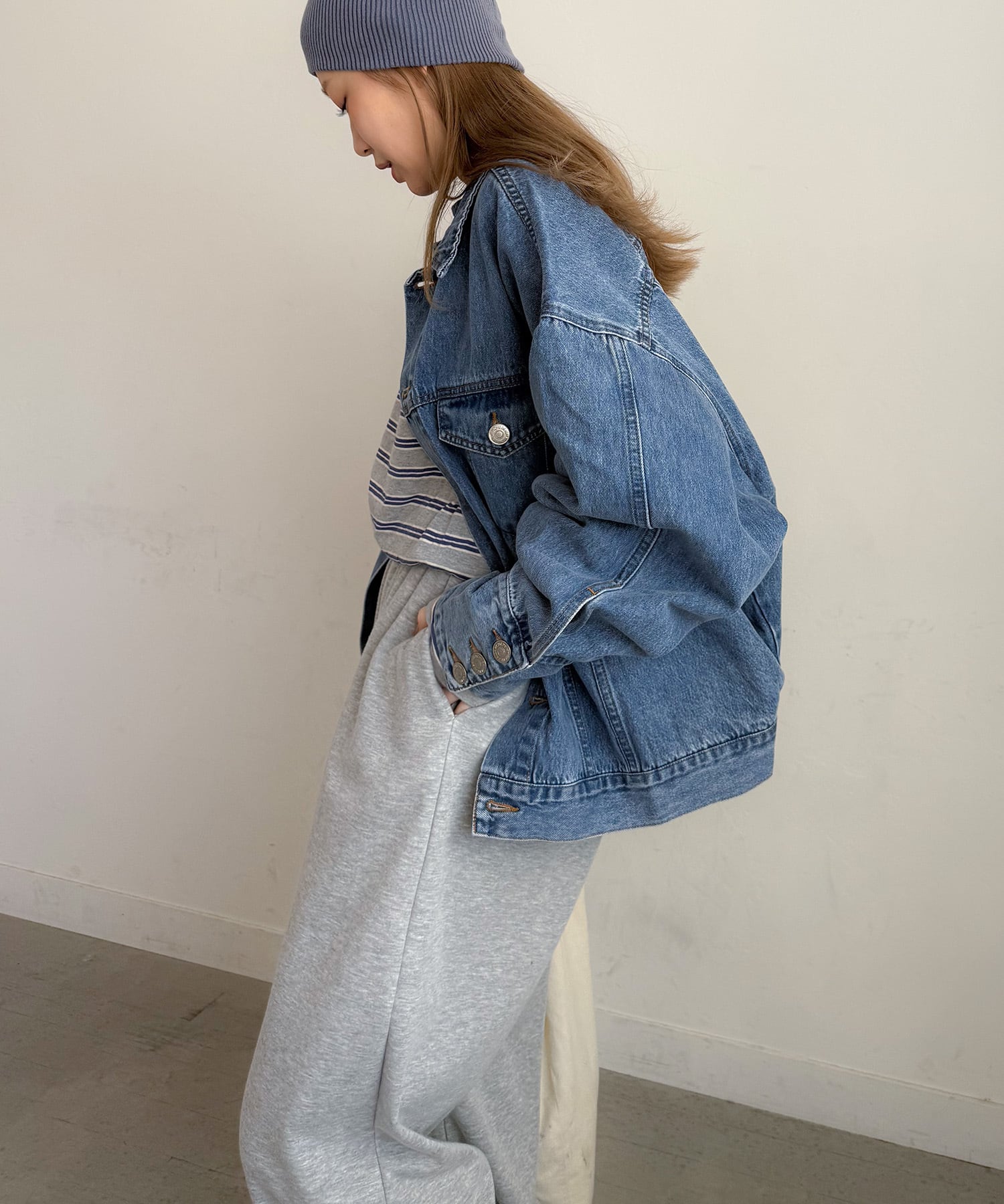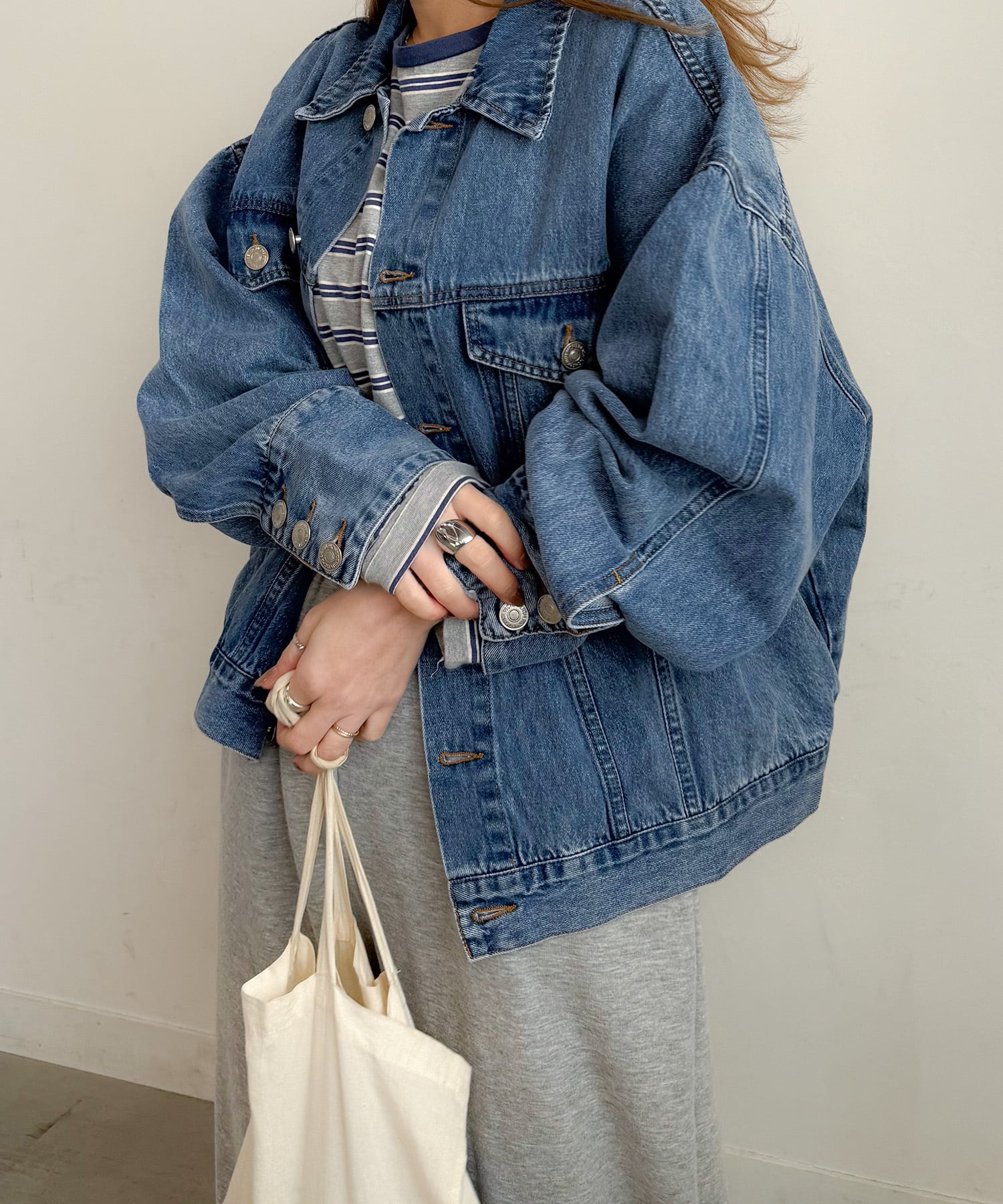 洗練された印象を与えるルーズデニムジャケット。