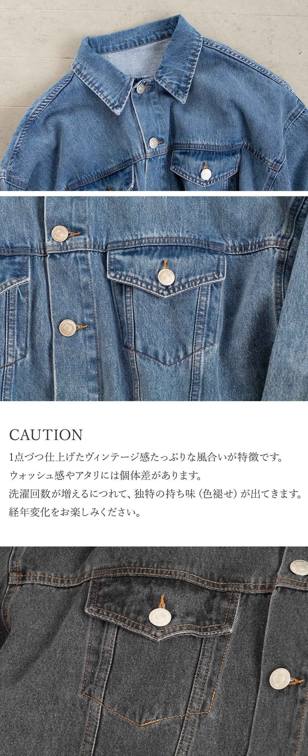 ・一点づつ仕上げたヴィンテージ加工が特徴です。ウォッシュ感やアタリ、色味には個体差があります。