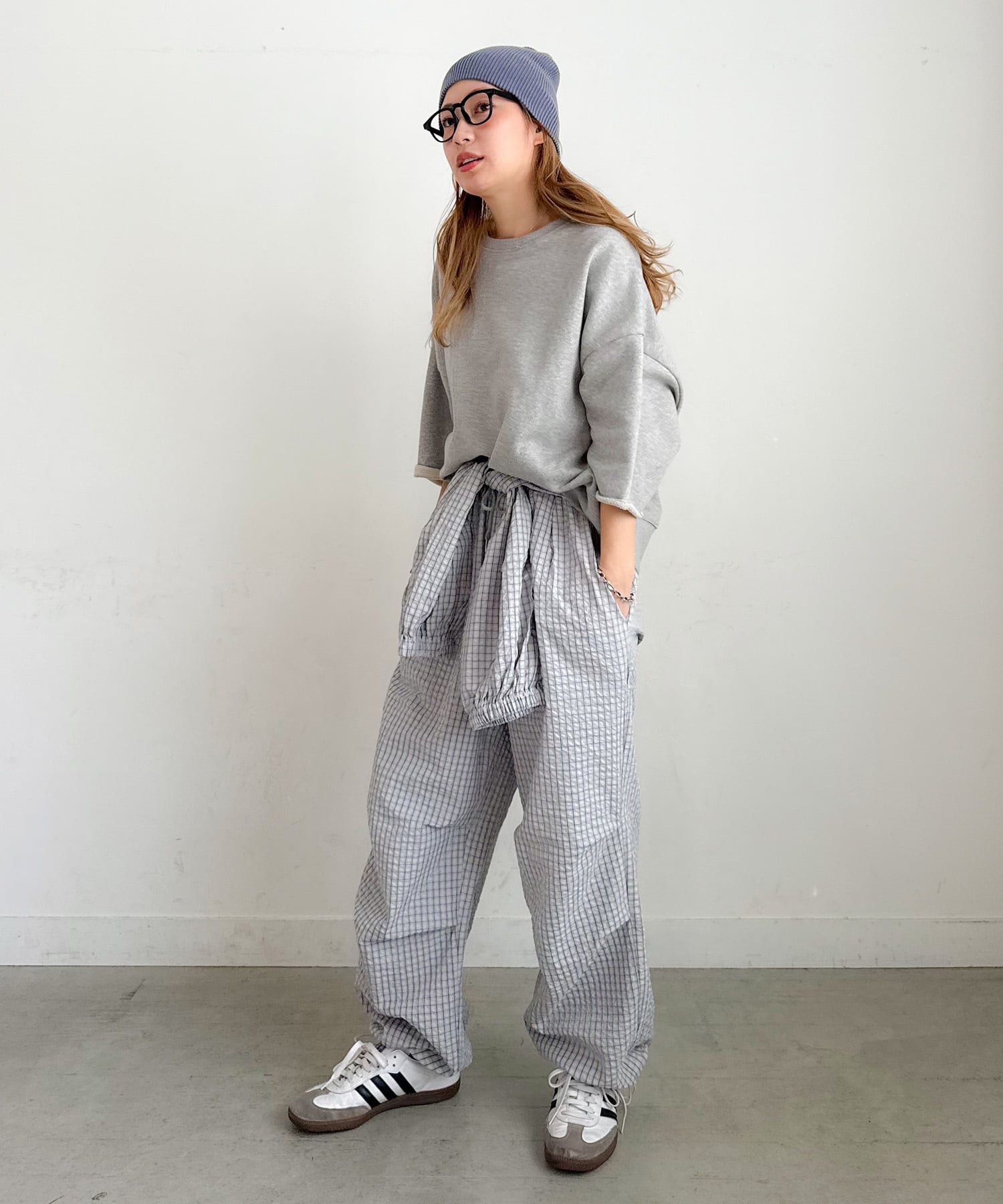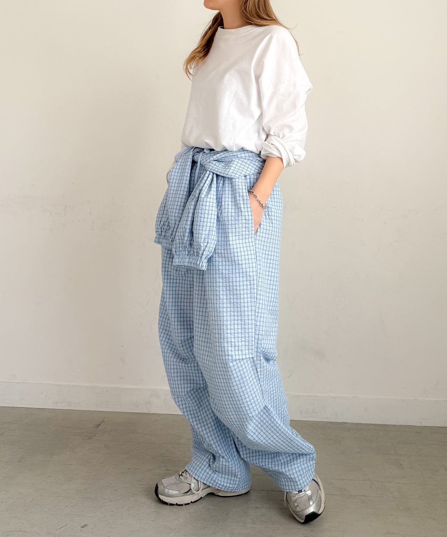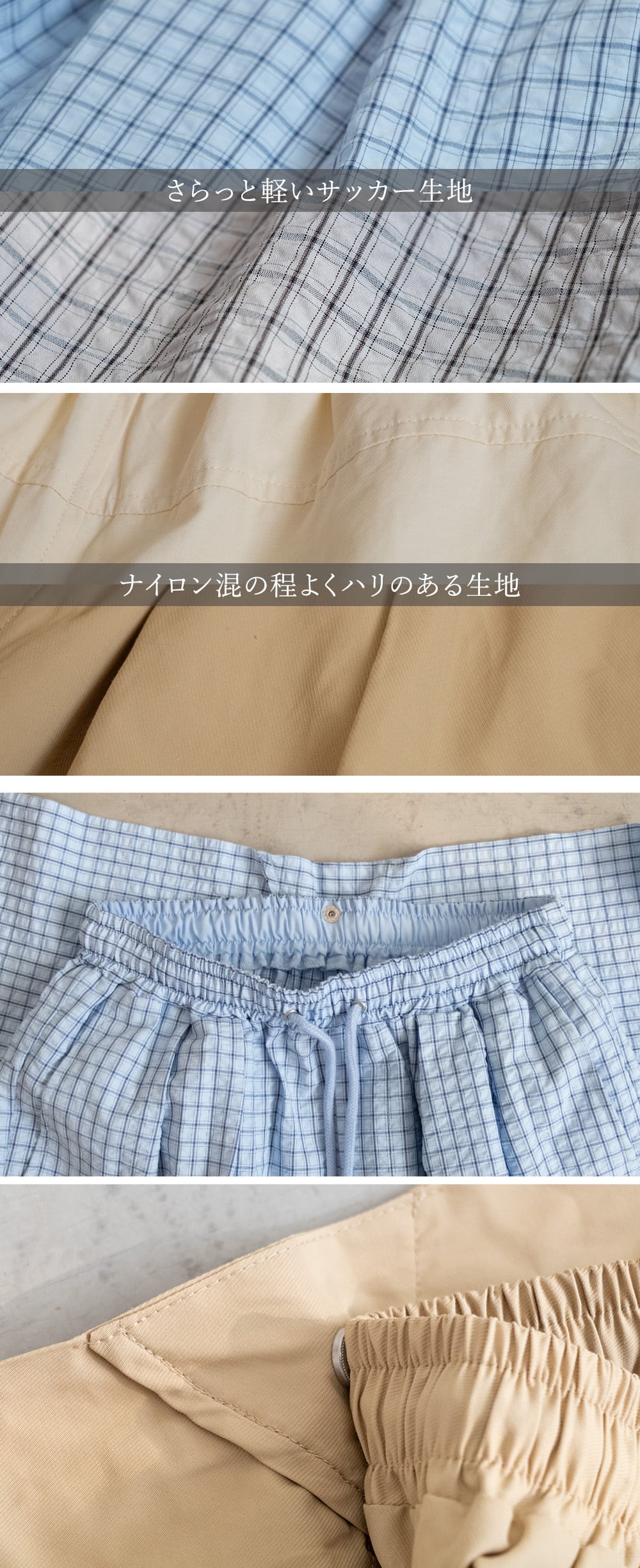 2タイプから選べる生地で、チェック柄は軽い着心地のサッカー生地。無地はナイロン混の軽くてシャカシャカとしたハリのある生地。それぞれ雰囲気が違うので、好みのスタイリングに合わせて選ぶのもおすすめです。