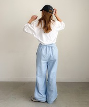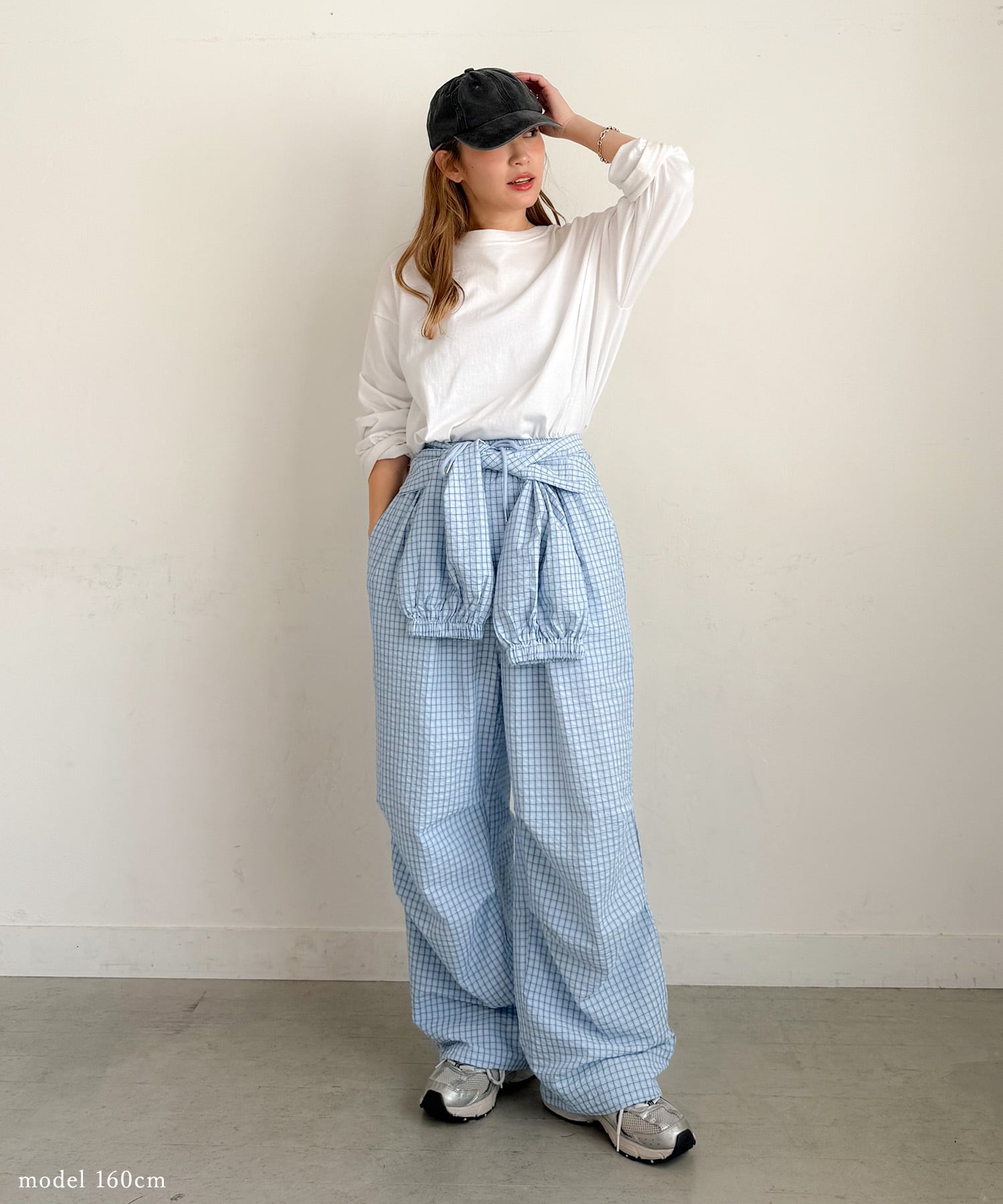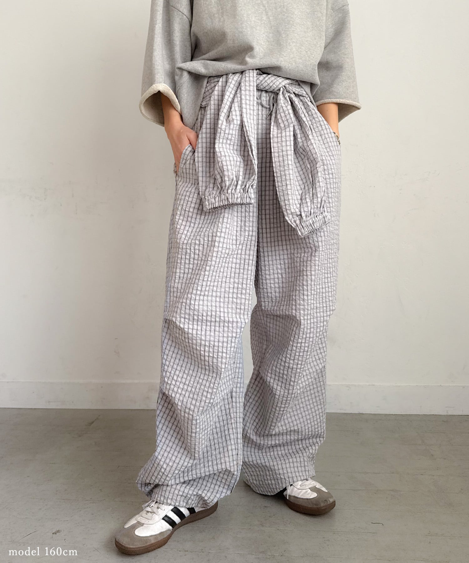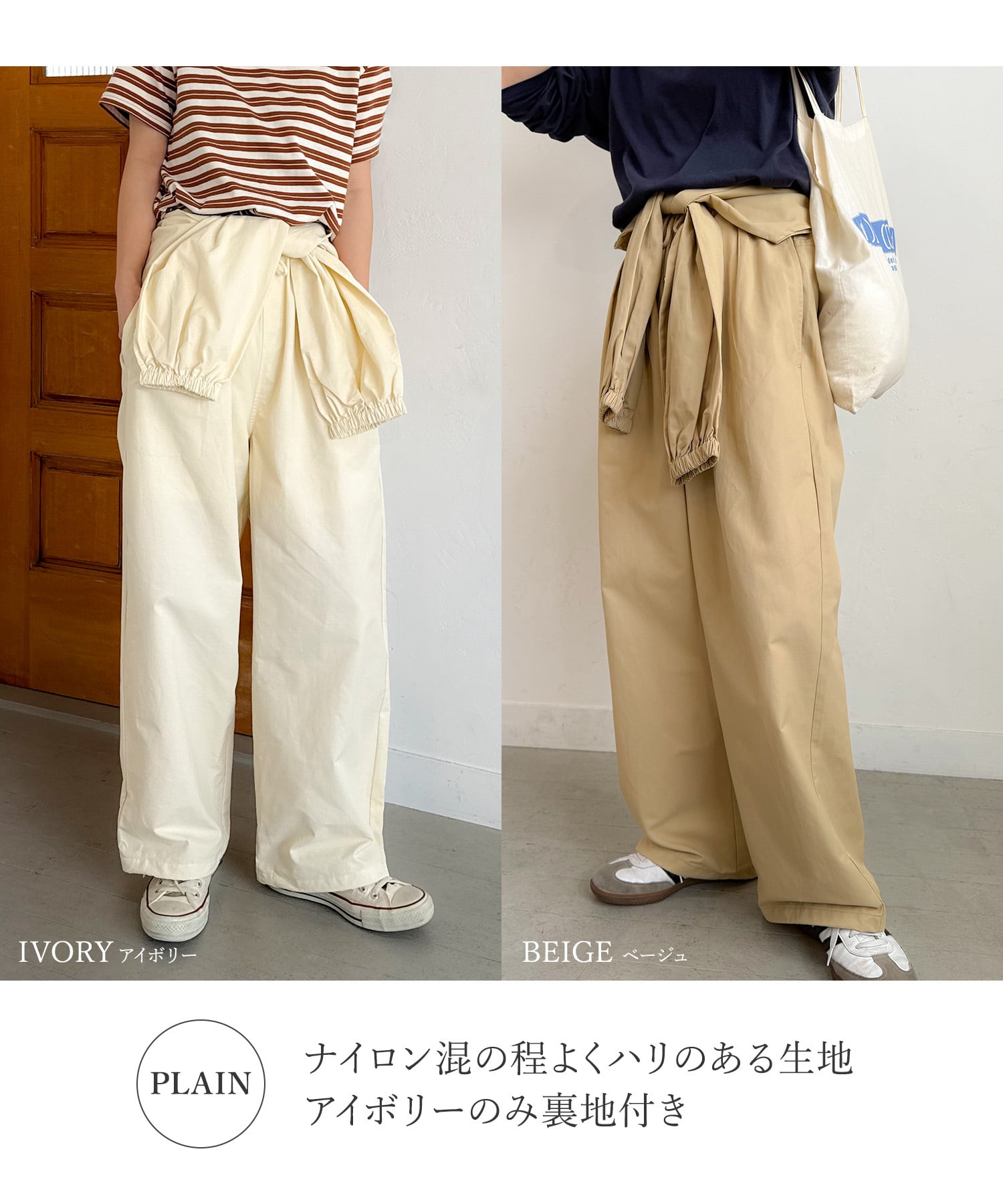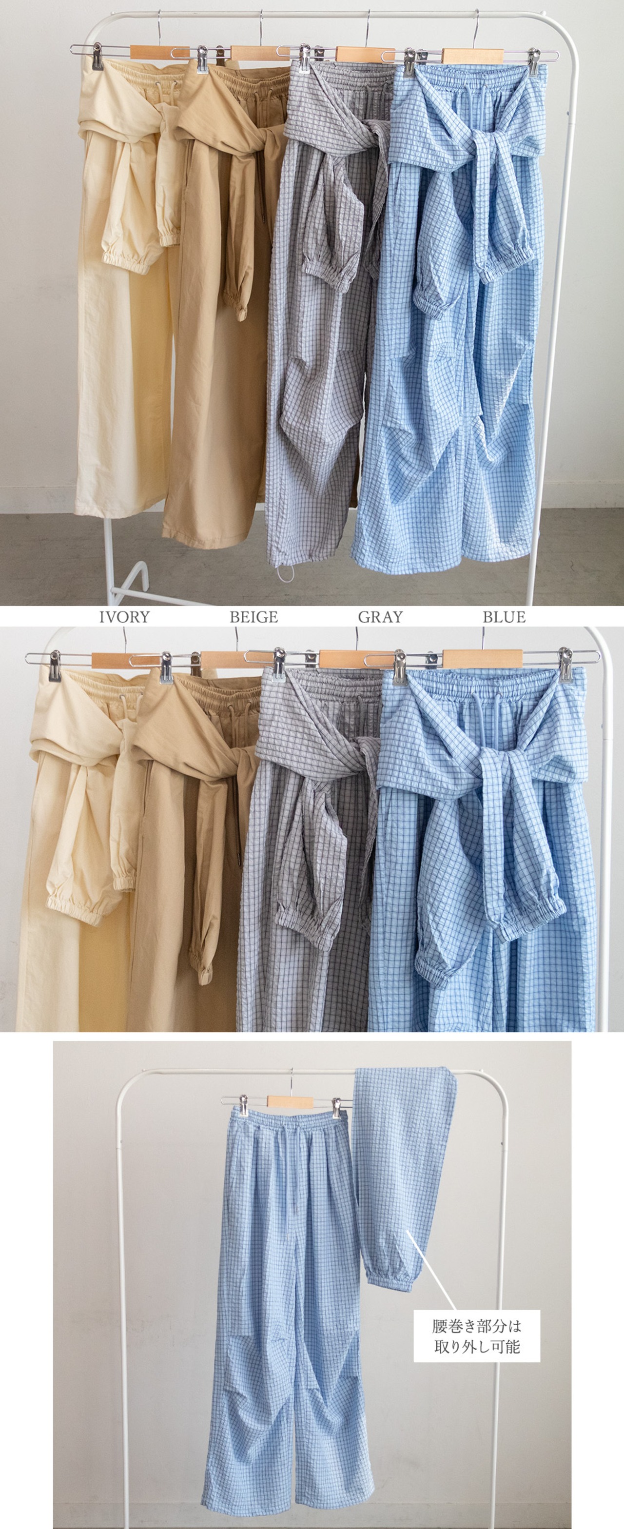 ウエスト部分の腰布はボタンひとつで簡単に取り外しできるので、スタイリングに合わせて表情を変えられます。ウエストはゴム+紐仕様で、ストレスフリーな穿き心地。パンツ自体は程よくダボっとしたシルエットで、ラフなのに可愛さもしっかりキープしてくれます。