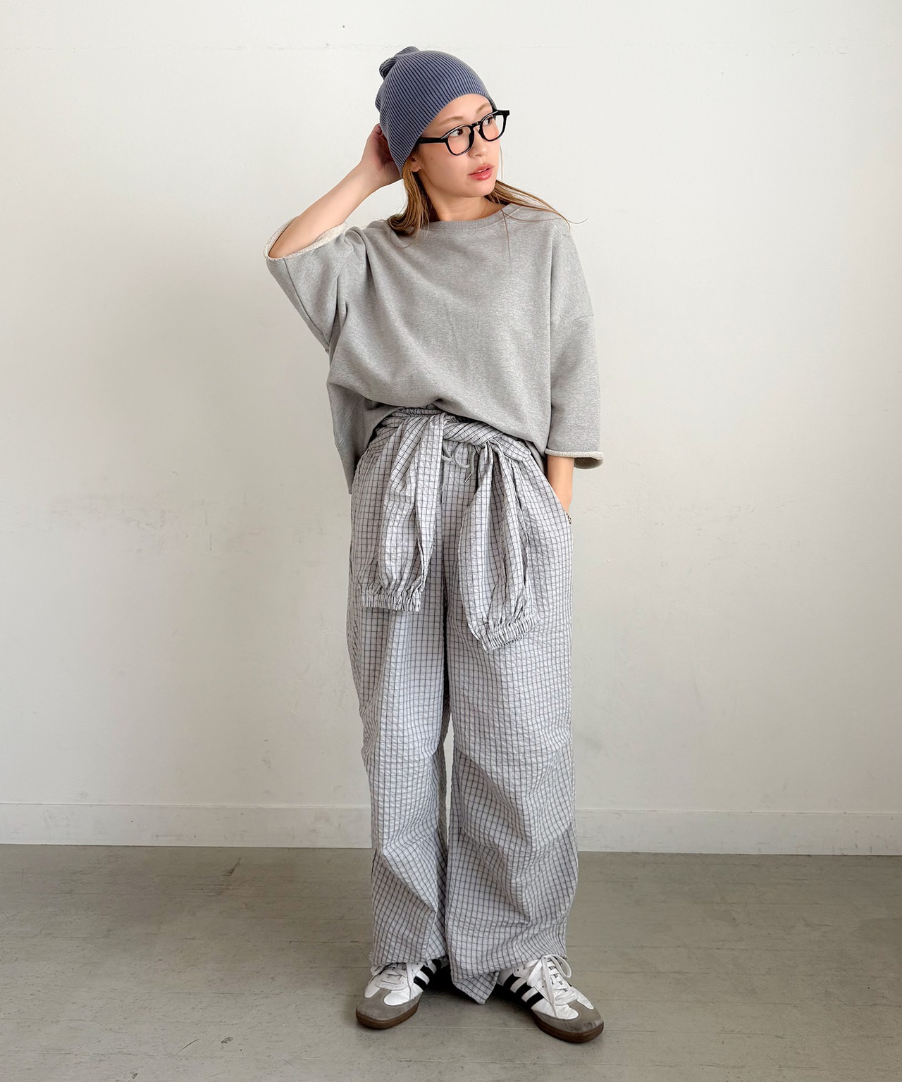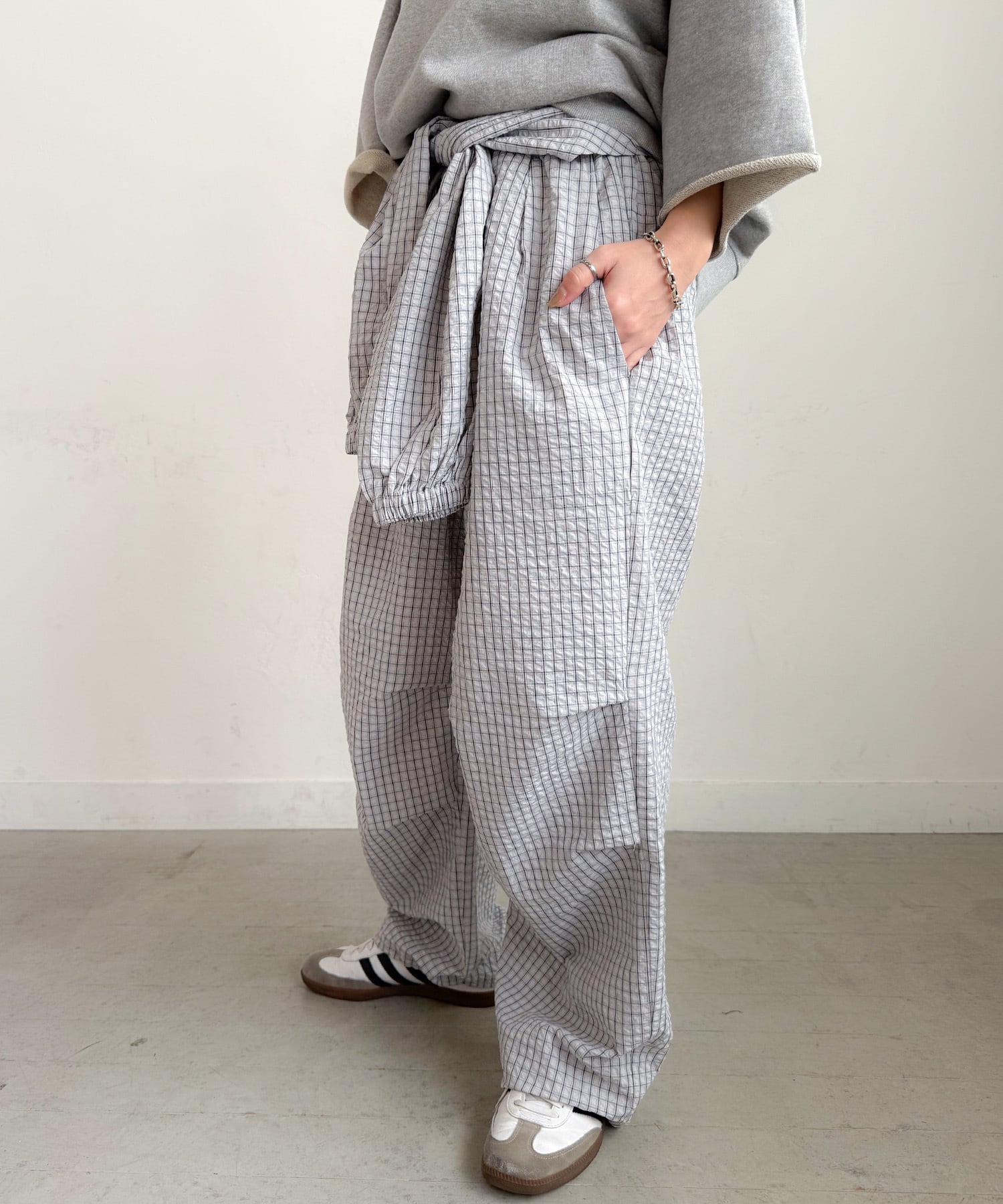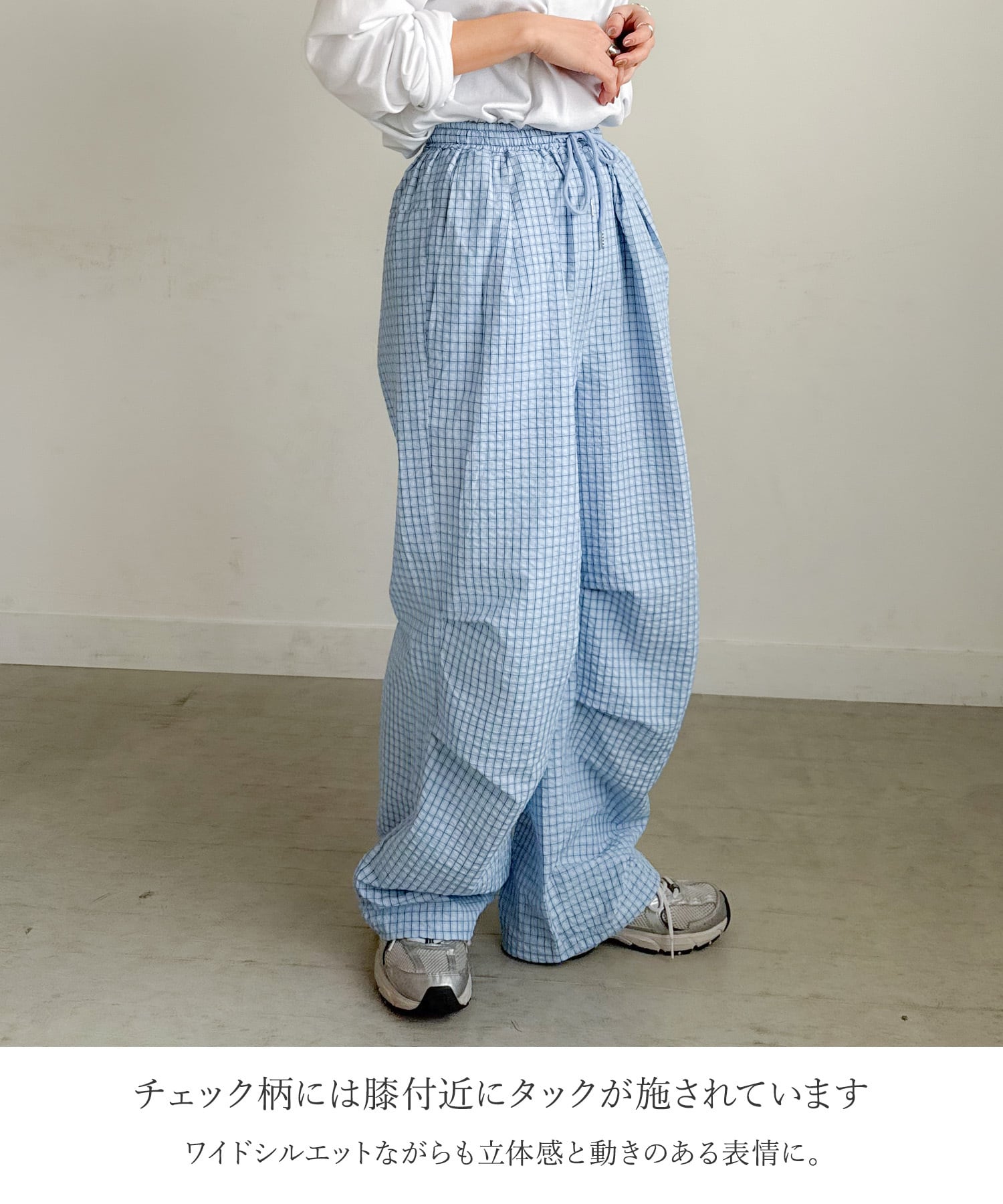 チェック柄の膝付近にはタックが施されています。立体感を生み、表情のあるシルエットに。ワイドなシルエットでもラフになりすぎず、デザイン性の高さが際立ちます。