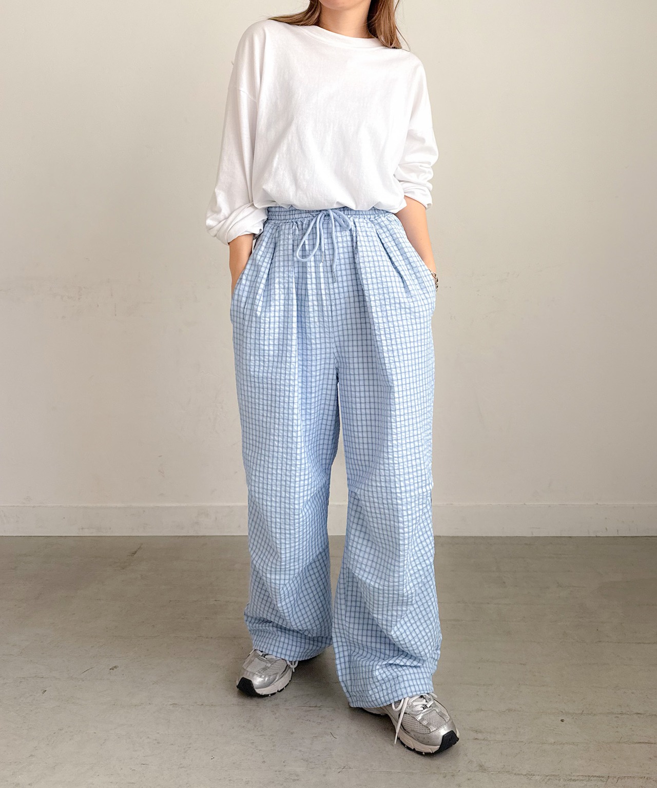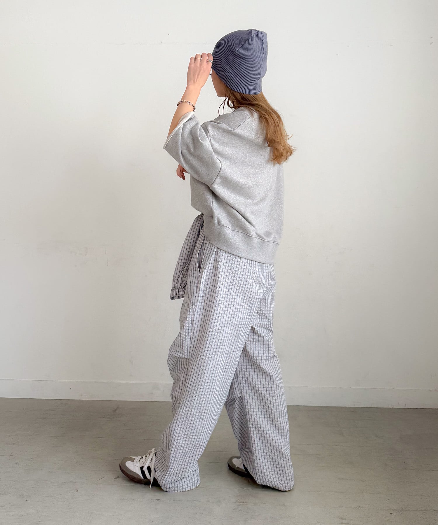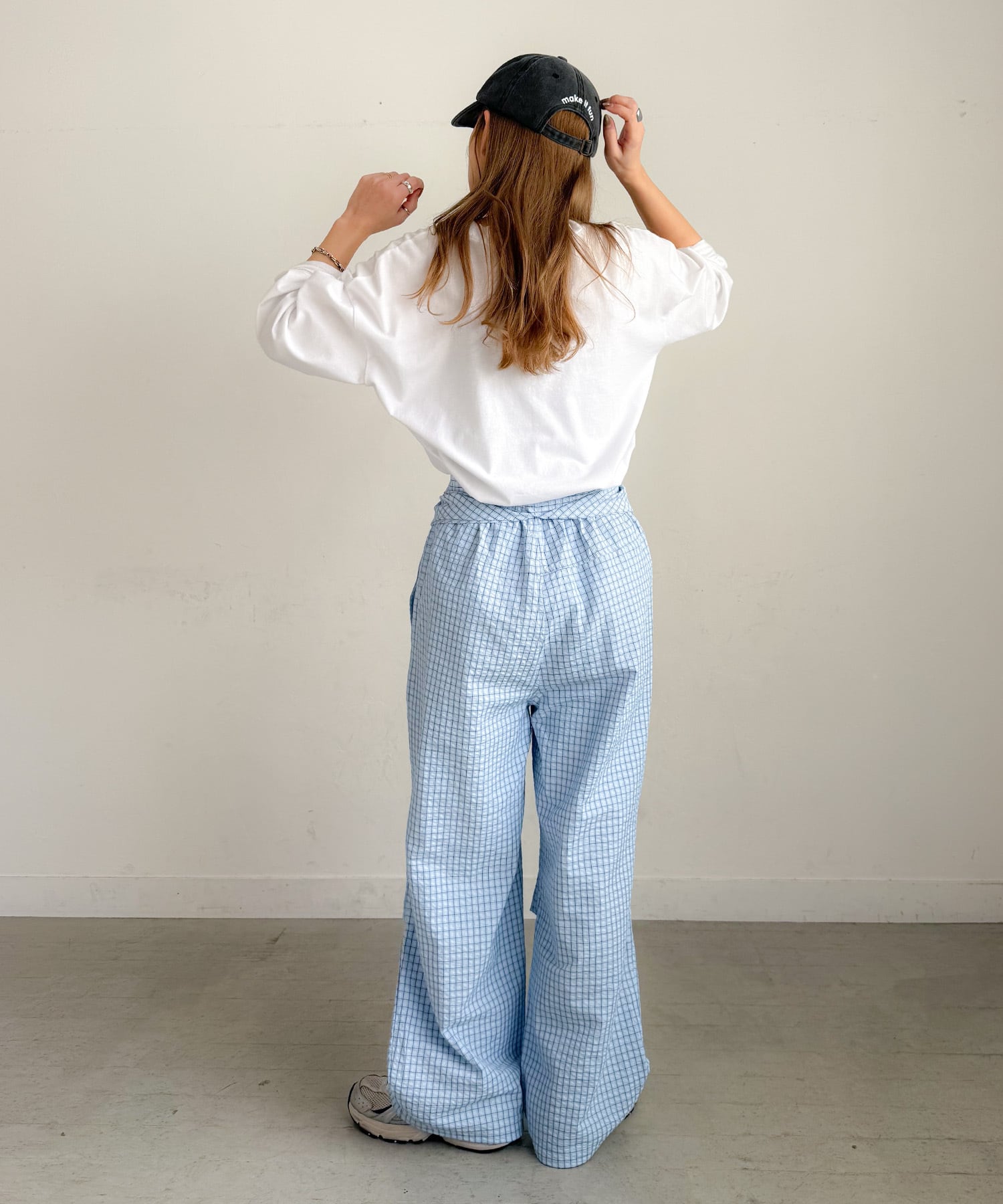 チェック柄の膝付近にはタックが施されています。立体感を生み、表情のあるシルエットに。ワイドなシルエットでもラフになりすぎず、デザイン性の高さが際立ちます。