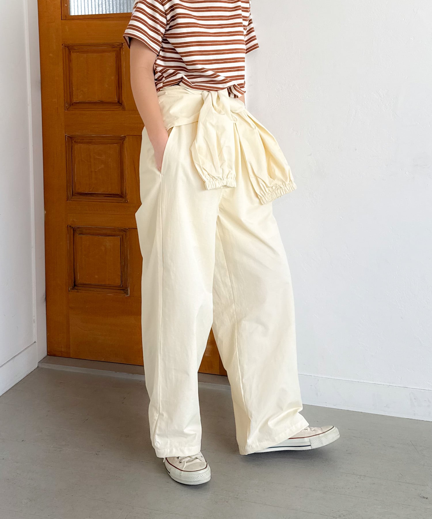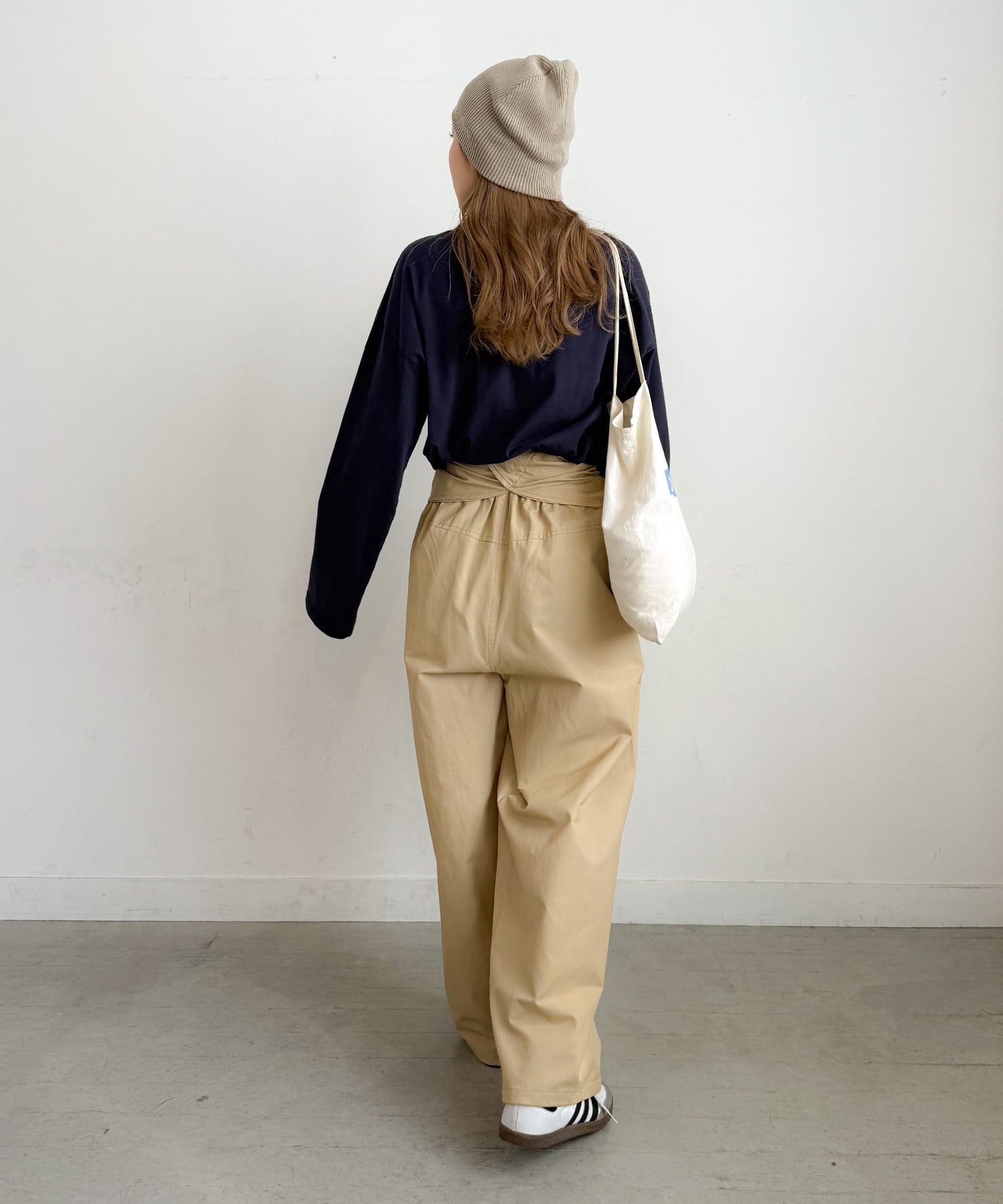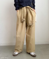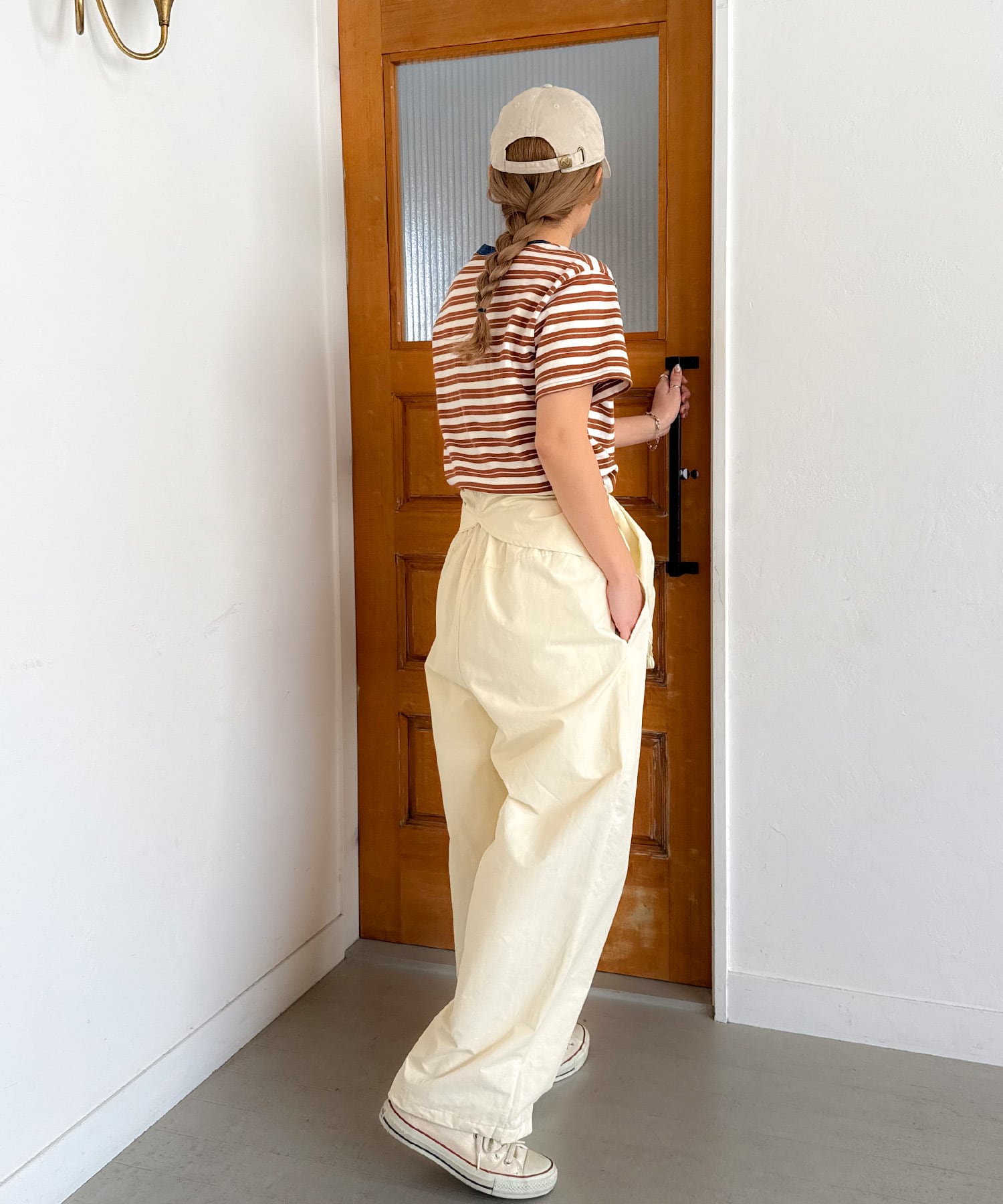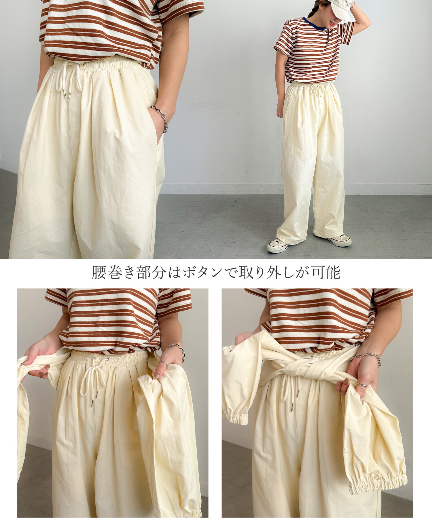 ウエスト部分の腰布はボタンひとつで簡単に取り外しできるので、スタイリングに合わせて表情を変えられます。ウエストはゴム+紐仕様で、ストレスフリーな穿き心地。パンツ自体は程よくダボっとしたシルエットで、ラフなのに可愛さもしっかりキープしてくれます。
