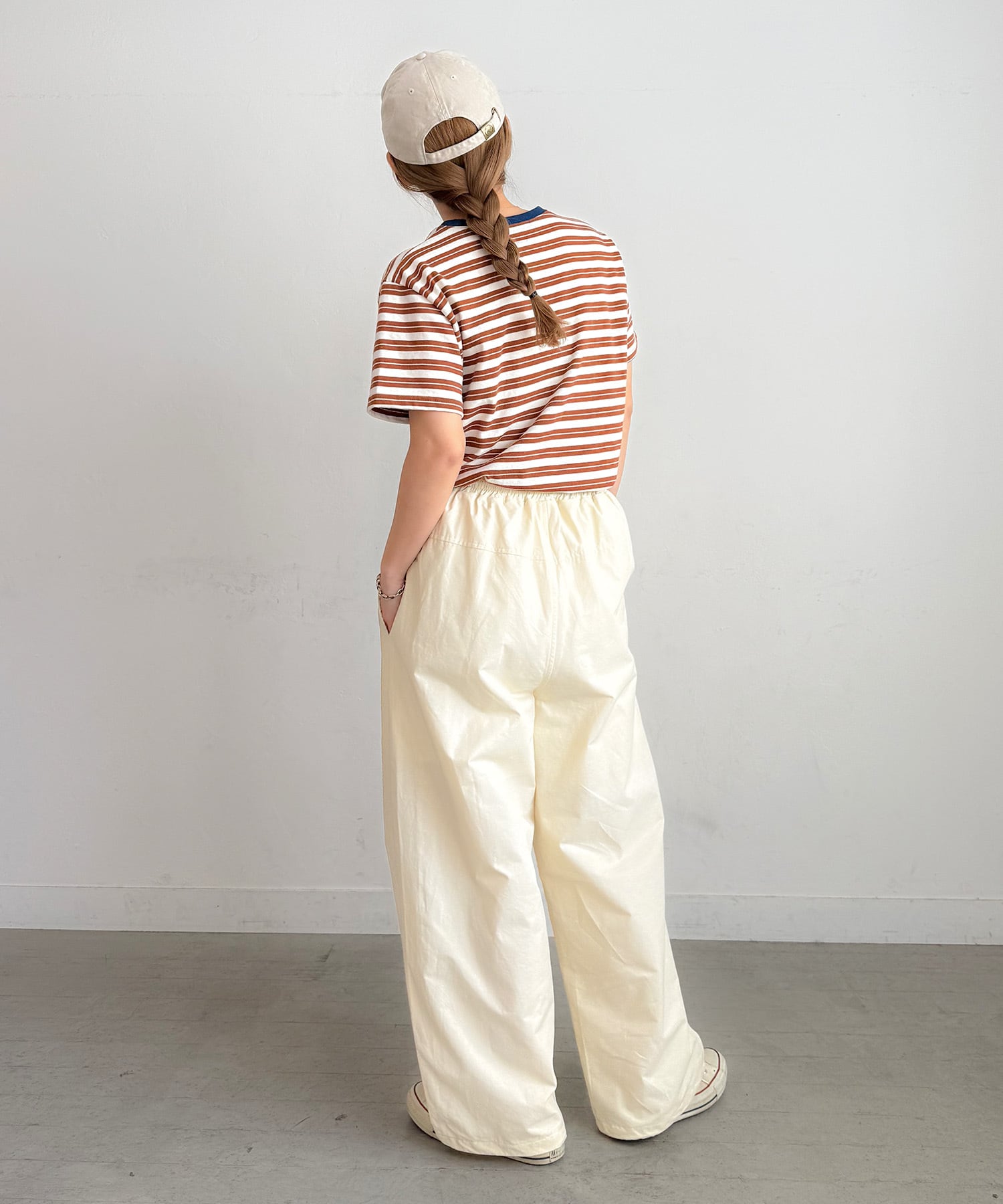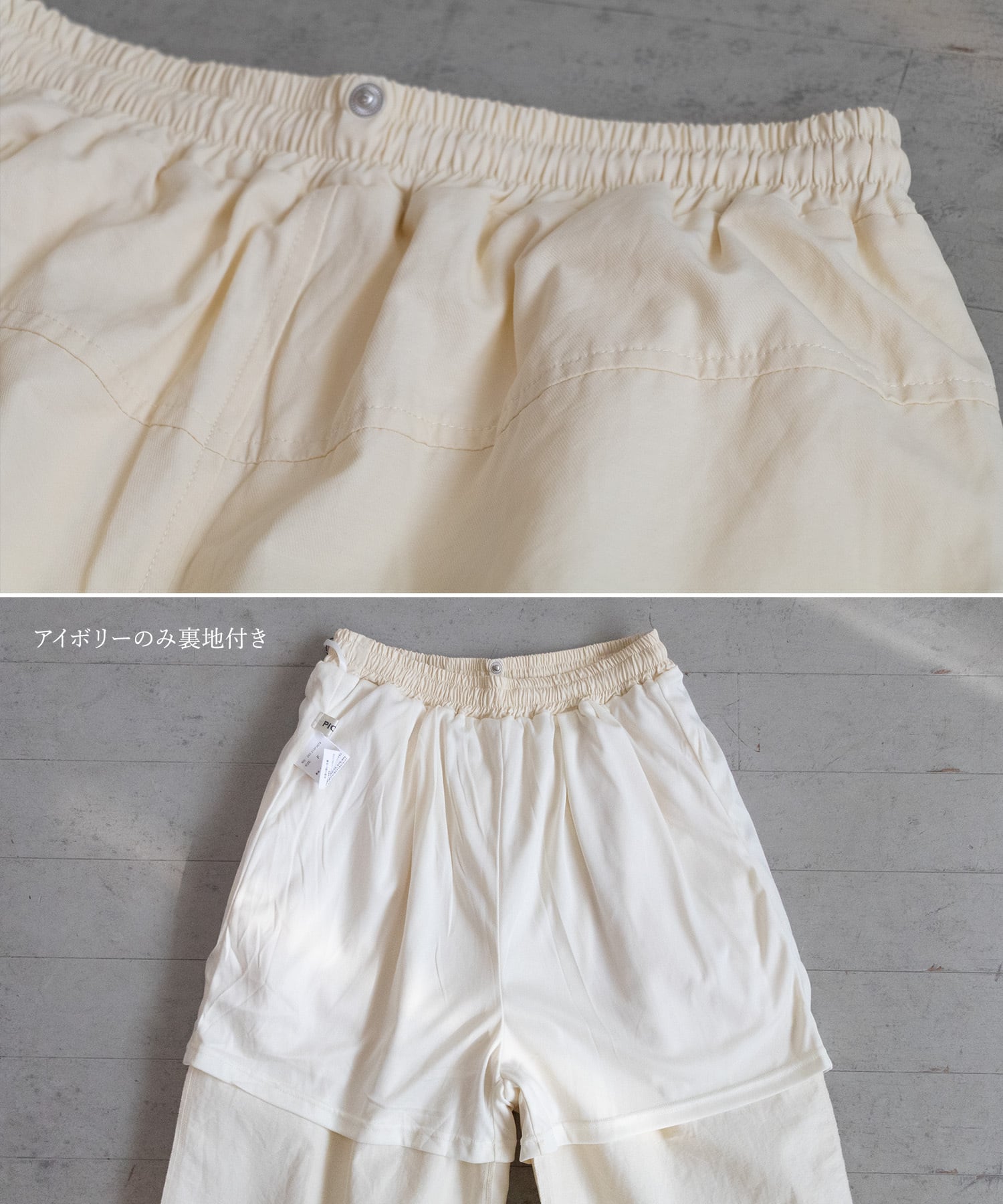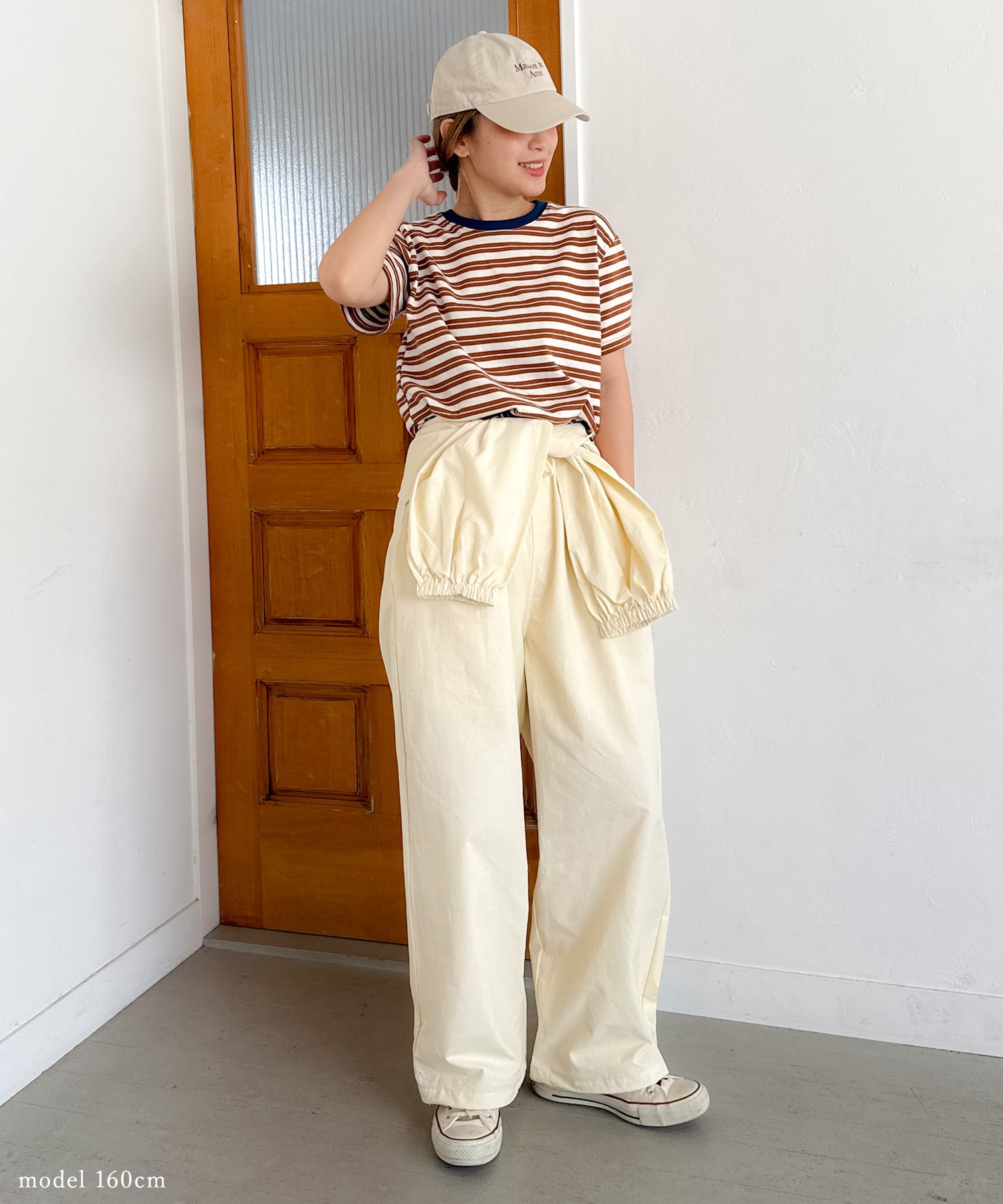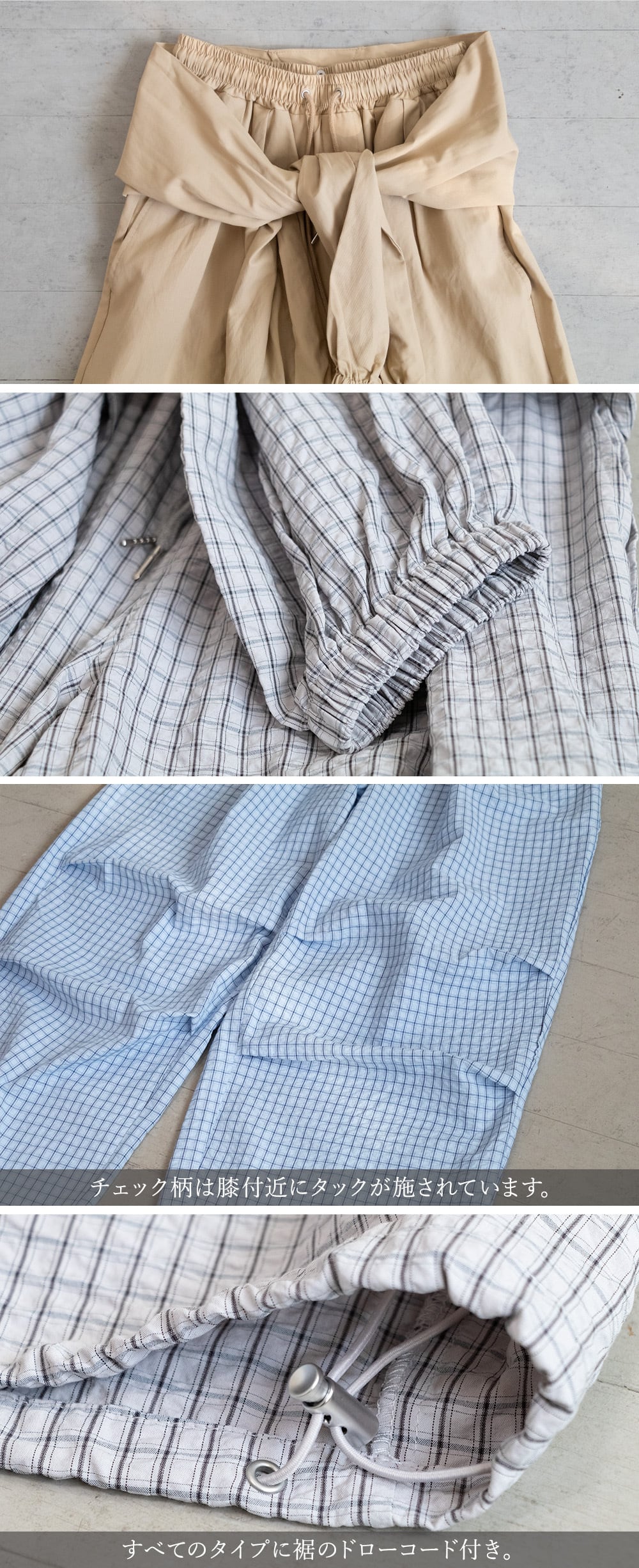 ウエスト部分の腰布はボタンひとつで簡単に取り外しできるので、スタイリングに合わせて表情を変えられます。ウエストはゴム+紐仕様で、ストレスフリーな穿き心地。パンツ自体は程よくダボっとしたシルエットで、ラフなのに可愛さもしっかりキープしてくれます。
