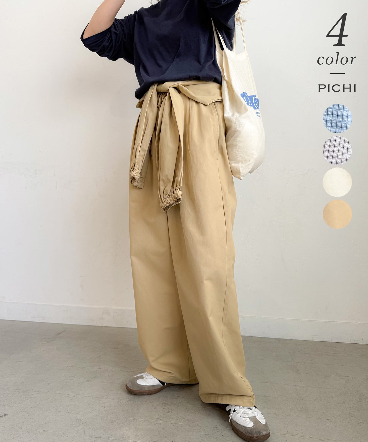 チェック柄の膝付近にはタックが施されています。立体感を生み、表情のあるシルエットに。ワイドなシルエットでもラフになりすぎず、デザイン性の高さが際立ちます。