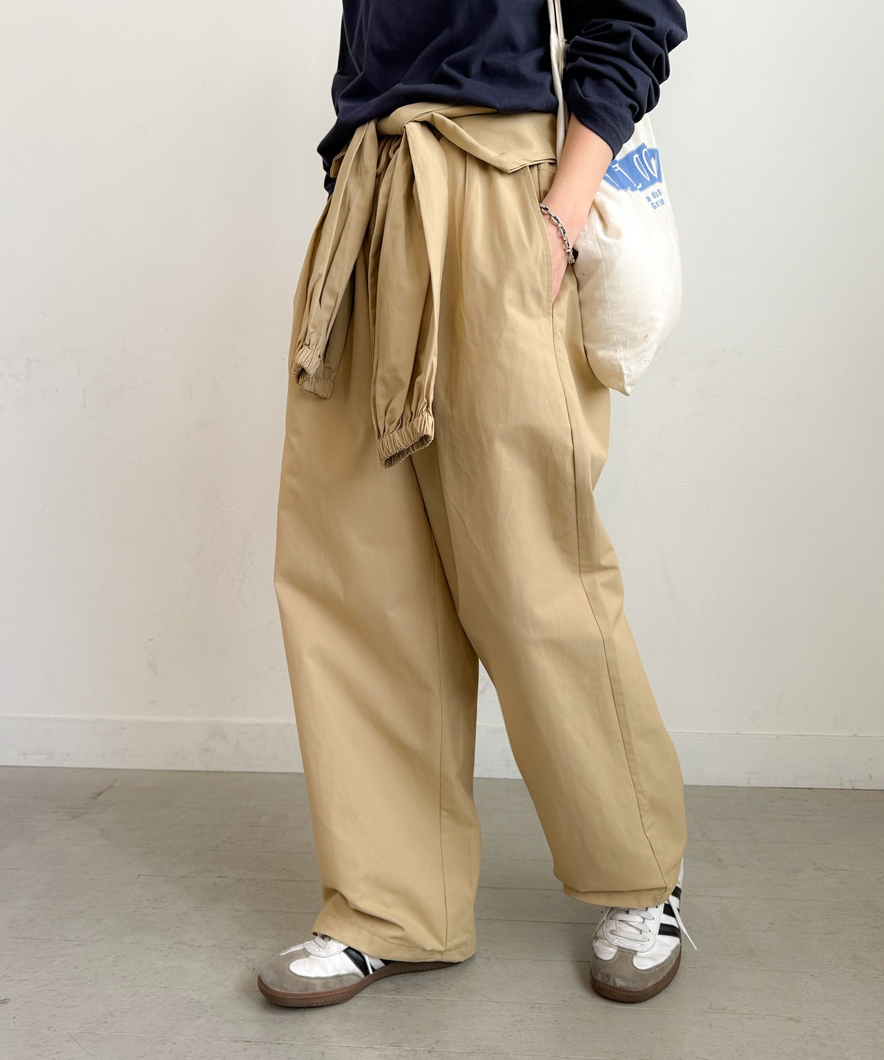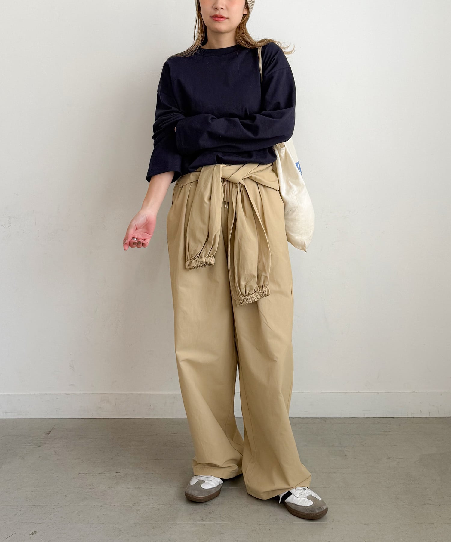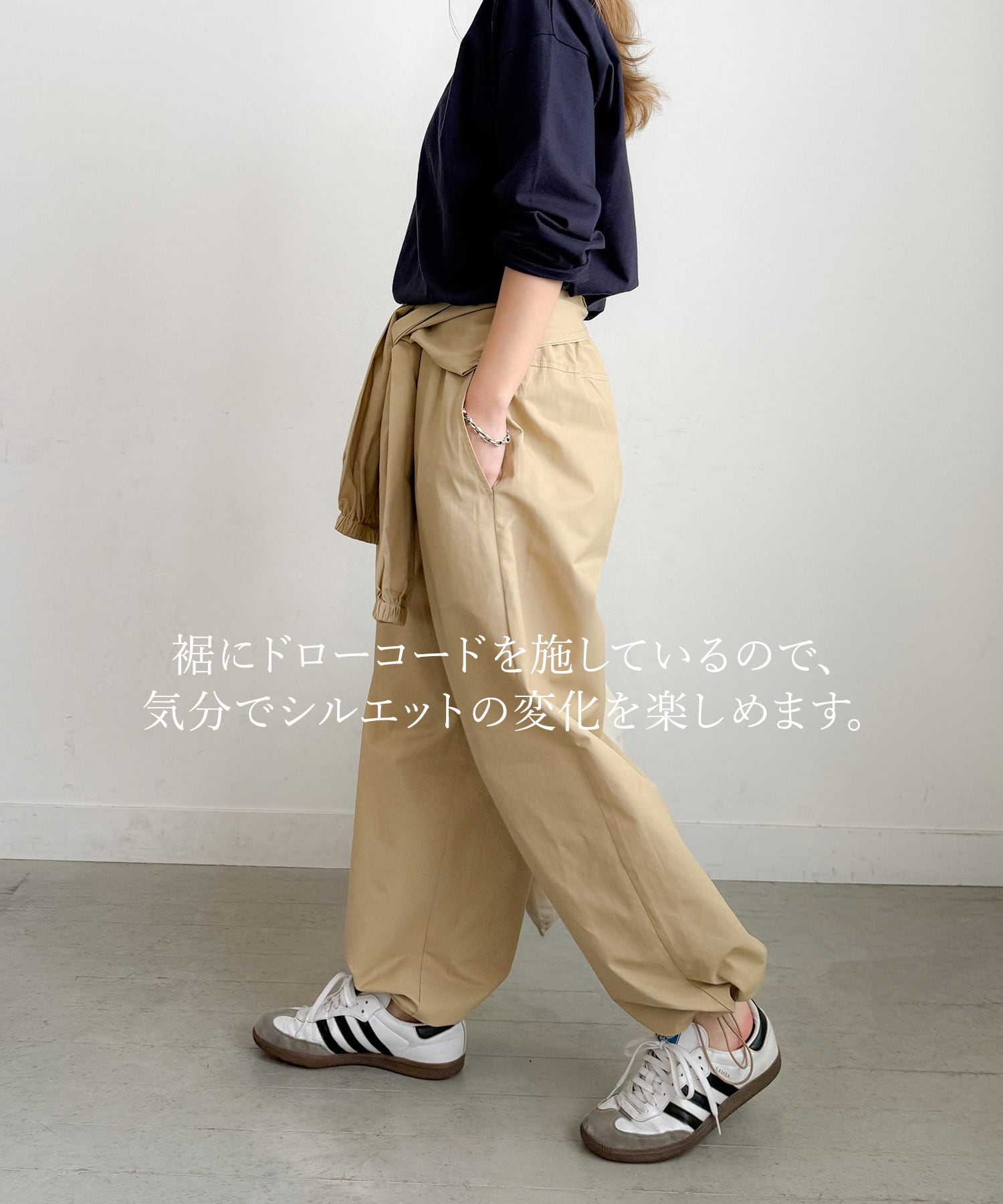 裾にはドローコードを施し、絞ることでシルエットのアレンジも自在。ワイドなストレートラインから、程よく丸みのあるシルエットまで楽しめます。