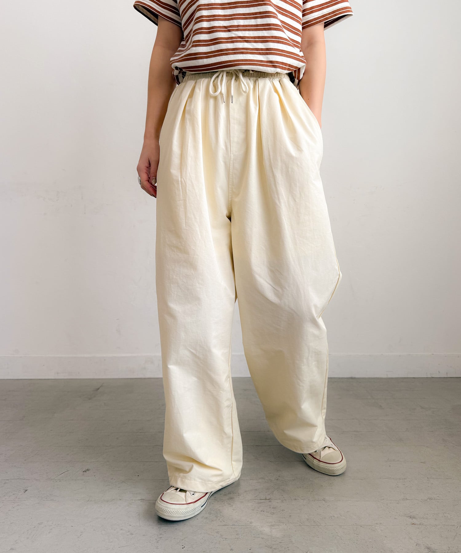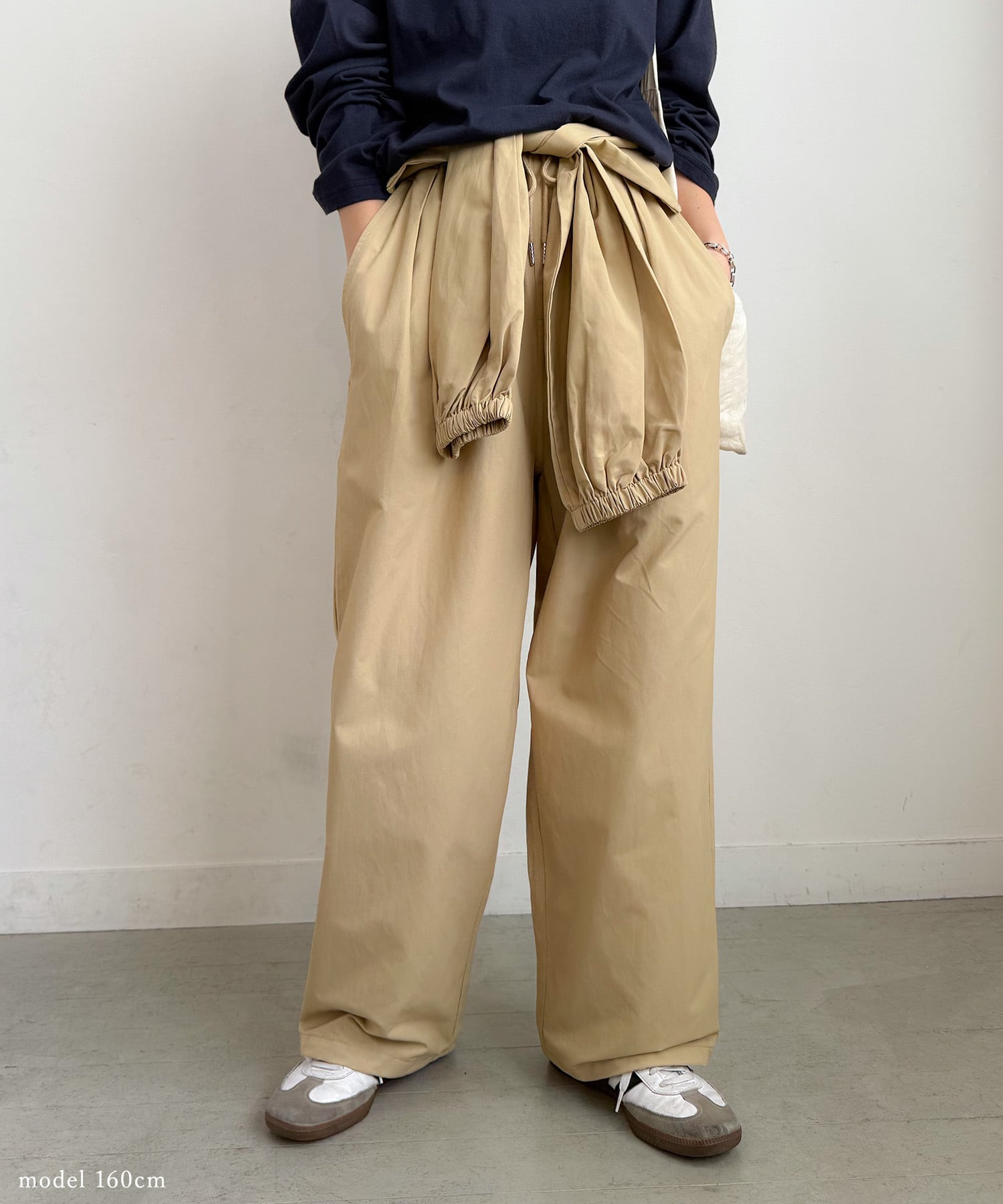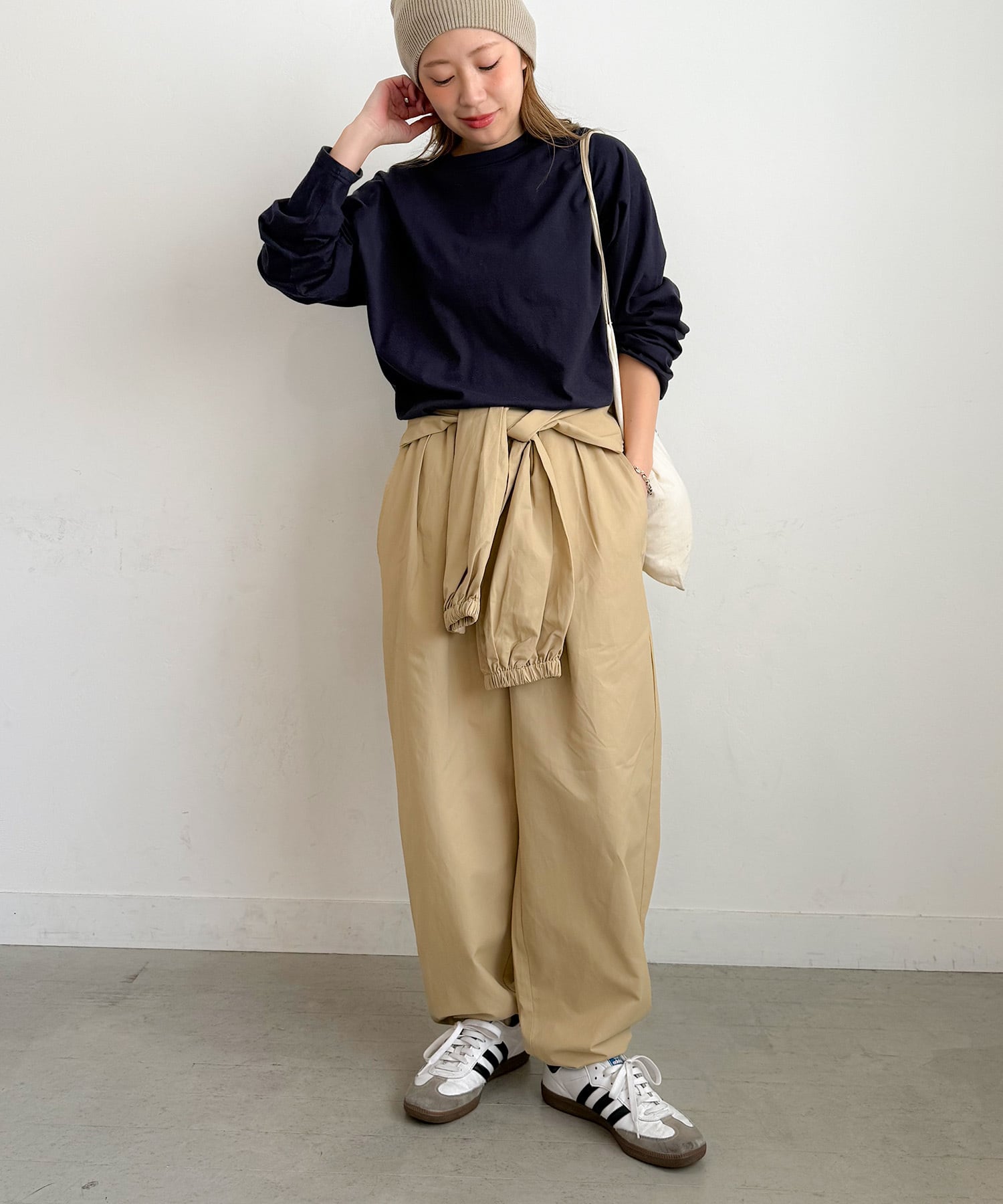 裾にはドローコードを施し、絞ることでシルエットのアレンジも自在。ワイドなストレートラインから、程よく丸みのあるシルエットまで楽しめます。