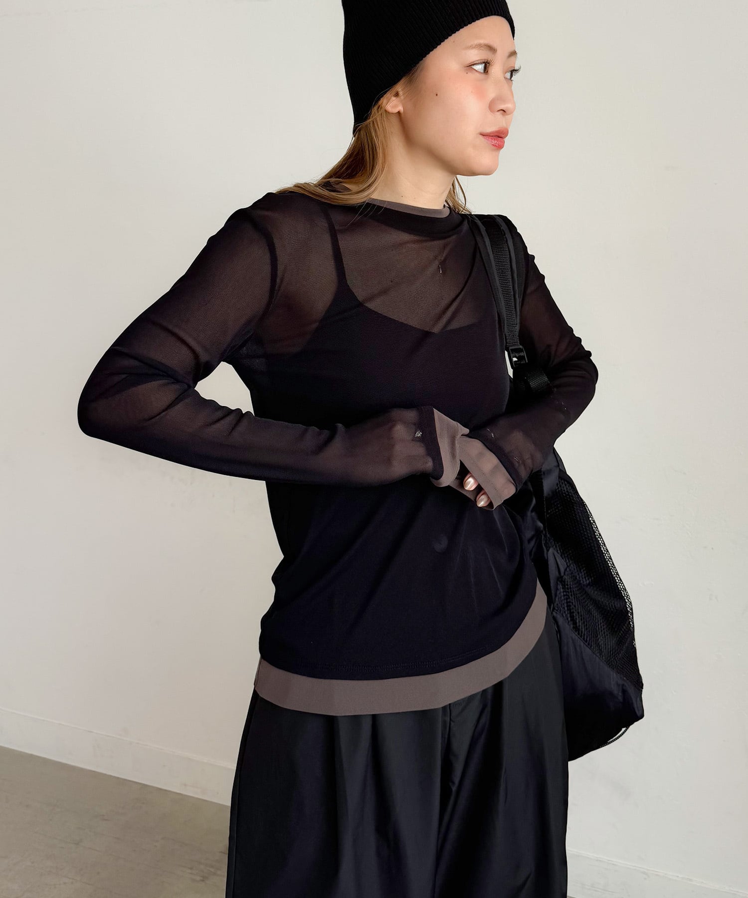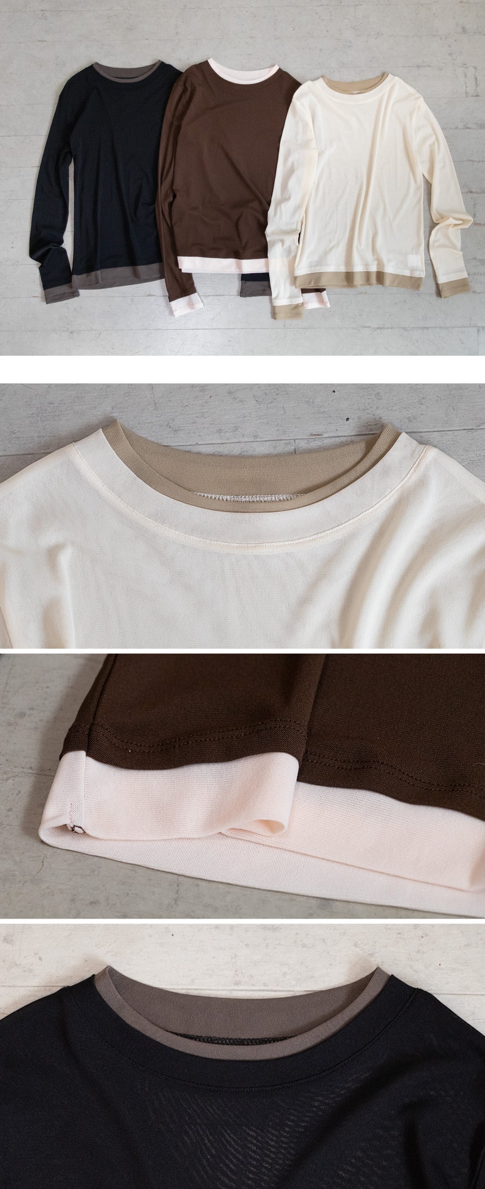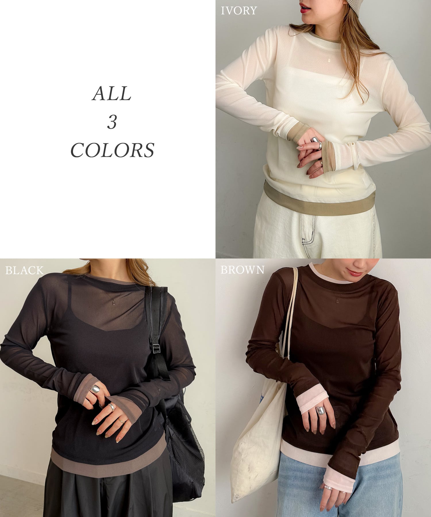 透け感のあるシースルー生地に、配色インナーを重ねたようなレイヤード風デザインが、スタイリングに奥行きをプラスします。伸縮性があり、身体にフィットしすぎないサイズ感でストレスフリーな着心地。一枚で着映えするデザインながら、ジャケットやベストのインナーとしても活躍。袖口や裾から覗く配色がさりげないアクセントになり、シンプルコーデもこなれた印象に仕上がります。