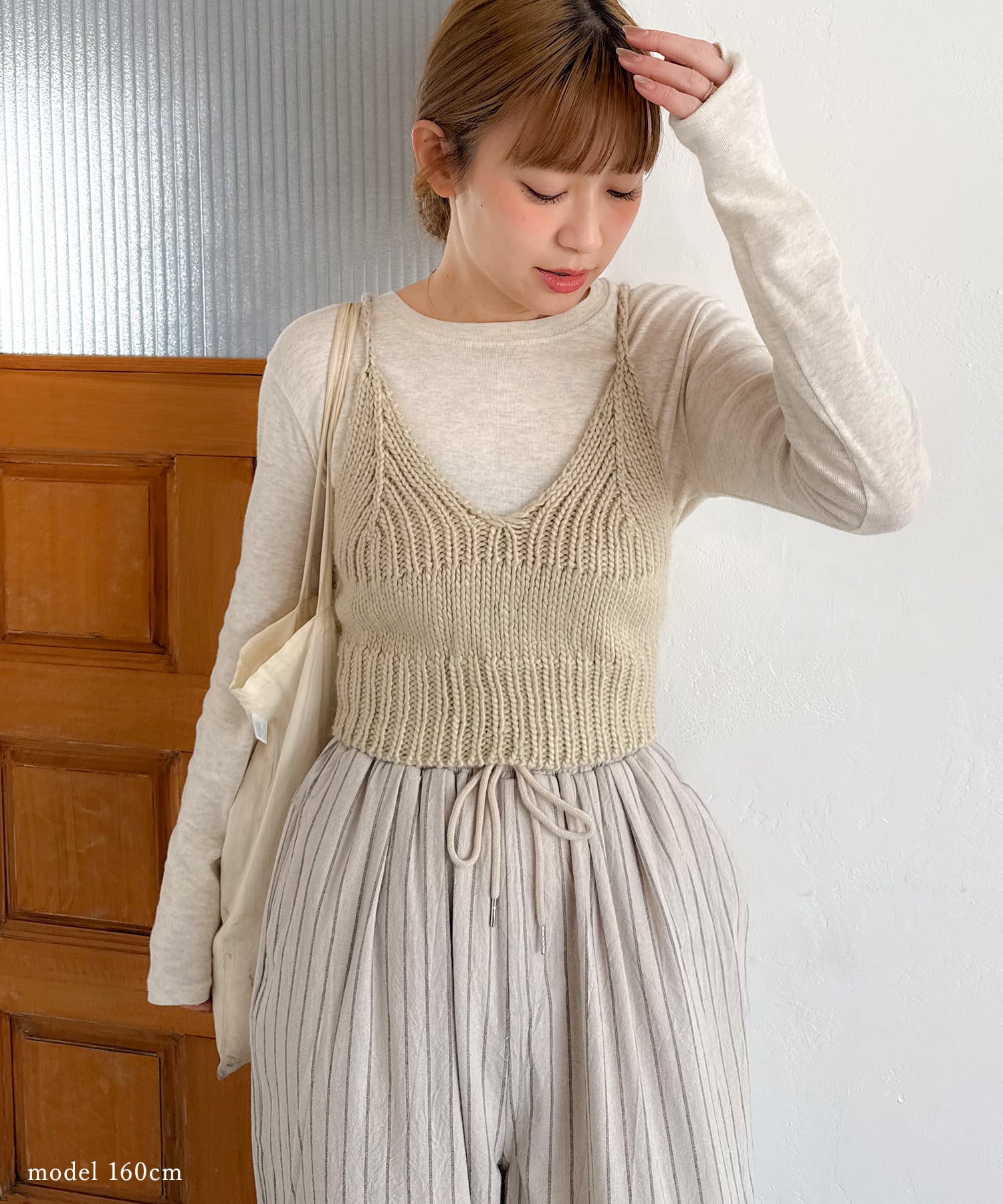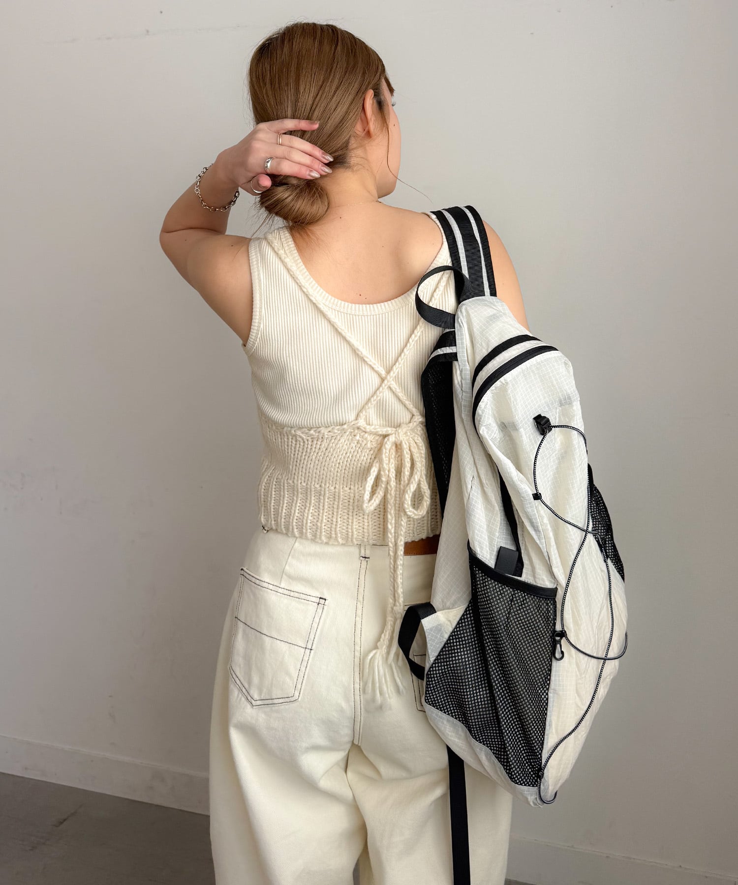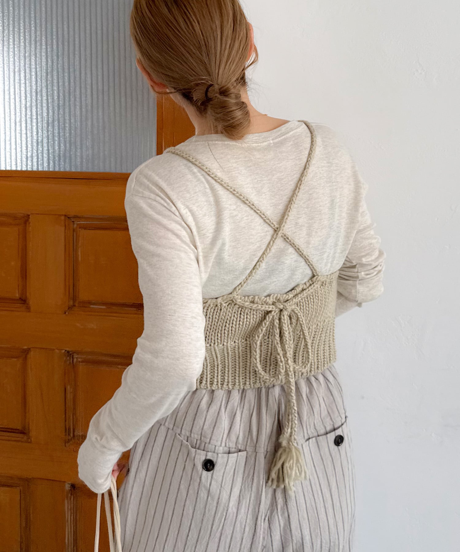 程よく立体感のある編地で、シンプルなインナーに重ねるだけで存在感が出ます。バックスタイルは広めに開いたデザインに、クロスされたストラップがポイント。後ろ姿まで可愛く、紐で結ぶ仕様なのでフィット感の調整も可能です。