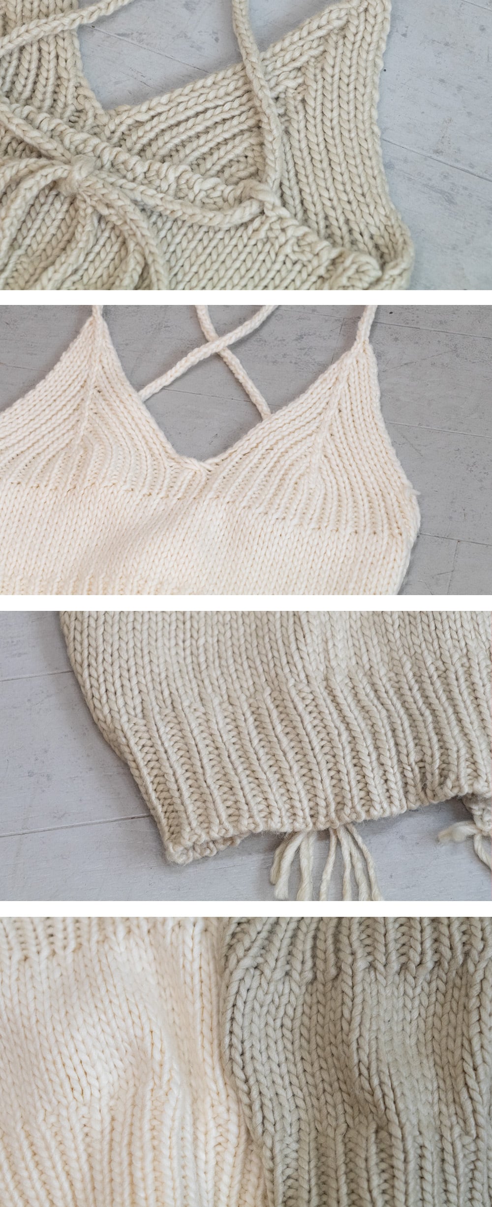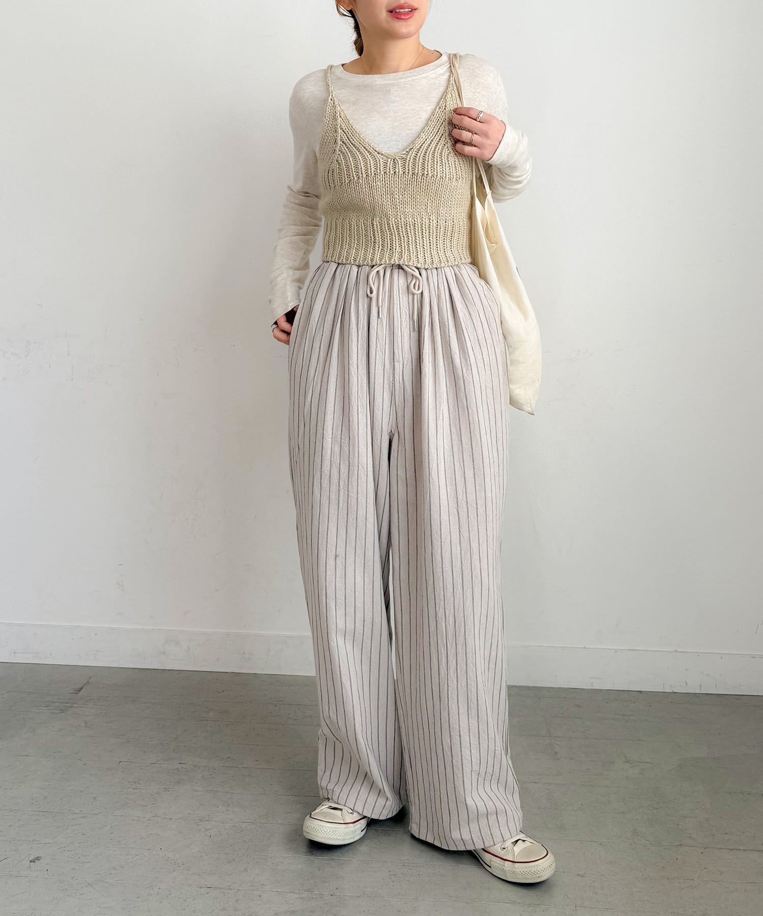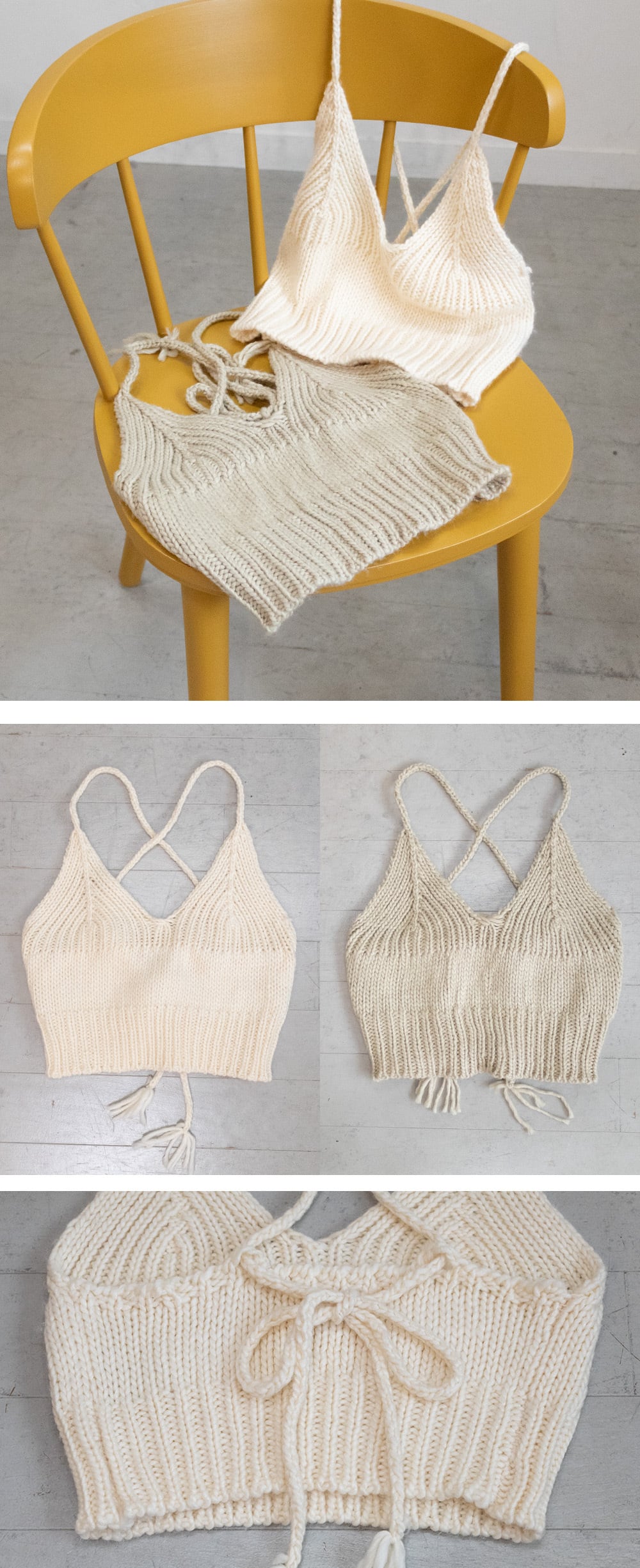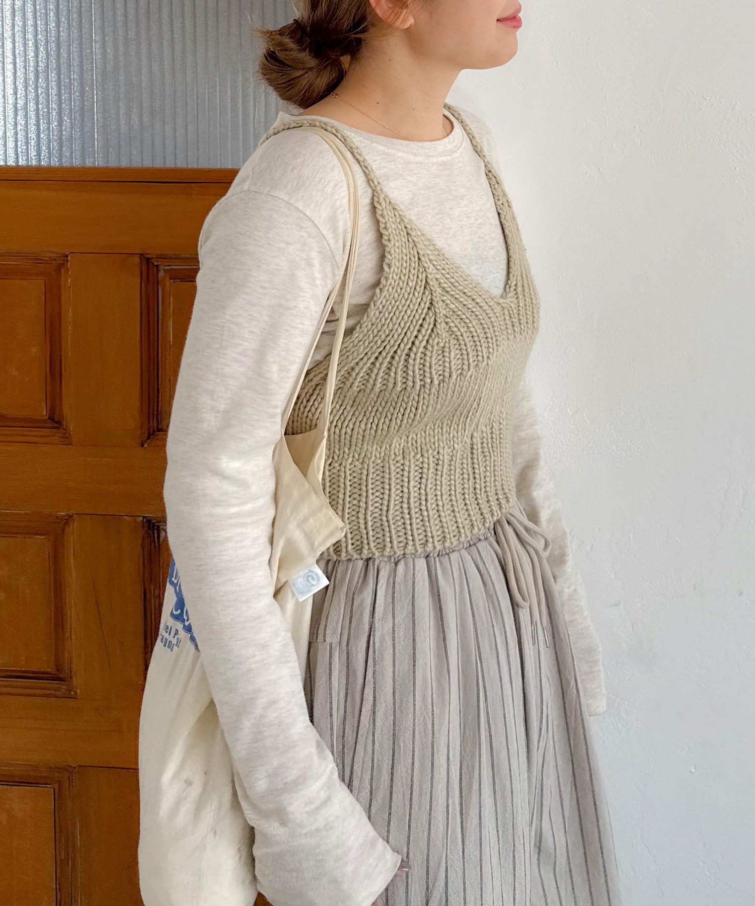 程よく立体感のある編地で、シンプルなインナーに重ねるだけで存在感が出ます。バックスタイルは広めに開いたデザインに、クロスされたストラップがポイント。後ろ姿まで可愛く、紐で結ぶ仕様なのでフィット感の調整も可能です。