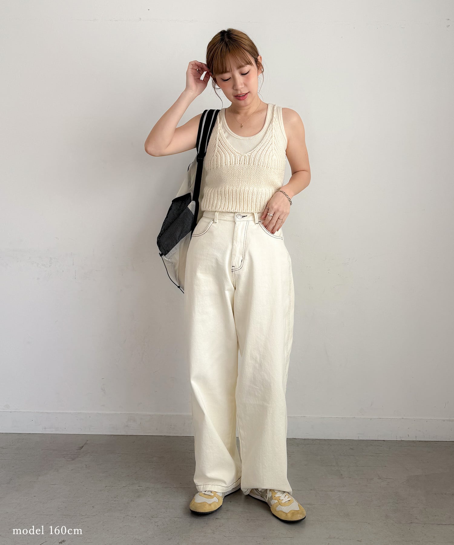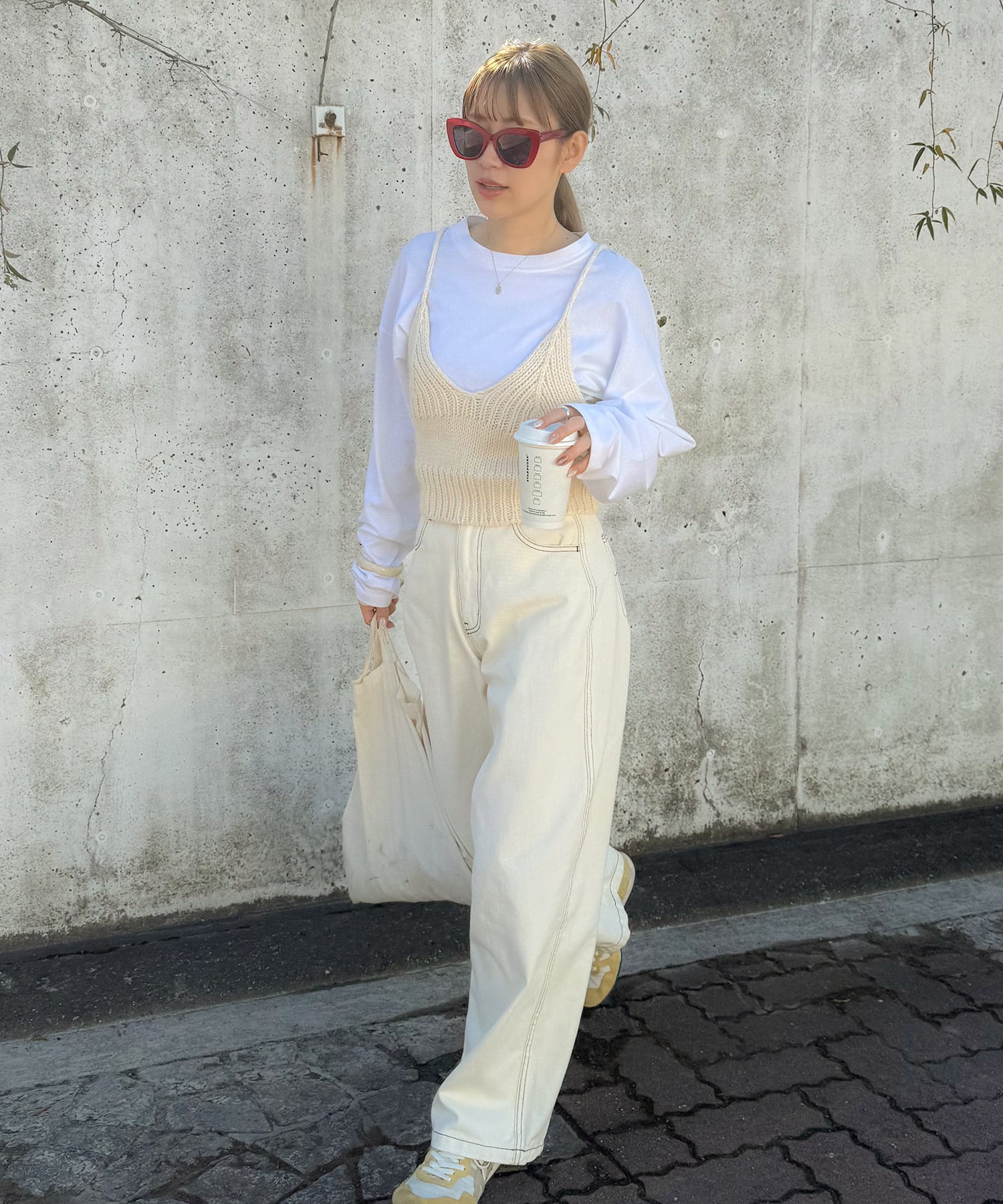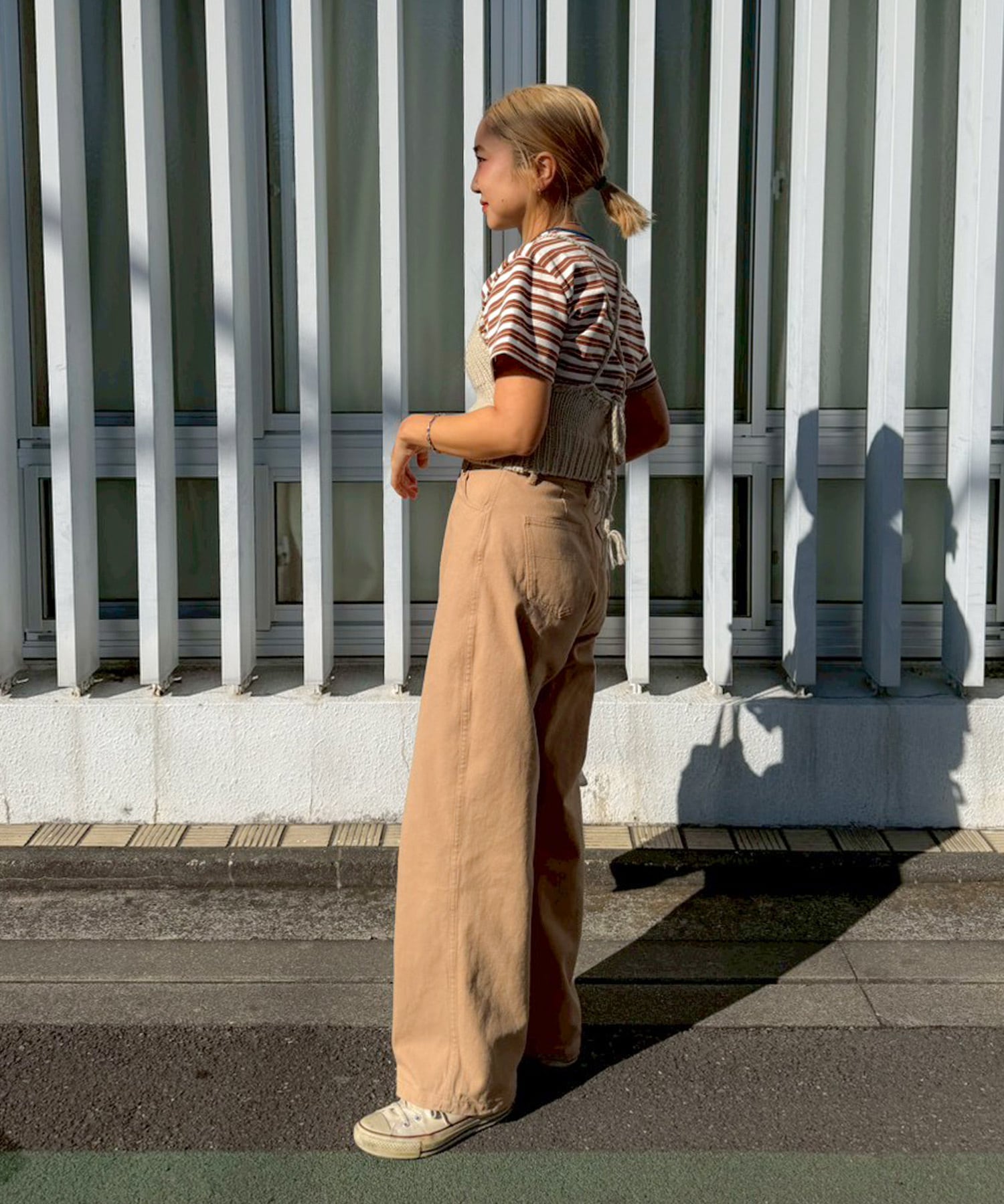 ボトムはワイドデニムやストレートパンツ、スラックスなど、ボリュームのあるパンツと合わせることでビスチェのコンパクトさが引き立ち、スタイルアップも叶います。