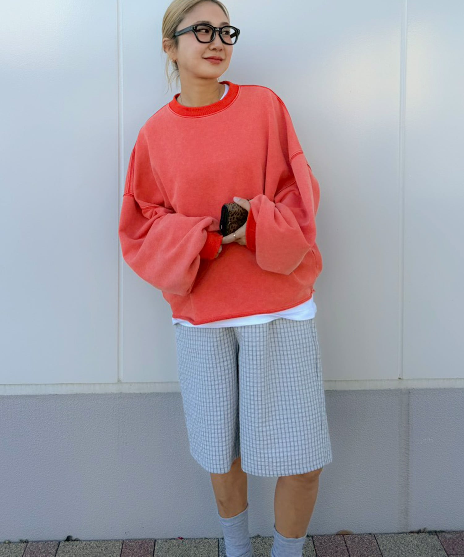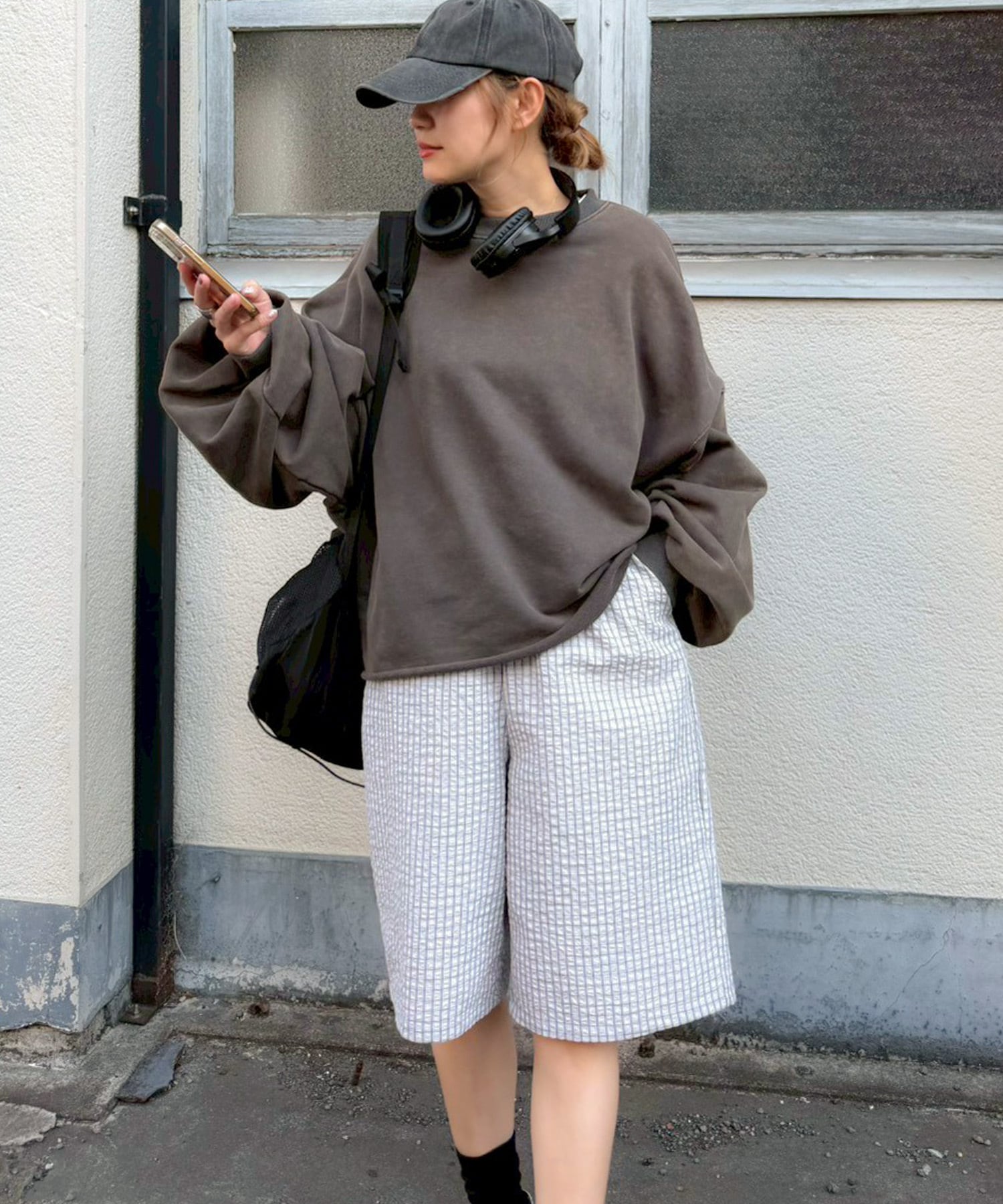 スウェットやオーバートップスと合わせてラフにまとめるのもおすすめです。