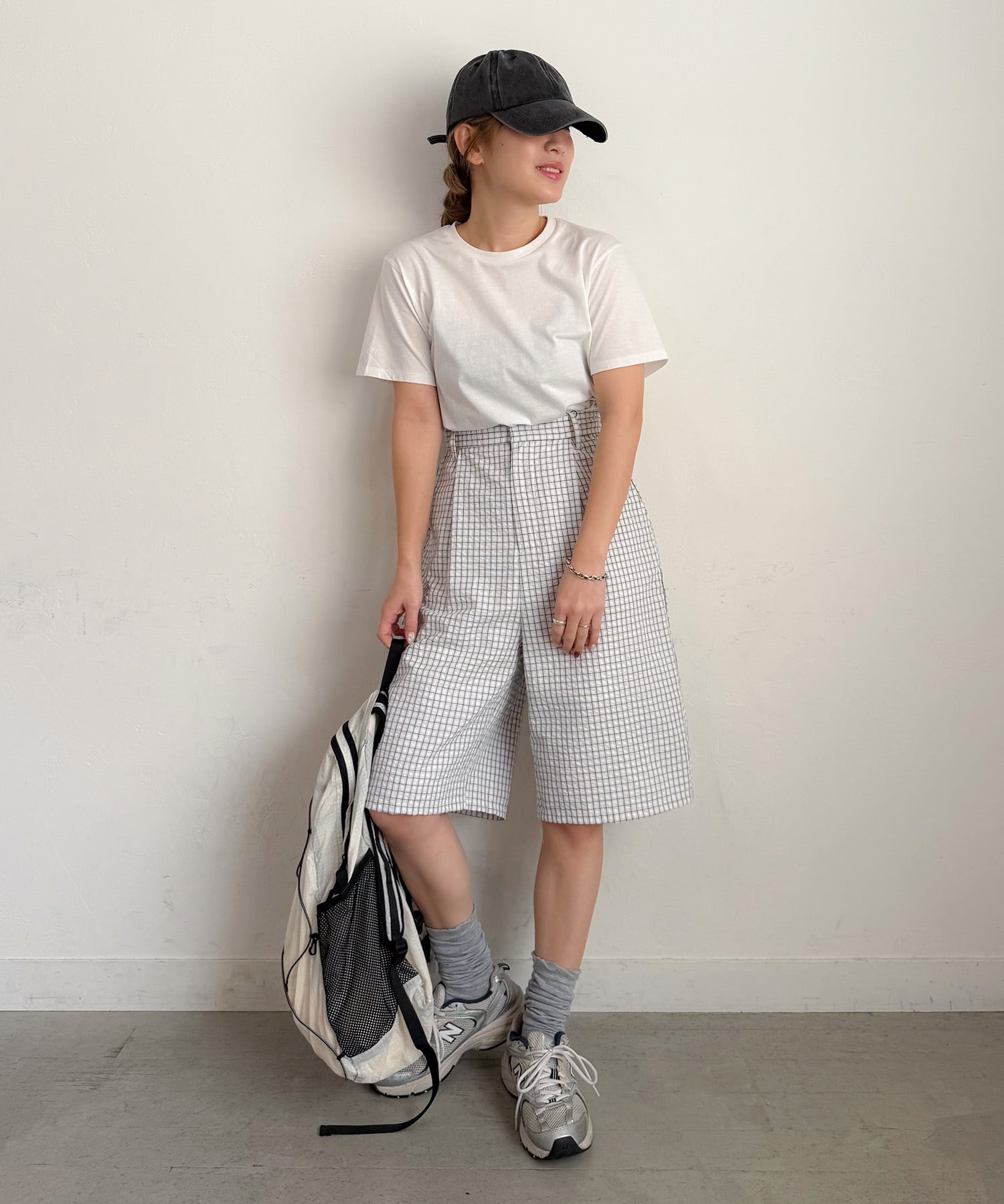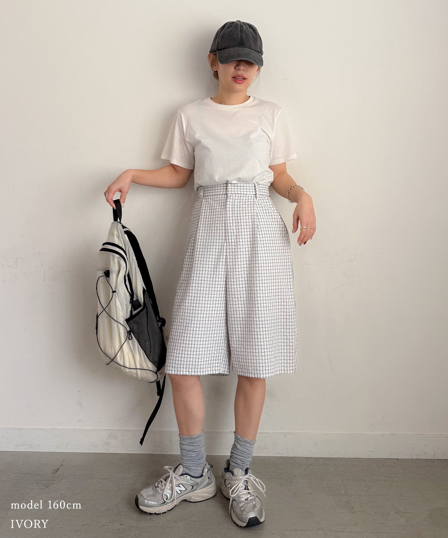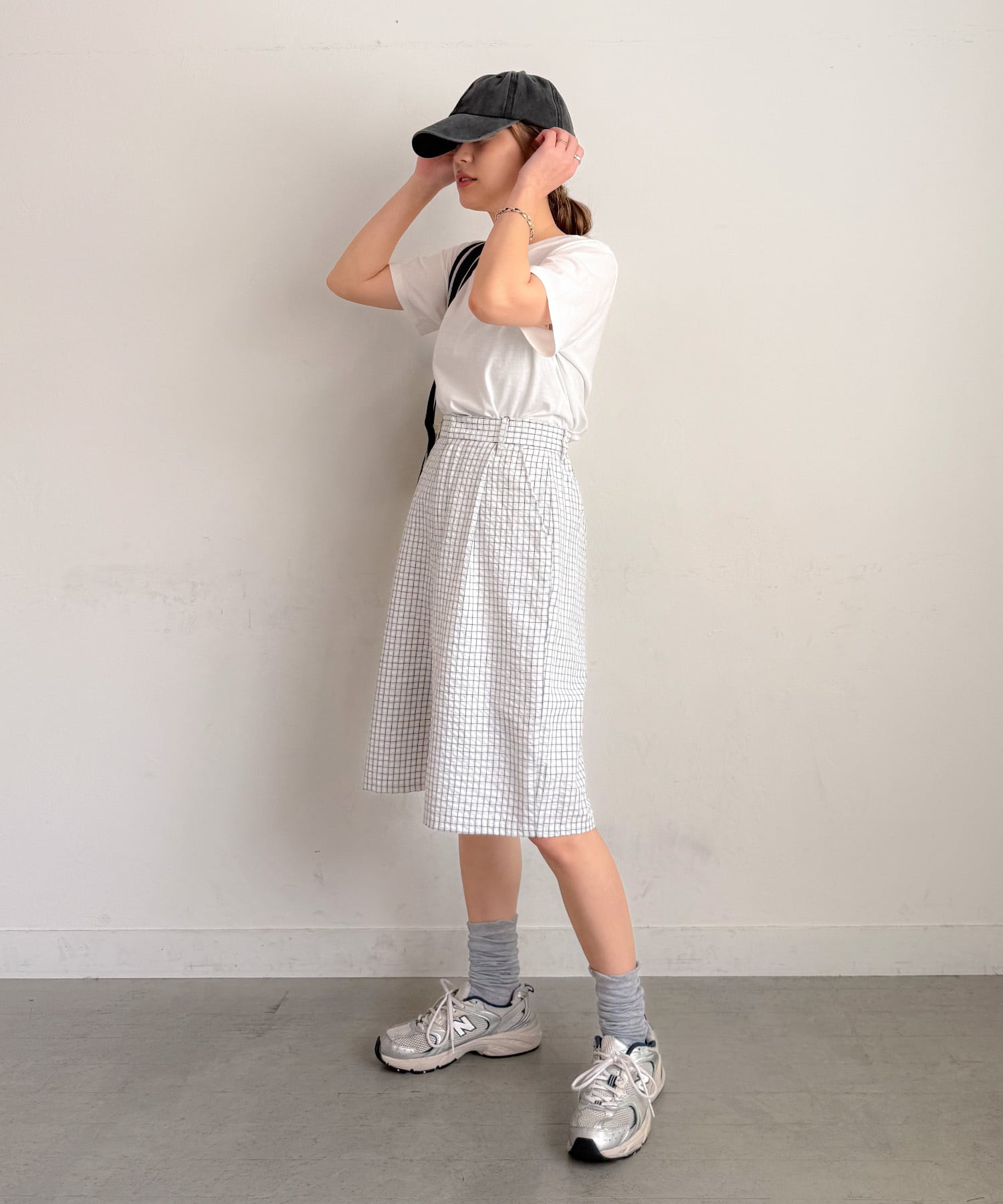 さらっとした肌離れの良い素材感で、暑い季節も快適に着用いただけます。程よくゆとりのあるシルエットと膝丈バランスが、ラフになりすぎず大人っぽい印象に。細かなチェック柄がコーデにさりげないアクセントをプラスしてくれます。