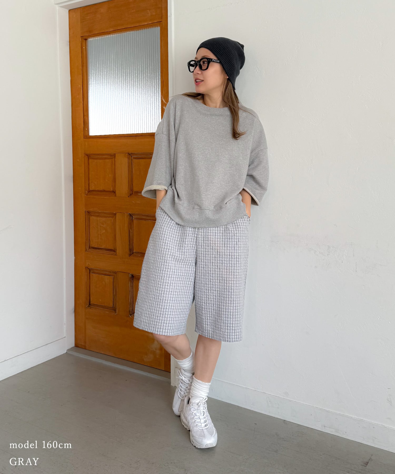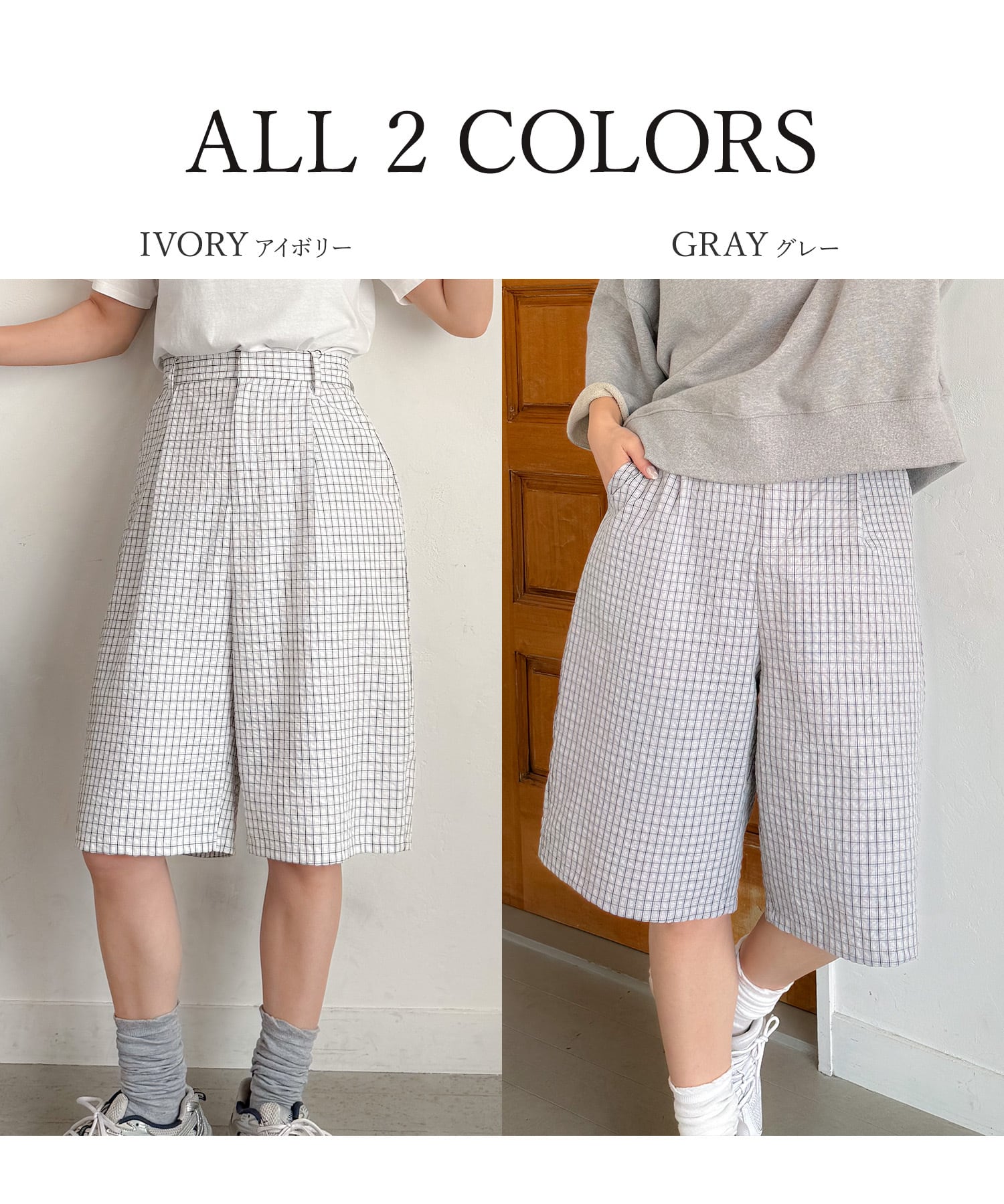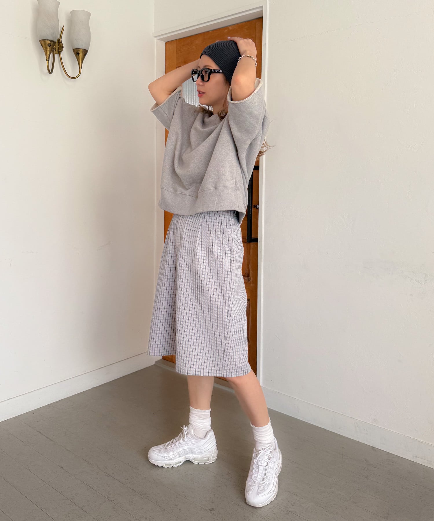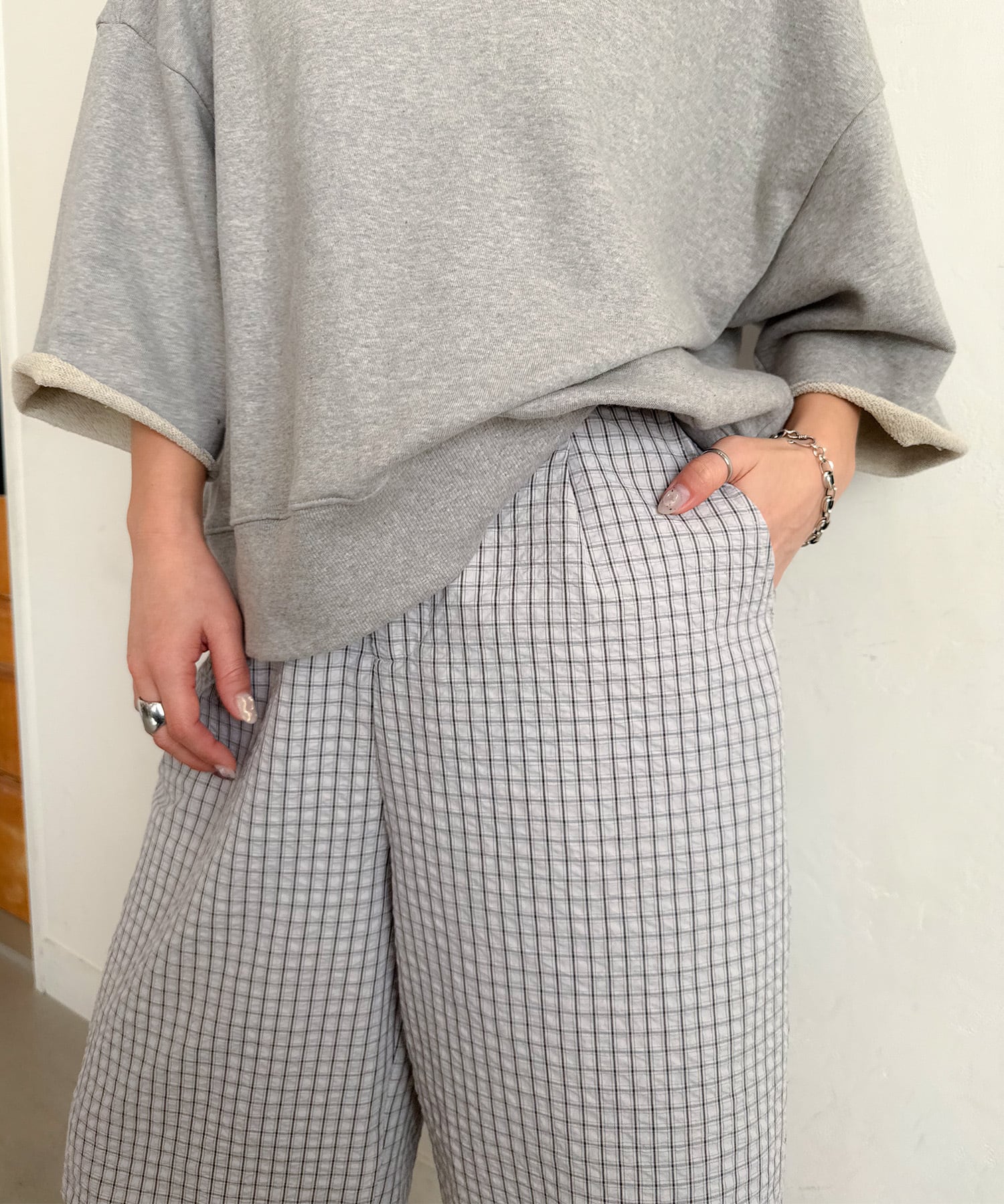 さらっとした肌離れの良い素材感で、暑い季節も快適に着用いただけます。程よくゆとりのあるシルエットと膝丈バランスが、ラフになりすぎず大人っぽい印象に。細かなチェック柄がコーデにさりげないアクセントをプラスしてくれます。