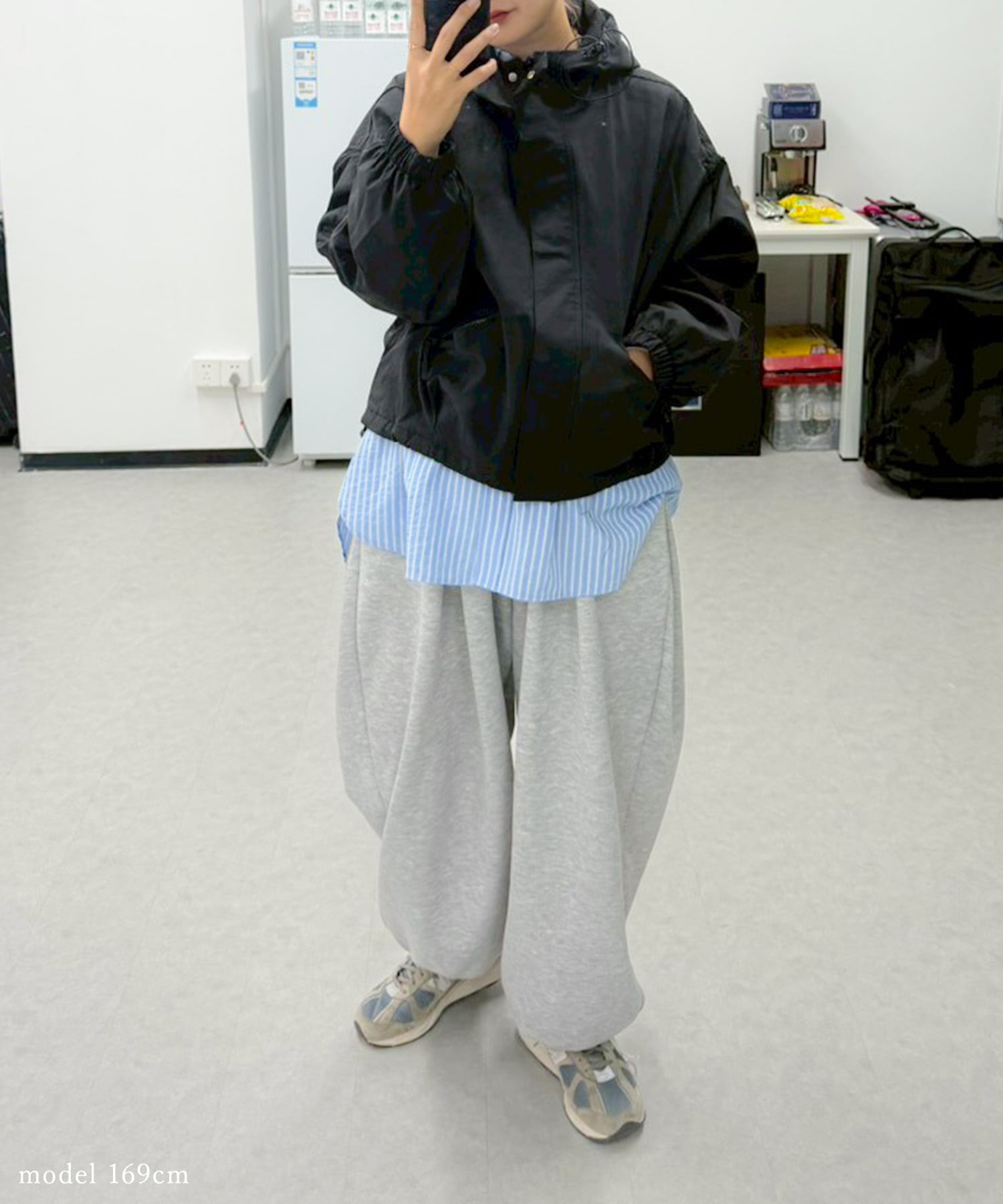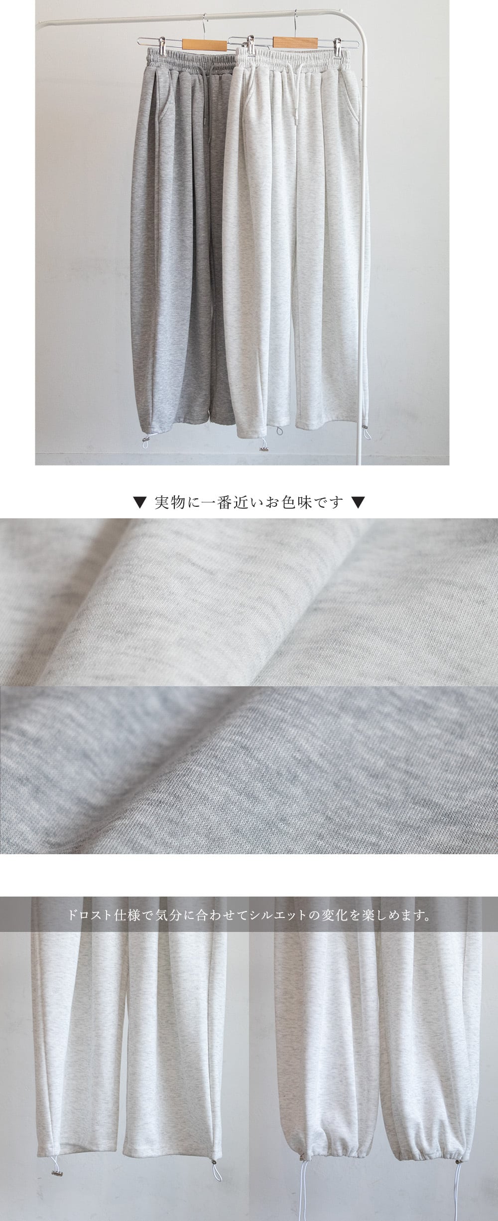 スウェット素材ならではのやわらかさで、リラックス感のある穿き心地。ウエストは総ゴム仕様で、紐でサイズ調整が可能。両サイドにポケット付きで、後ろにもポケットを1つ施し、実用性も兼ね備えています。裾にはドローコードを施し、シルエットの変化も楽しめるデザイン。ぎゅっと絞ってボリュームを出したり、ストレートでラフに着こなしたり、スタイリングの幅が広がります。