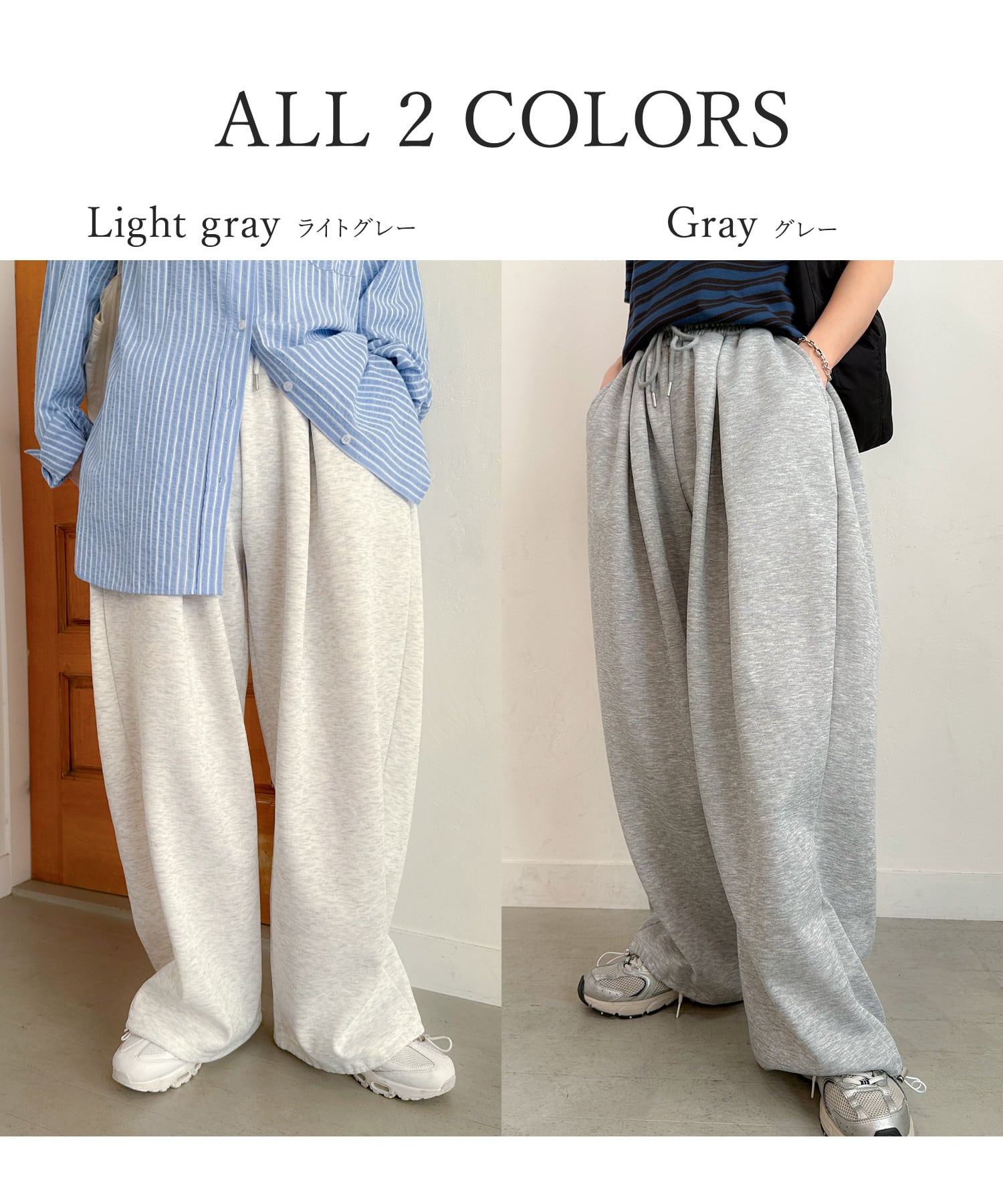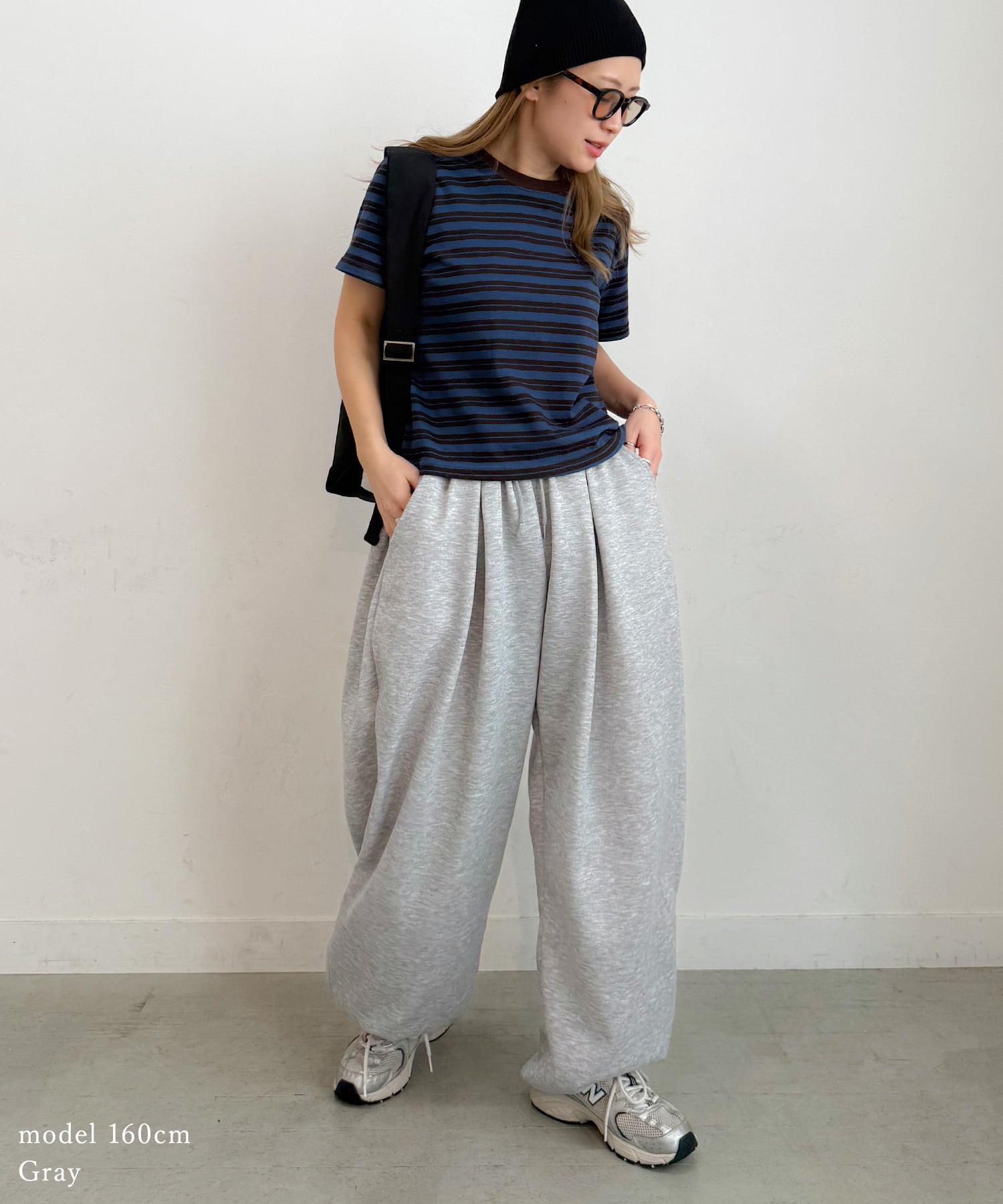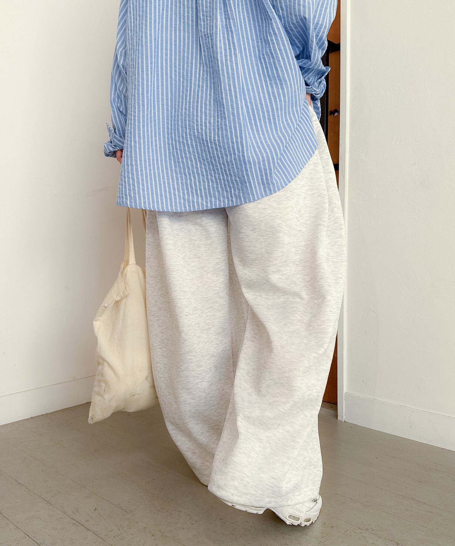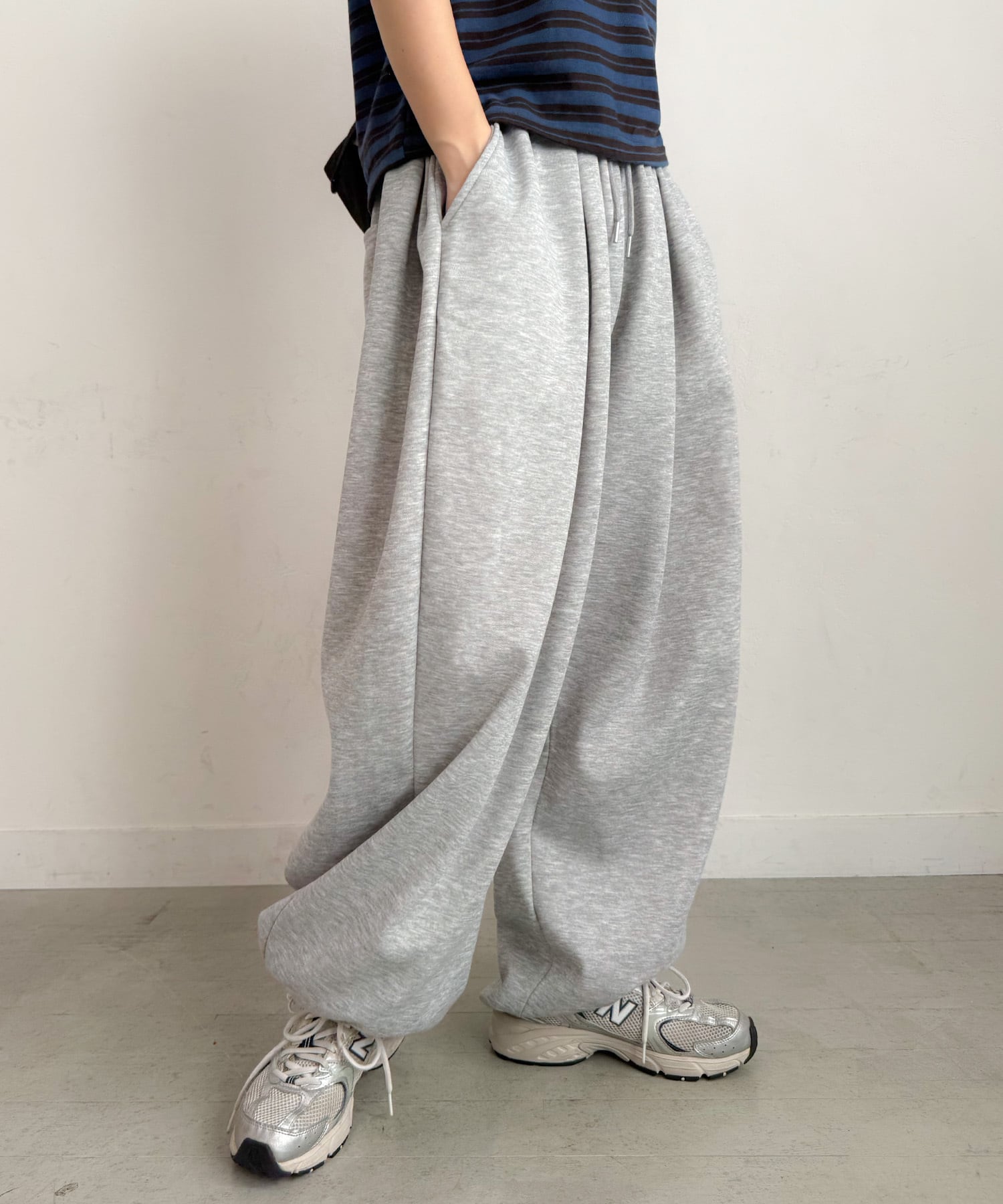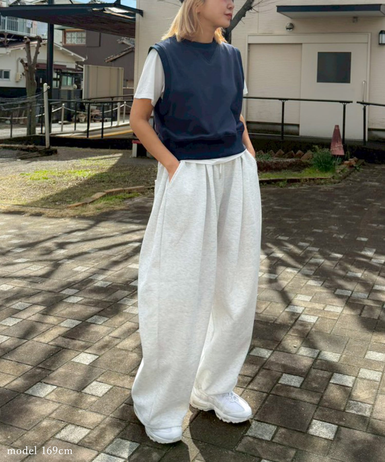 深めに入れたタックが生み出す、立体的でゆとりのあるシルエットが魅力のワイドスウェットパンツ。