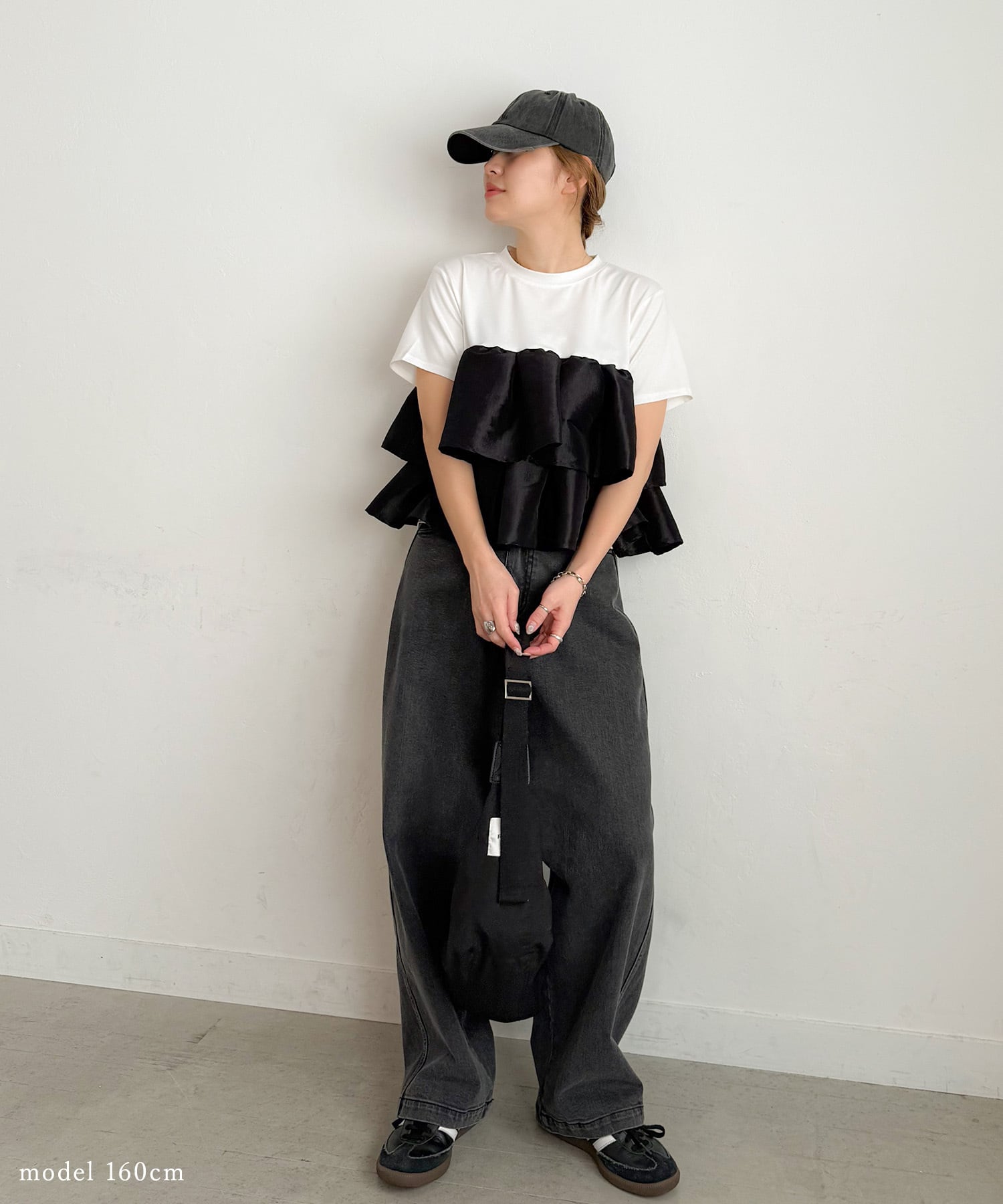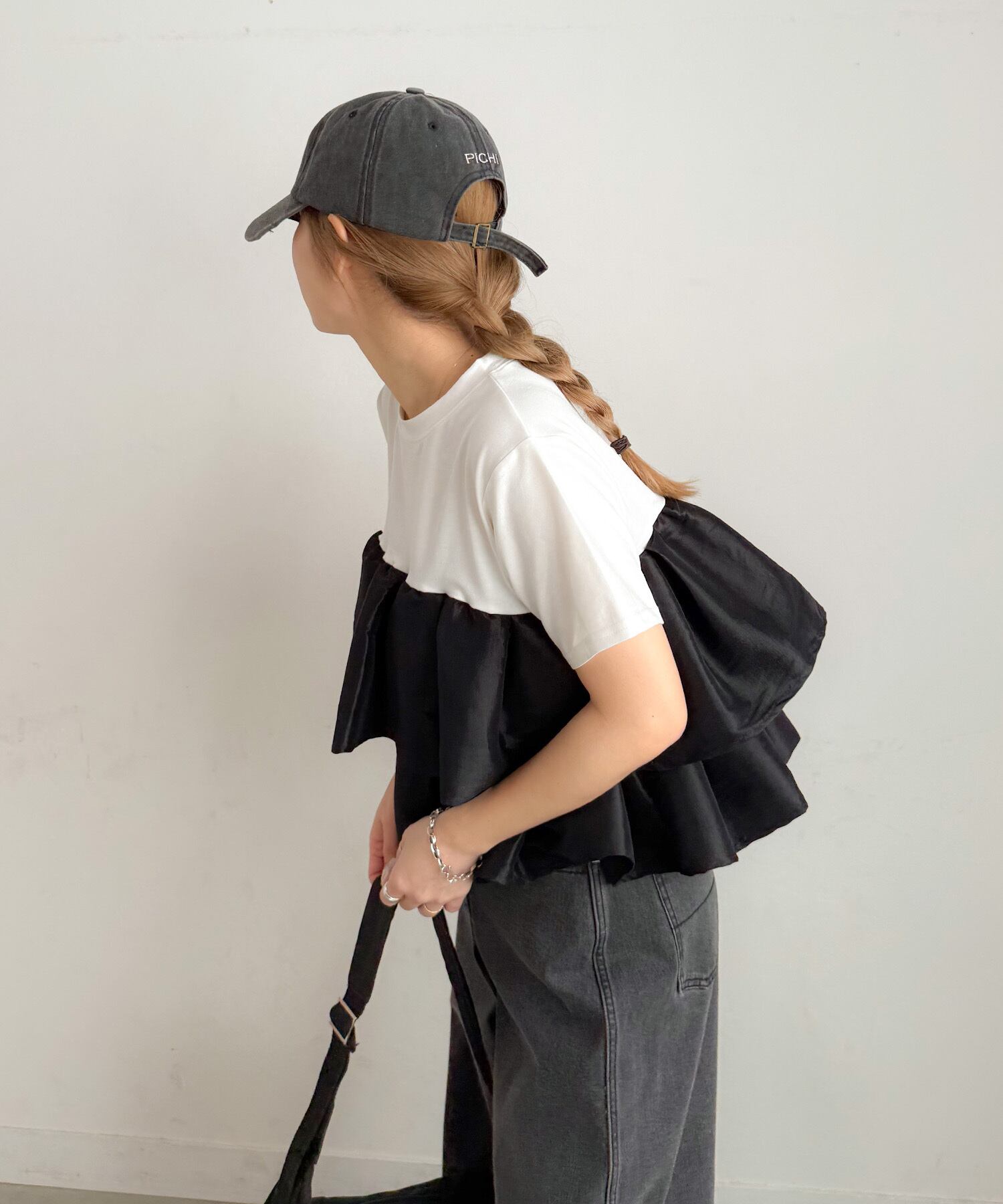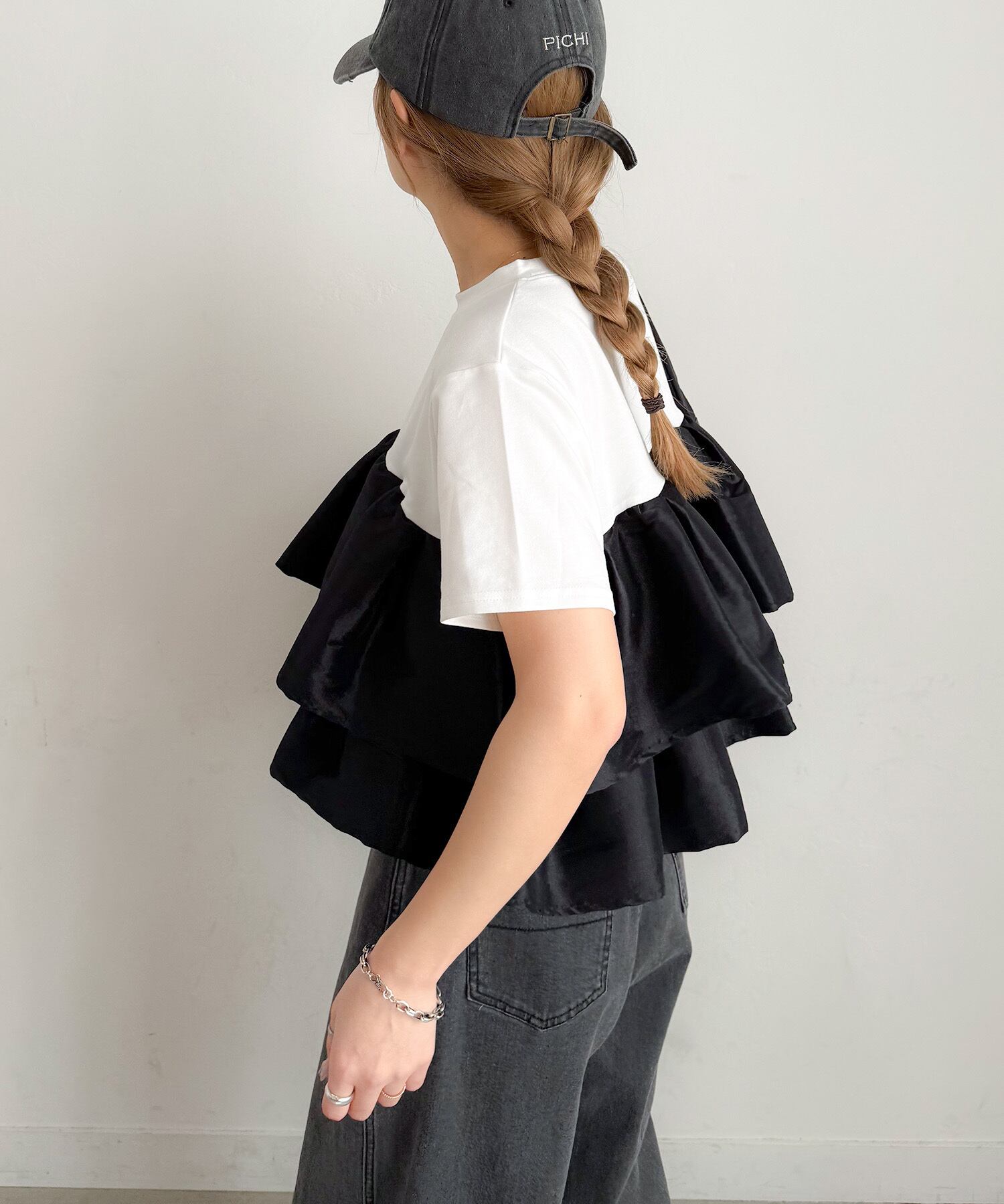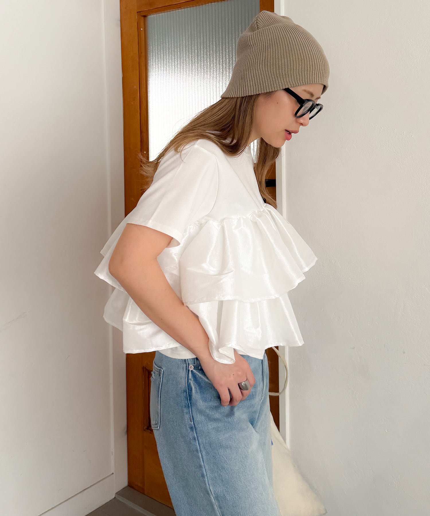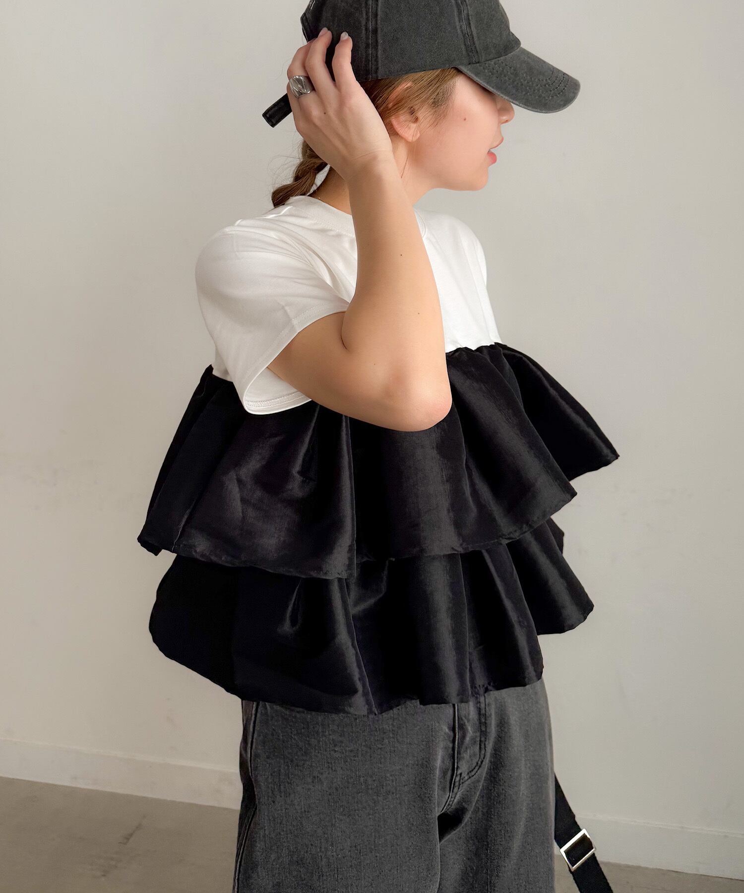 シンプルなTシャツに、立体的なフリルをドッキングした主役トップス。