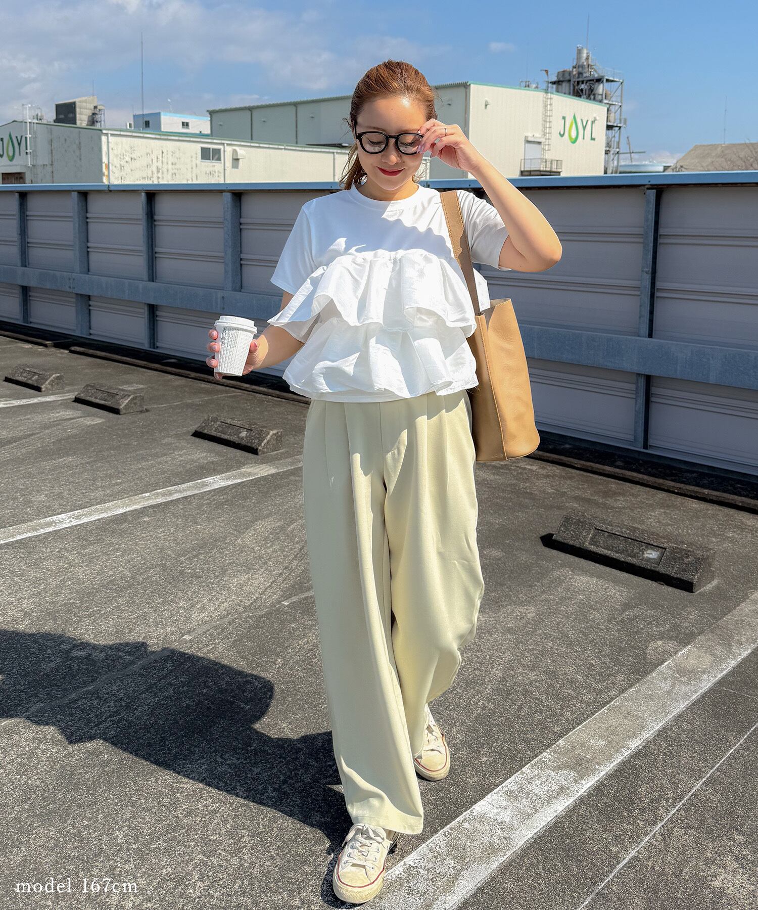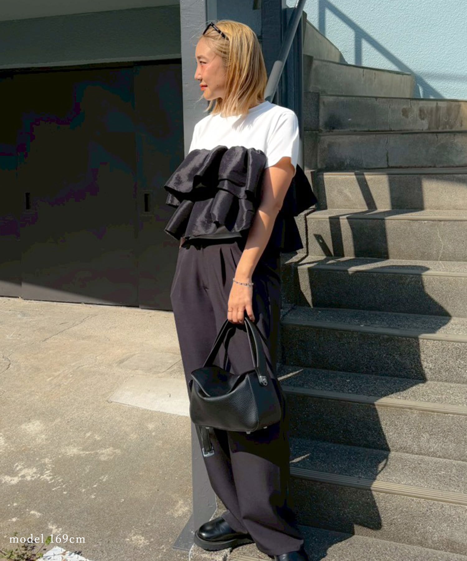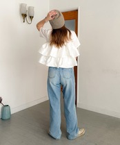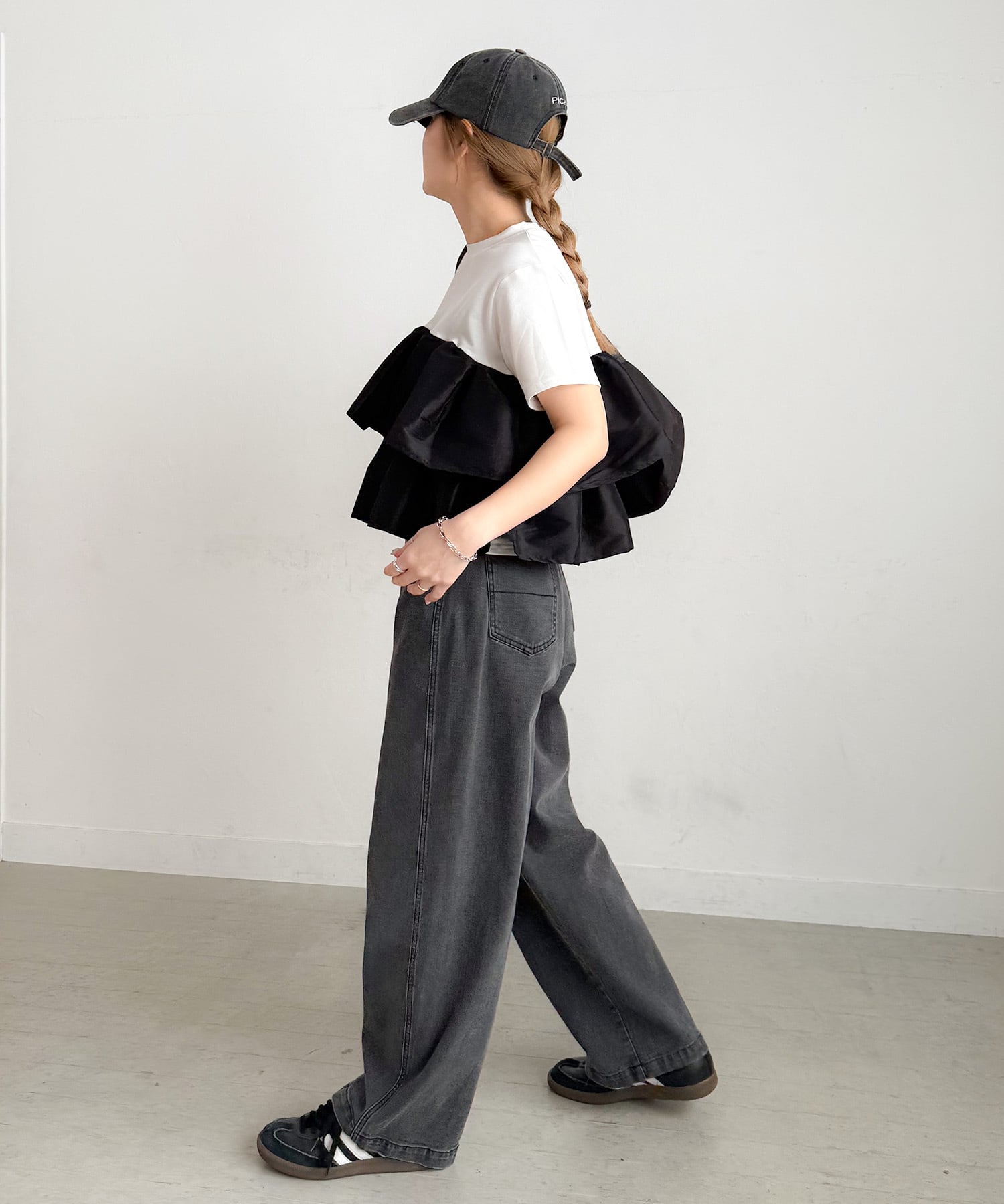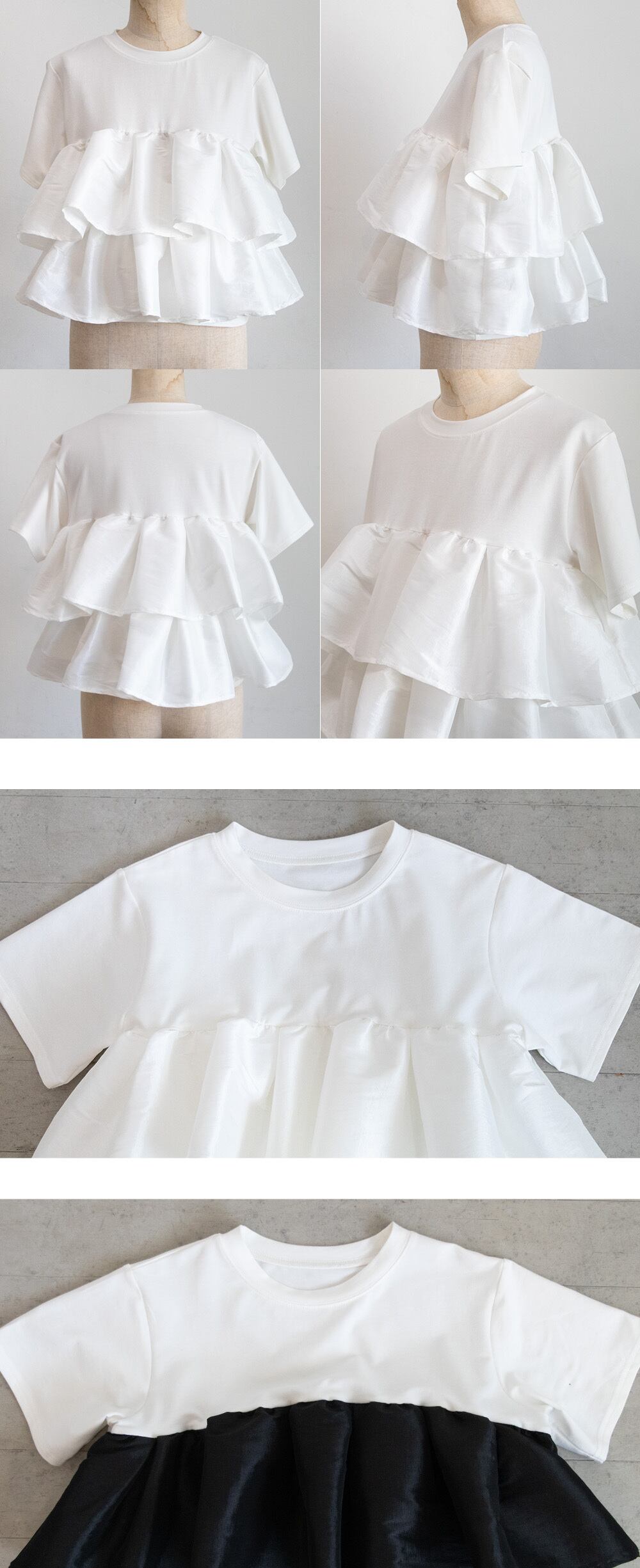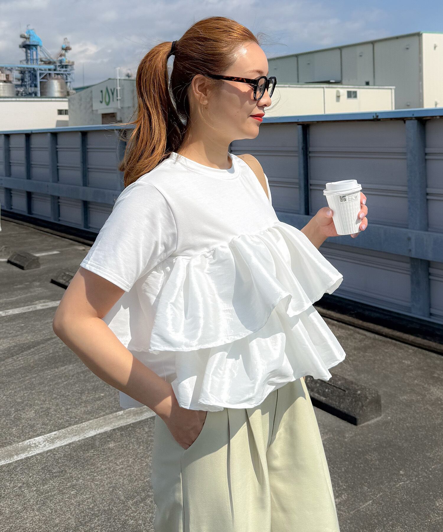 シンプルなTシャツに、立体的なフリルをドッキングした主役トップス。
