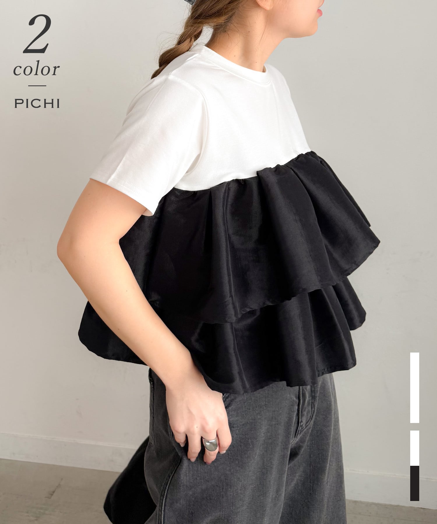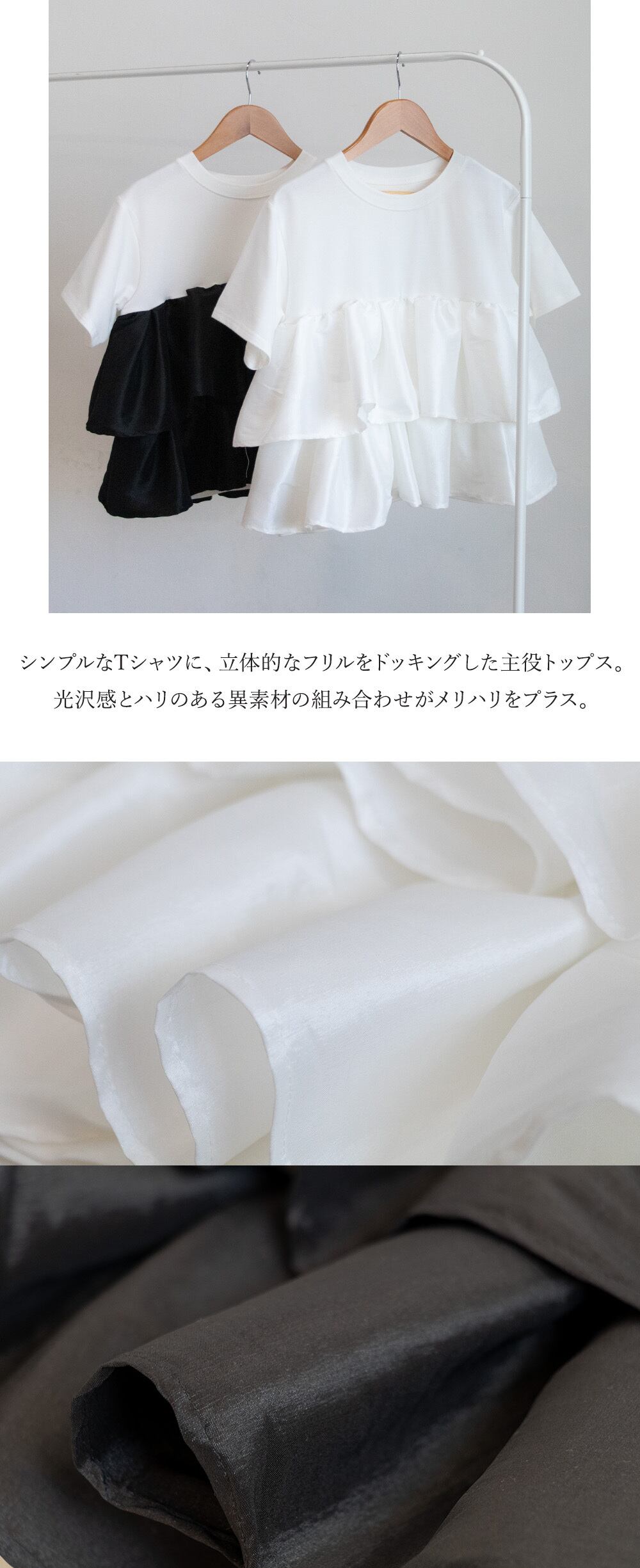 ボリューム感のあるフリルが動きに合わせて揺れ、1枚でコーデを華やかに仕上げてくれます。身頃は伸縮性抜群のすっきりとしたTシャツで着心地がよく、異素材の組み合わせがメリハリのあるシルエットを演出。デニムなどのカジュアルアイテムと合わせるだけで、こなれたバランスに仕上がるのもポイントです。