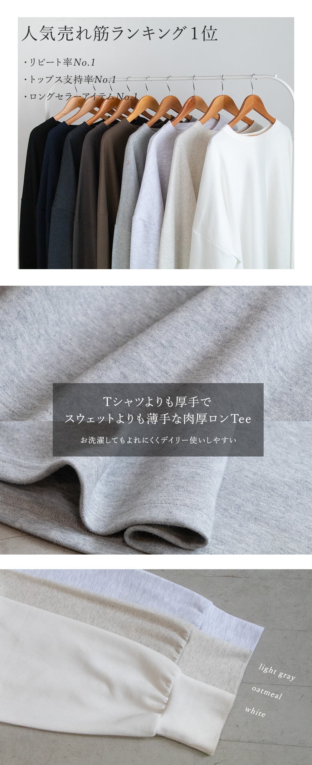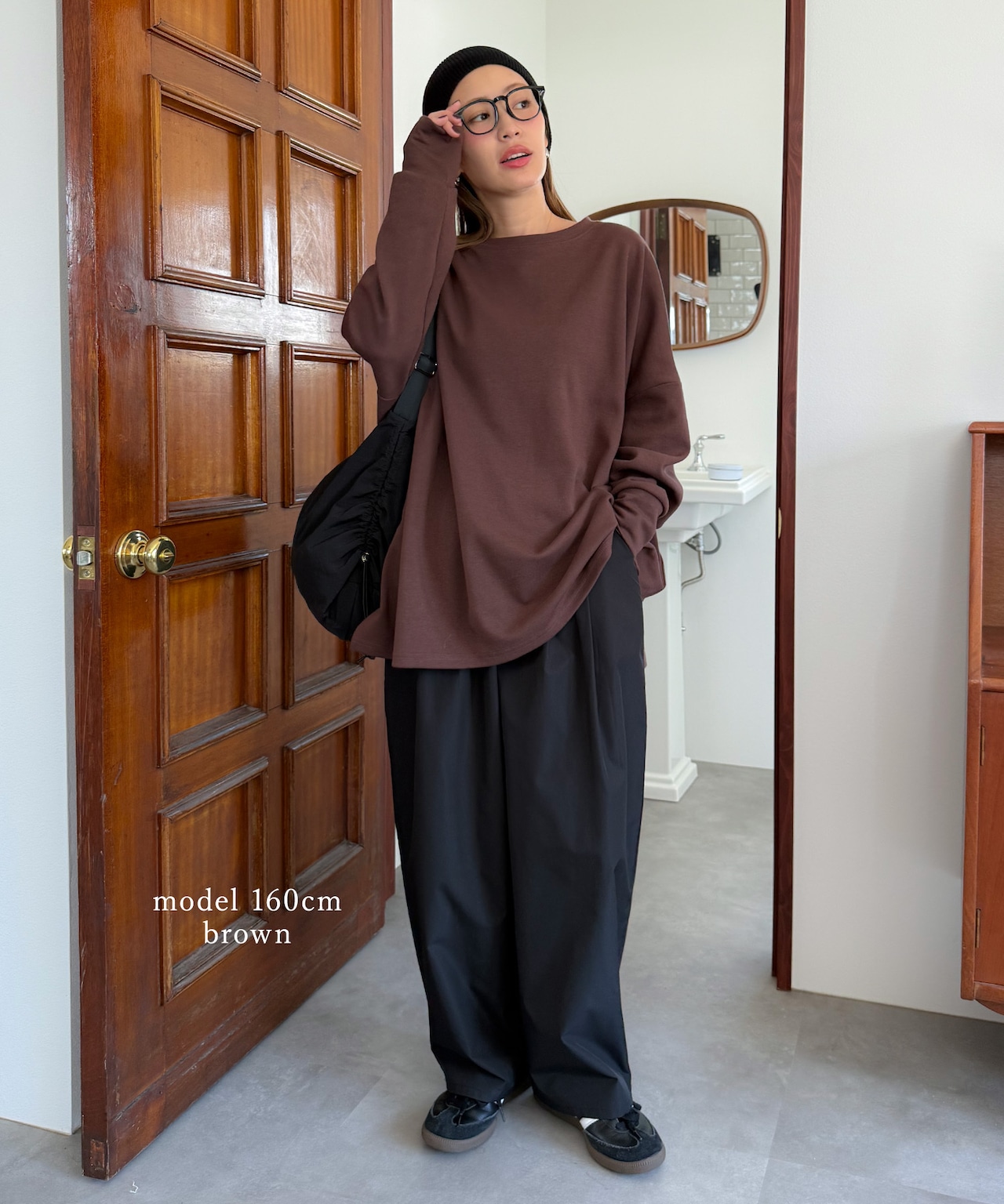 リラックス感がありながらもボディラインをしっかりカバーしてくれるので、デイリー使いしたくなる一着。Tシャツより肉厚でしっかりとした生地を使用しているので、お洗濯してもヨレにくいのが嬉しいポイント。ルーズに1枚で着るのはもちろん、冬はニットなどのインナーにもぴったり。1枚は持っておきたい着回し力抜群の肉厚ロンTeeです。