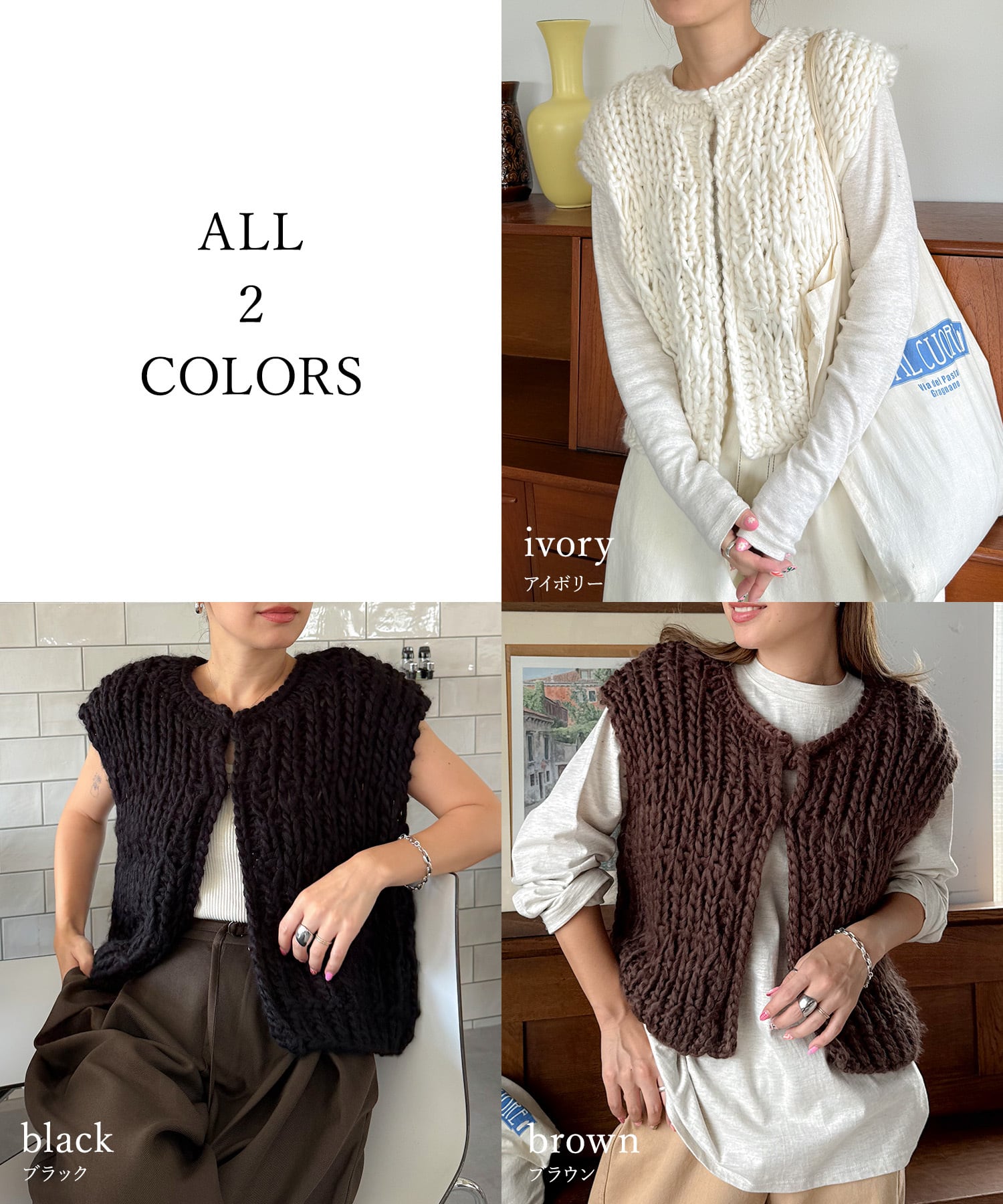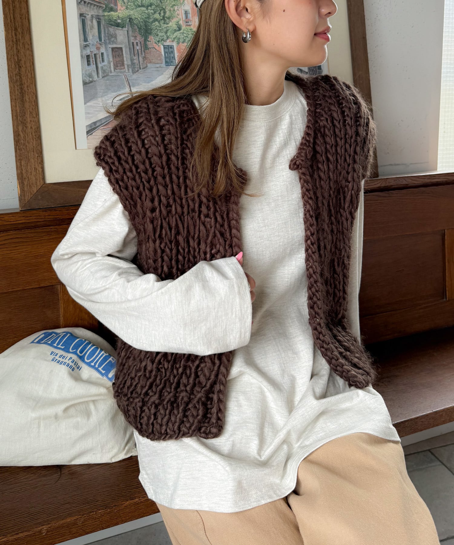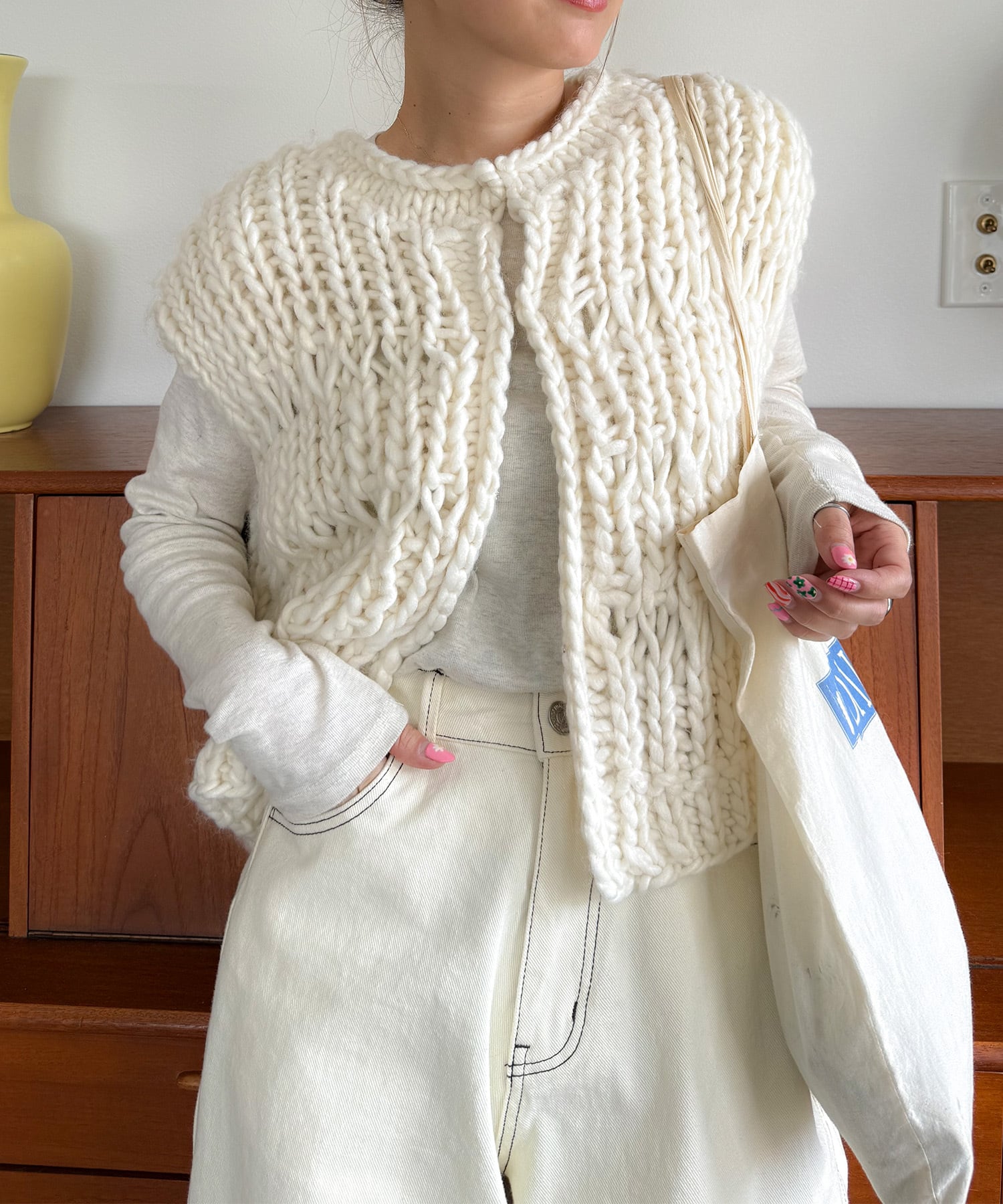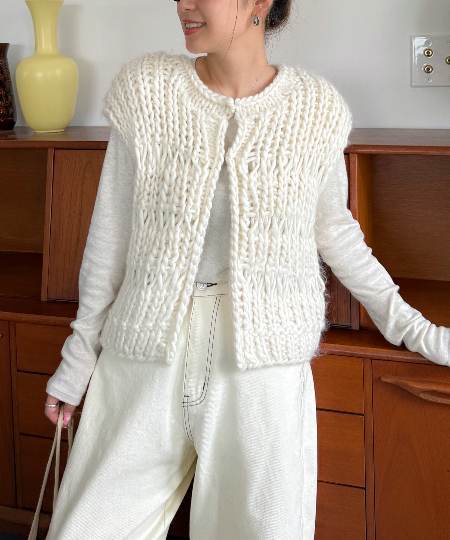 もっちりとした生地で柔らかく、太めの糸を使ったボリュームのある編み目がシンプルながらも存在感を放ちます。フロント部分はホック仕様になっていてホックを閉めてトップスとしての着用はもちろん、ホックを開けてジレとしても着用可能。