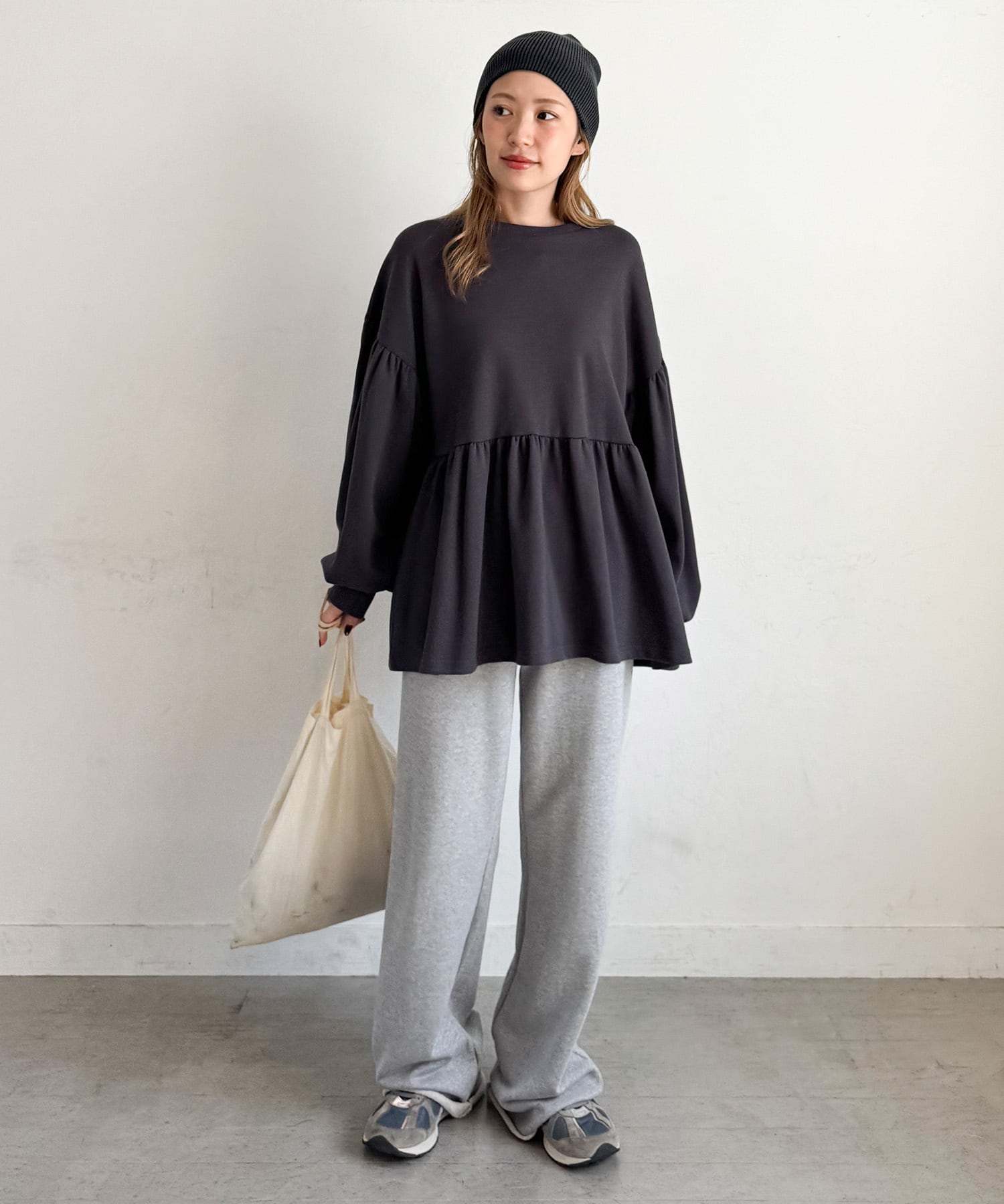 ボリュームがありながらも、ドロップショルダーで顔まわりはスッキリとした印象に。ウエスト部分の切り替えや、スリーブにはたっぷりギャザーを入れ込み、ふわりと広がるこだわりのデザイン。 手首の部分はほどよくきゅっと絞り袖にボリューム感を。ズレてこないのも嬉しいポイント◎ お尻が隠れる丈にゆったりとしたサイズ感で、気になる部分をしっかりカバーしてくれます。