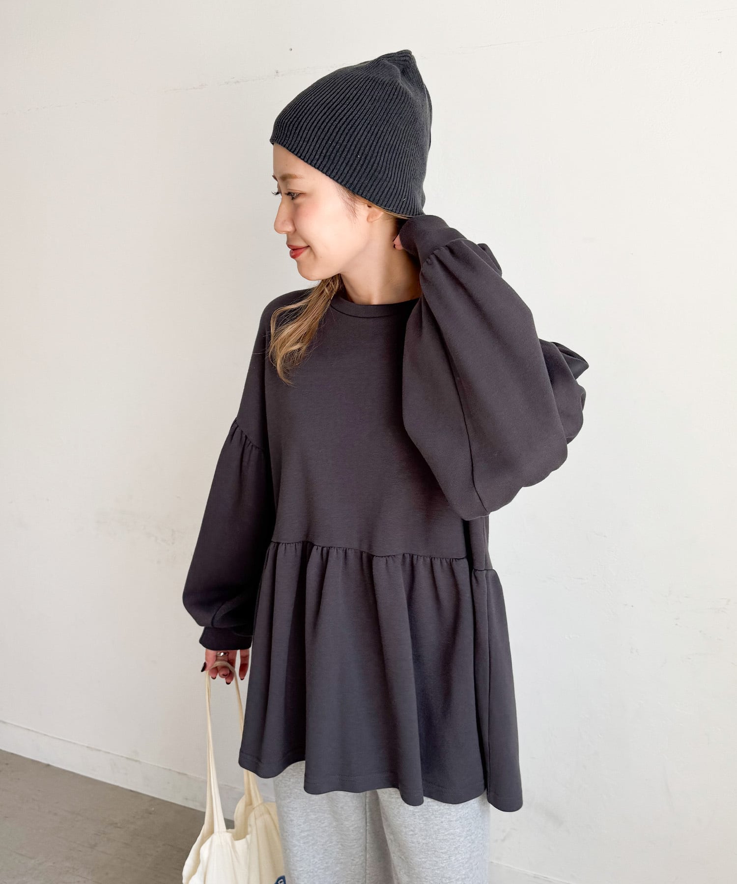 切り替えギャザーでふんわり大人可愛い印象のペプラムボリュームチュニック 。